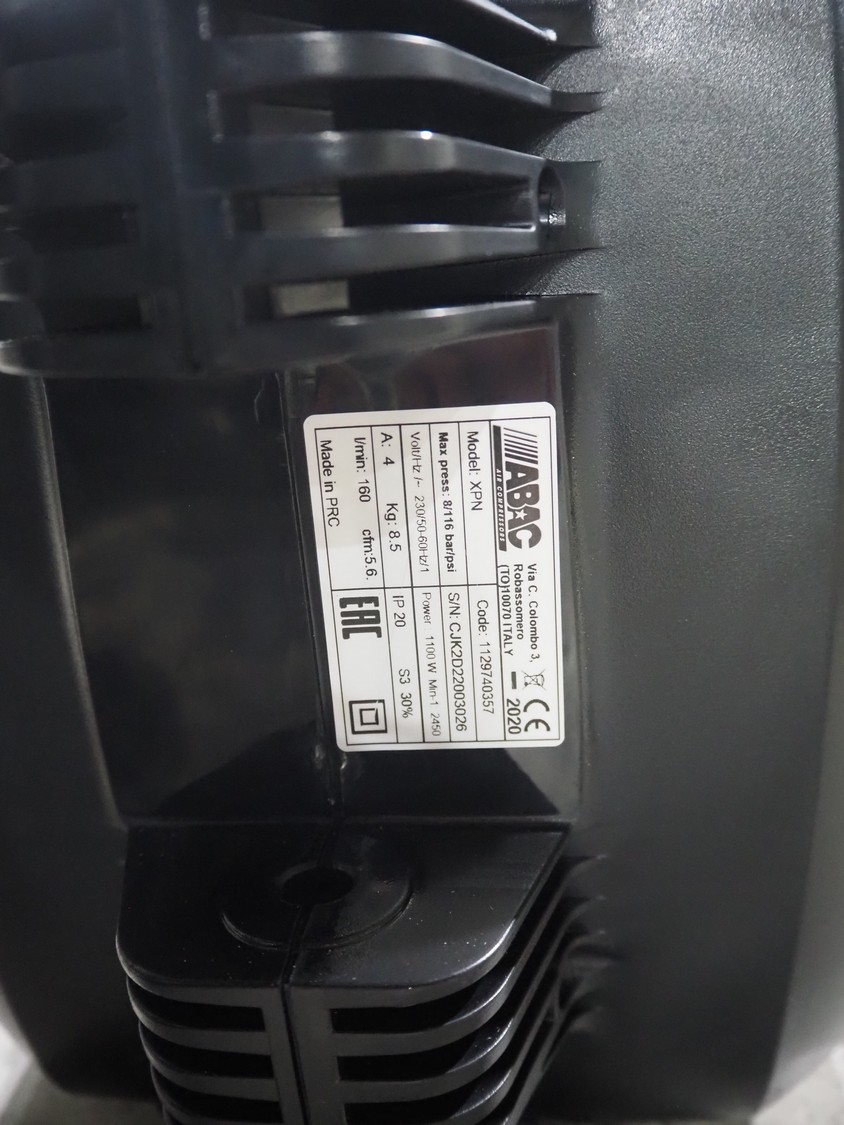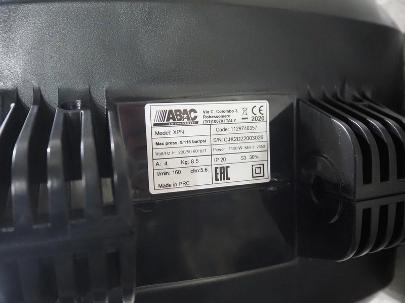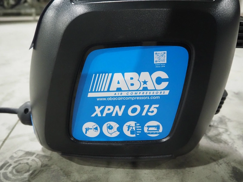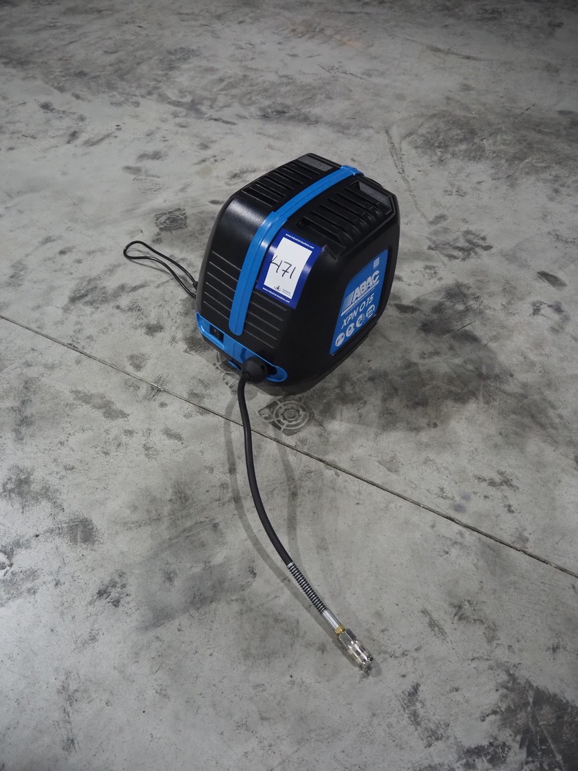 ABAC air compressors with hose reel, model: XPN, 230 V, 1 Ph, 50/60 Hz, 1100 W, weight: 8.5 kg, total dimensions: 400 mm x 250 mm x 300 mm.