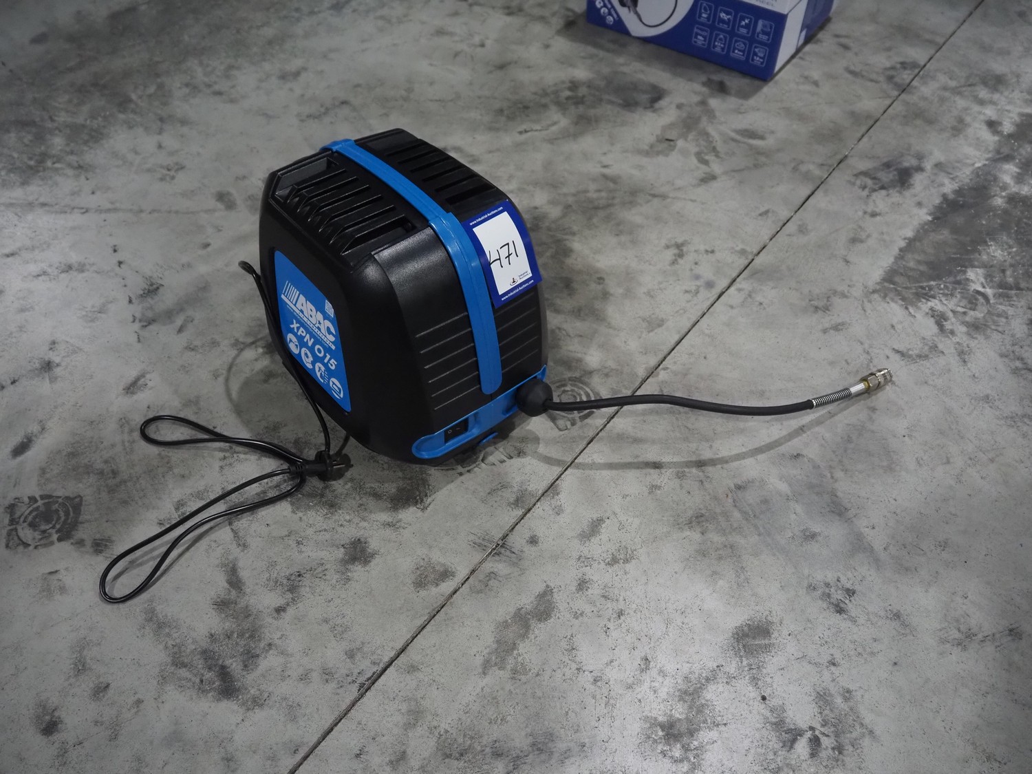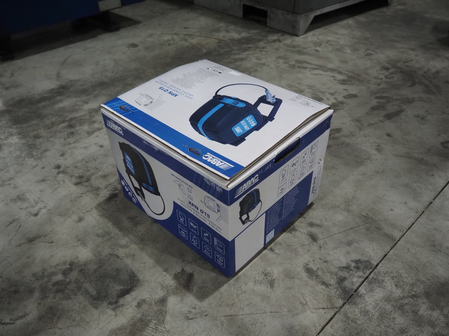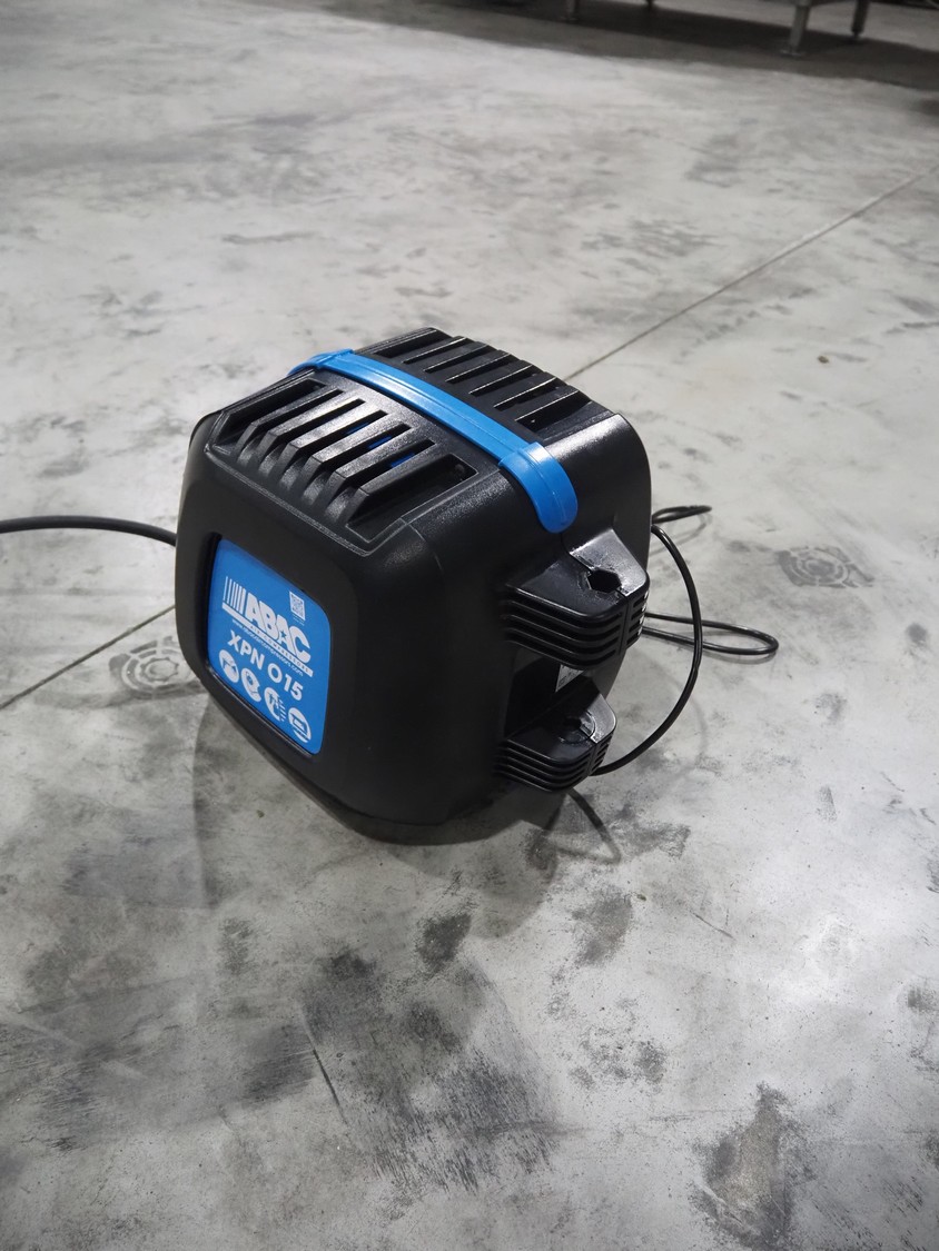 ABAC air compressors with hose reel, model: XPN, 230 V, 1 Ph, 50/60 Hz, 1100 W, weight: 8.5 kg, total dimensions: 400 mm x 250 mm x 300 mm.