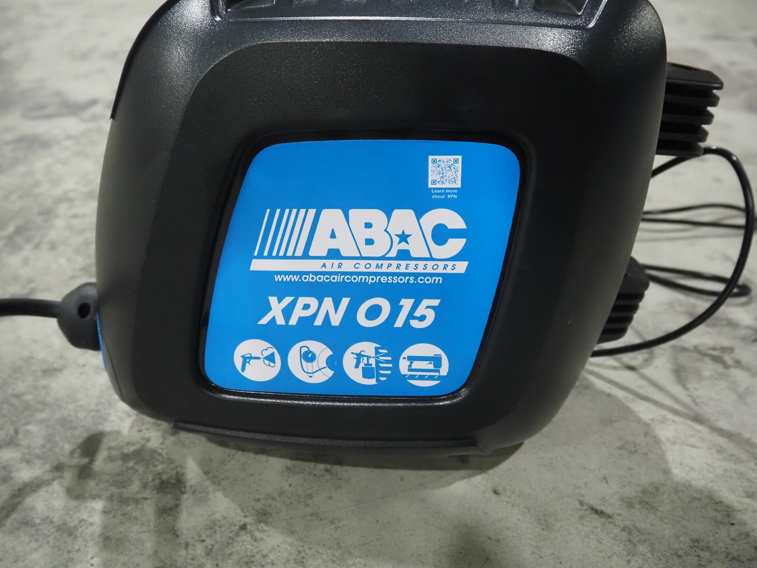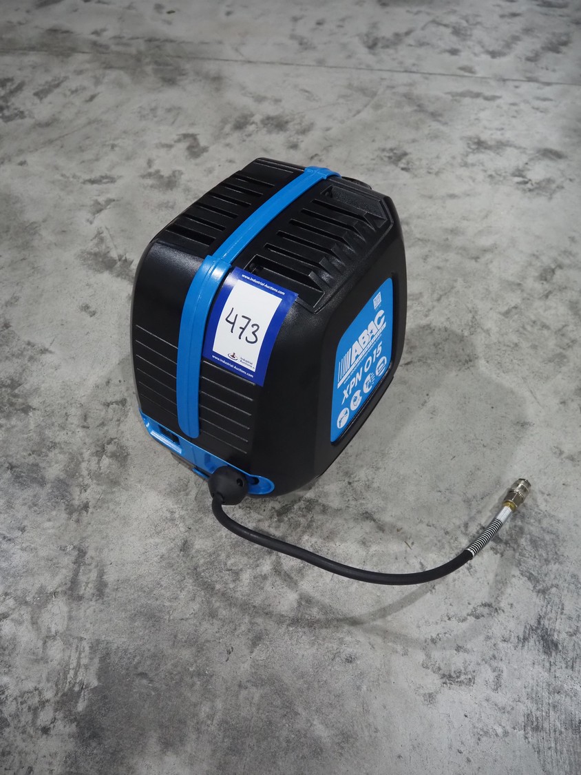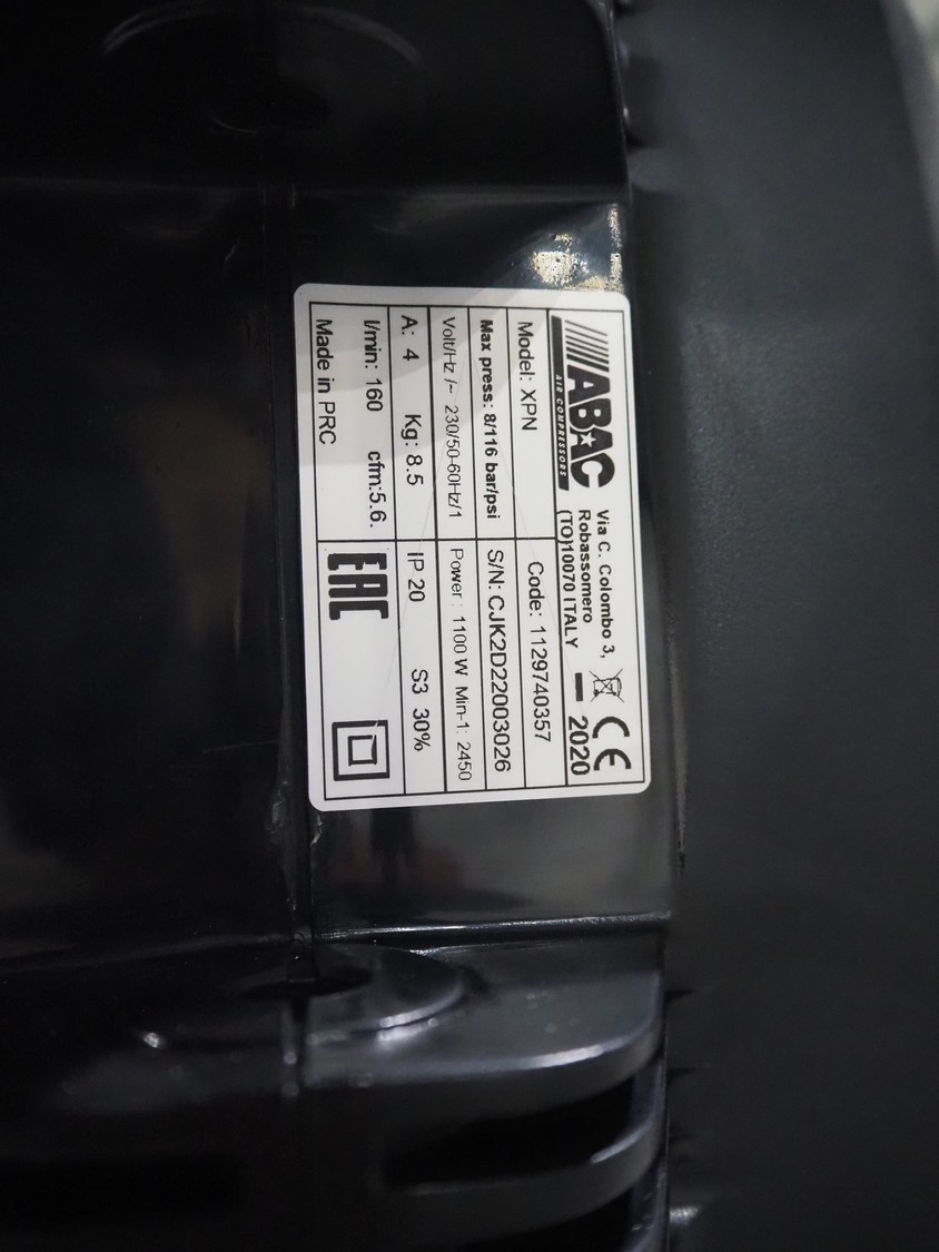 ABAC air compressors with hose reel, model: XPN, 230 V, 1 Ph, 50/60 Hz, 1100 W, weight: 8.5 kg, total dimensions: 400 mm x 250 mm x 300 mm.