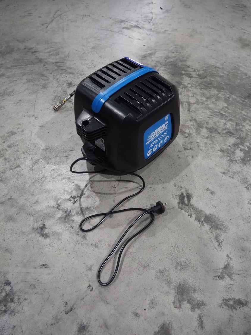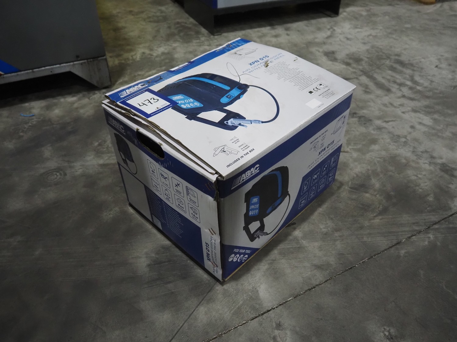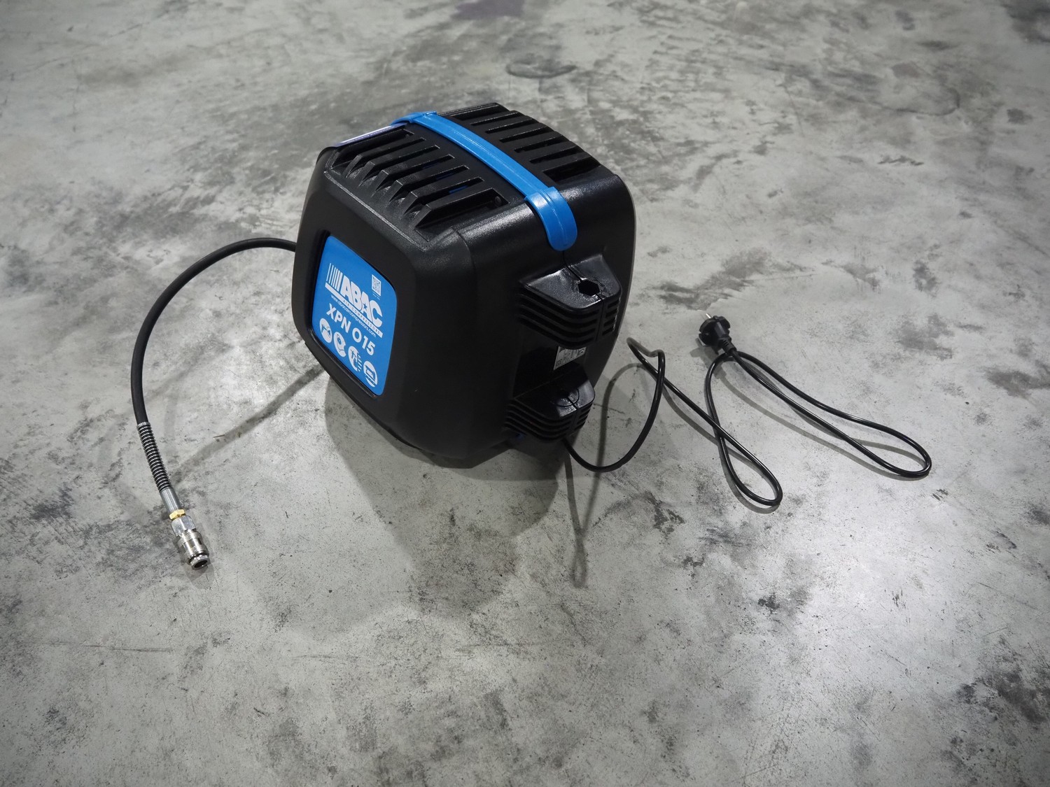 ABAC air compressors with hose reel, model: XPN, 230 V, 1 Ph, 50/60 Hz, 1100 W, weight: 8.5 kg, total dimensions: 400 mm x 250 mm x 300 mm.