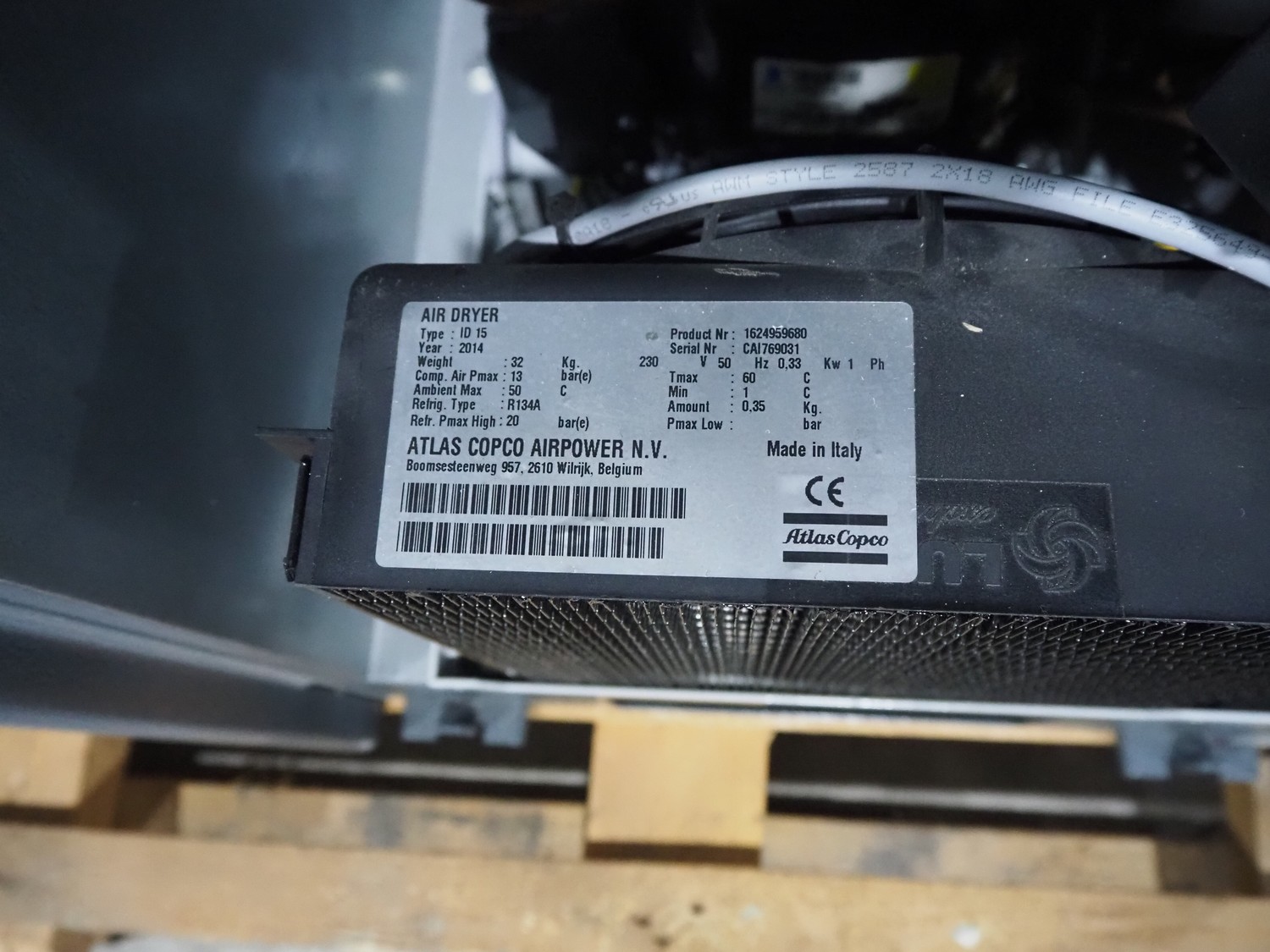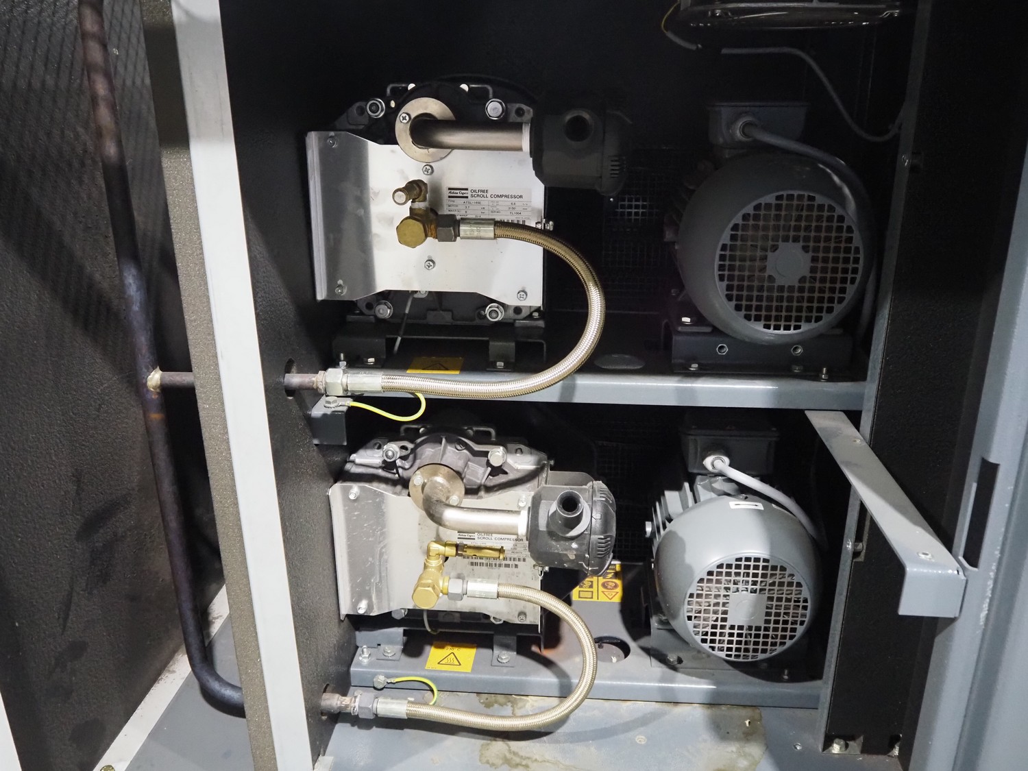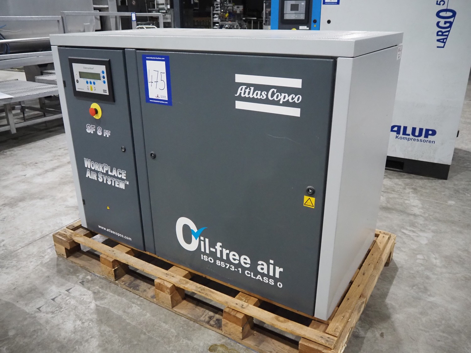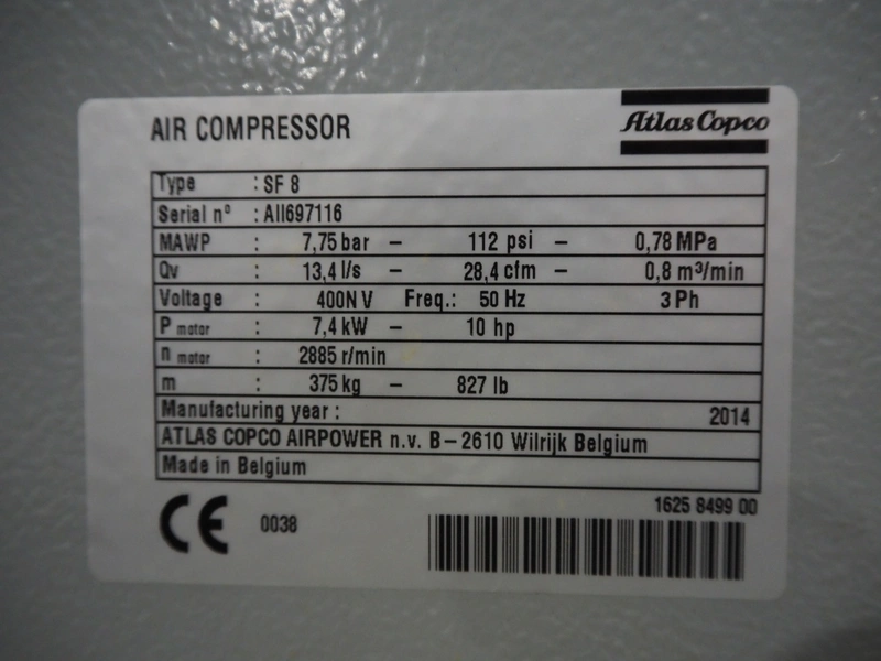 Atlas Copco oil-free scroll compressor, type: SF8-AII697116, working hours: 22996 hours, dimensions: 1500 mm x 750 mm x 1050 mm.