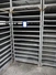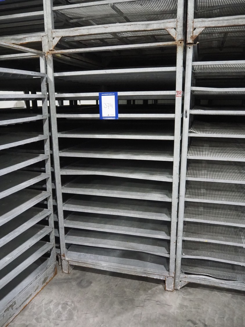 4 steel racks, 11 floors per racks, 3 frames have closed floors, 1 frame has perforated floors, floor dimensions: 1150 mm x 990 mm x 130 mm (closed) / 1155 mm x 930 mm x 135 mm (perforated), total dimensions: (4x) 1200 mm x 1005 mm x 1890 mm.