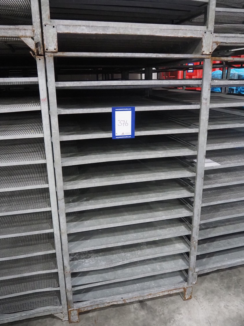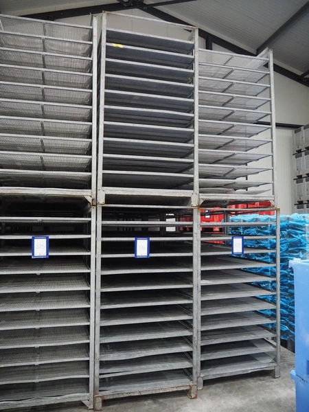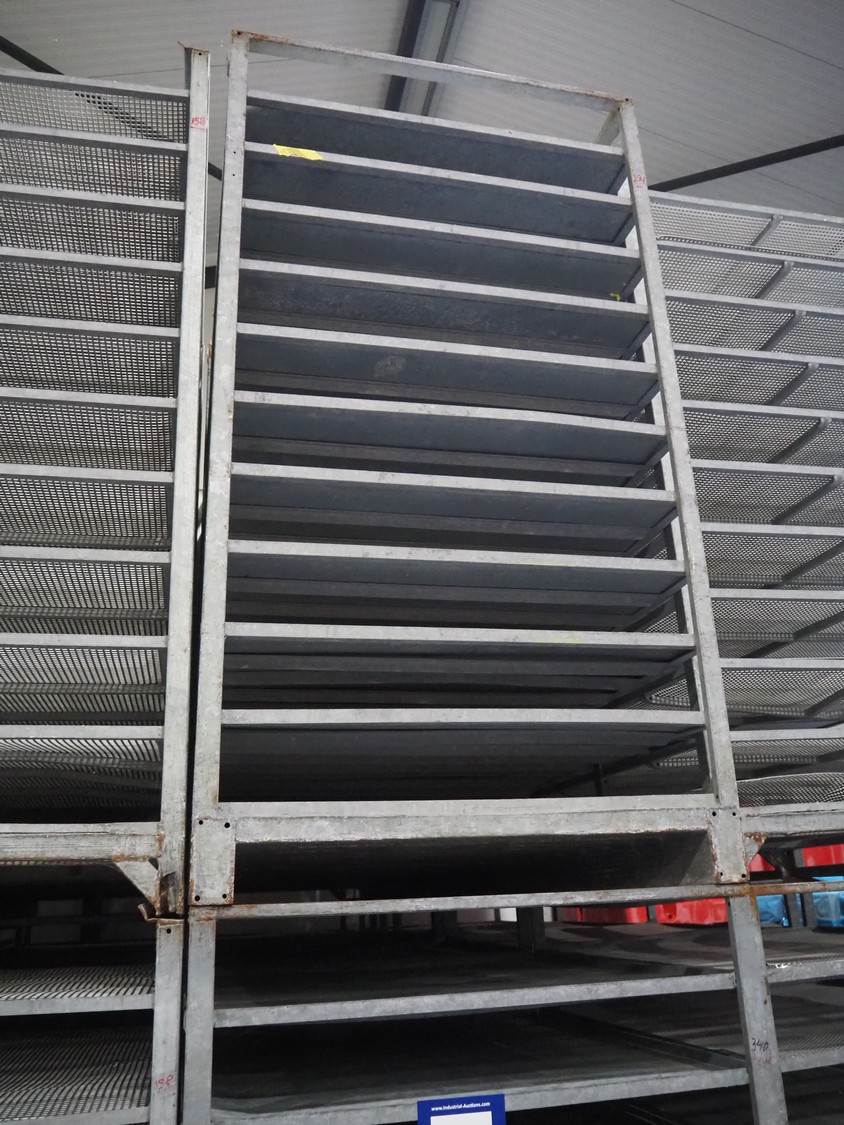 8 steel racks, 11 floors per racks, 7 racks have closed floors, 1 rack has perforated floors, floor dimensions: 1150 mm x 990 mm x 130 mm (closed) / 1155 mm x 930 mm x 135 mm (perforated), total dimensions: (8x) 1200 mm x 1005 mm x 1890 mm.