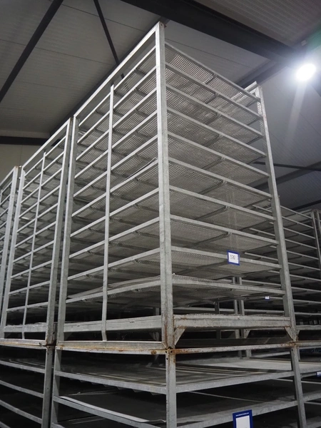 4 steel racks, 11 floors per rack, perforated floors, floor dimensions: 1155 mm x 930 mm x 135 mm, total dimensions: (4x) 1200 mm x 1005 mm x 1890 mm.