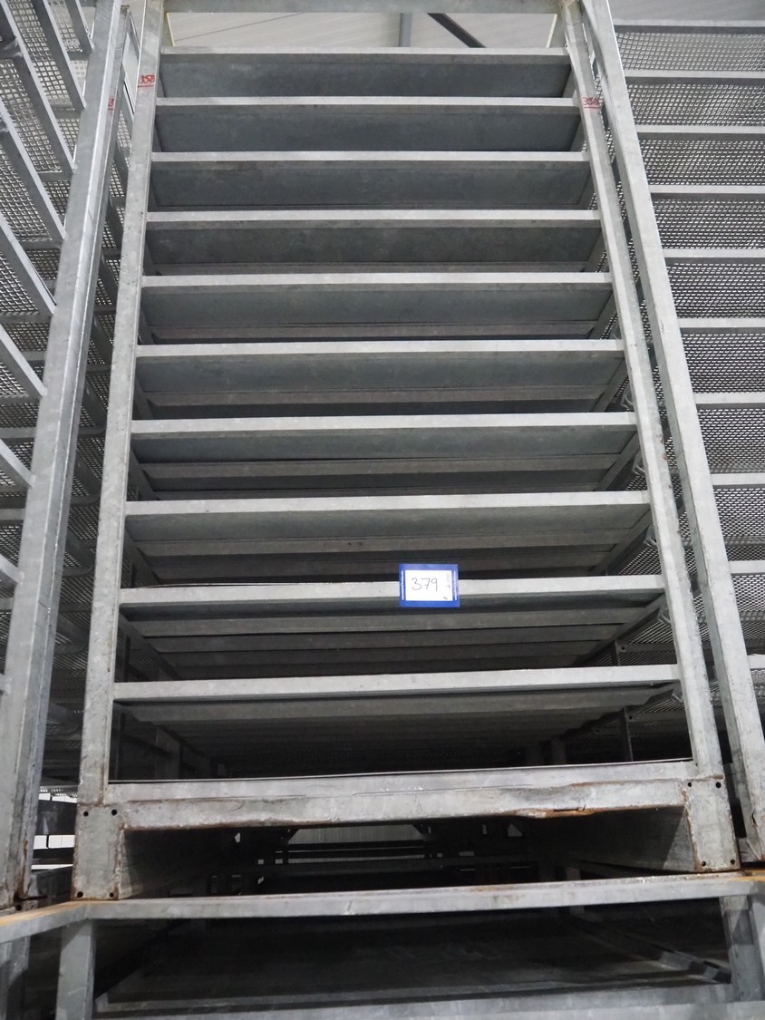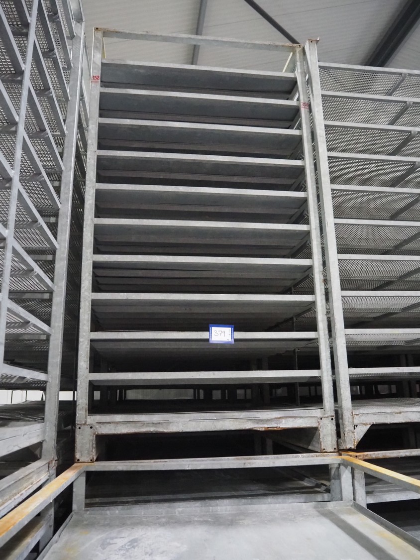 4 steel racks, 11 floors per rack, 3 racks have closed floors, 1 rack has perforated floors, floor dimensions: 1150 mm x 990 mm x 130 mm (closed) / 1155 mm x 930 mm x 135 mm (perforated), total dimensions: (4x) 1200 mm x 1005 mm x 1890 mm.