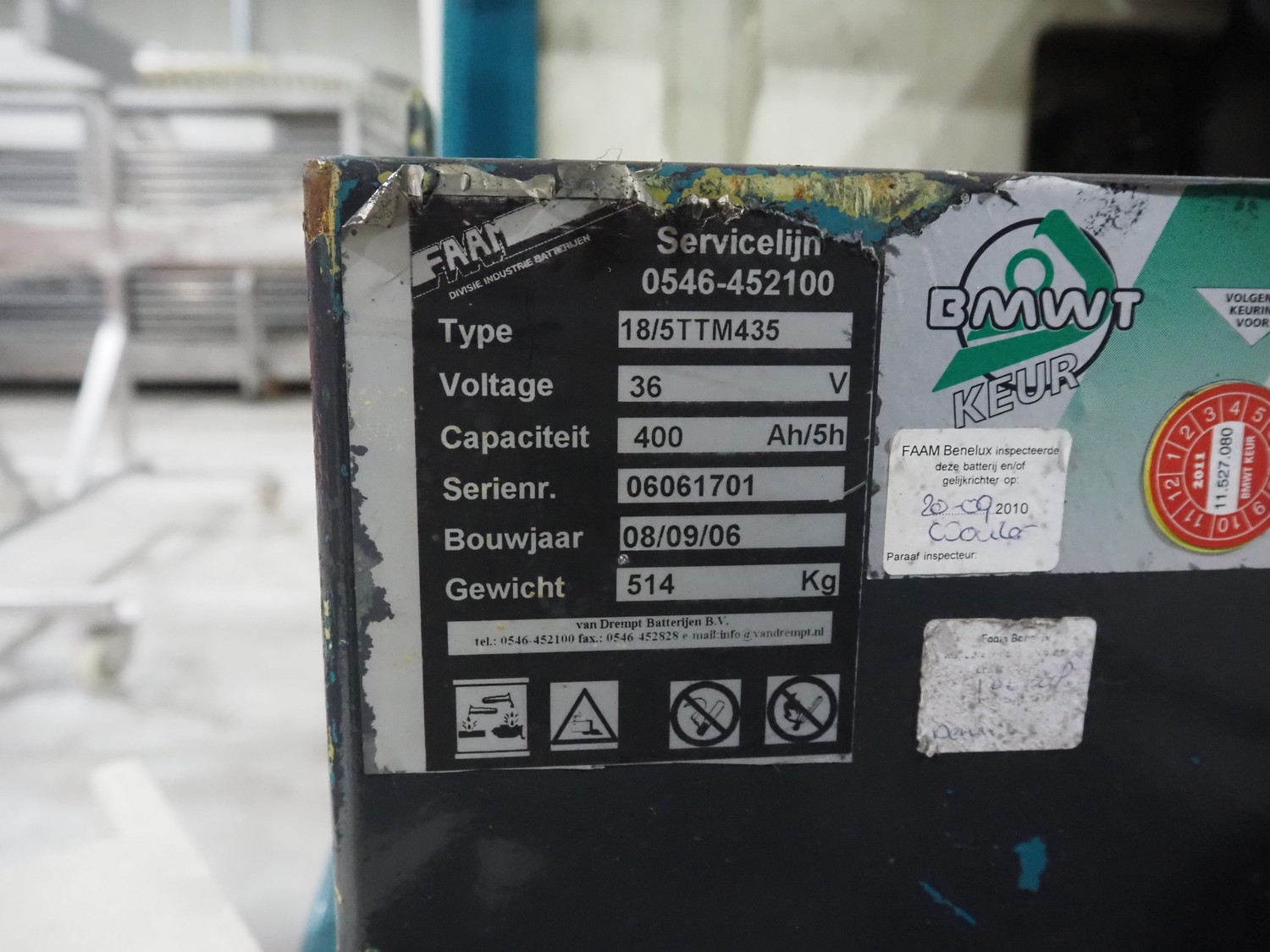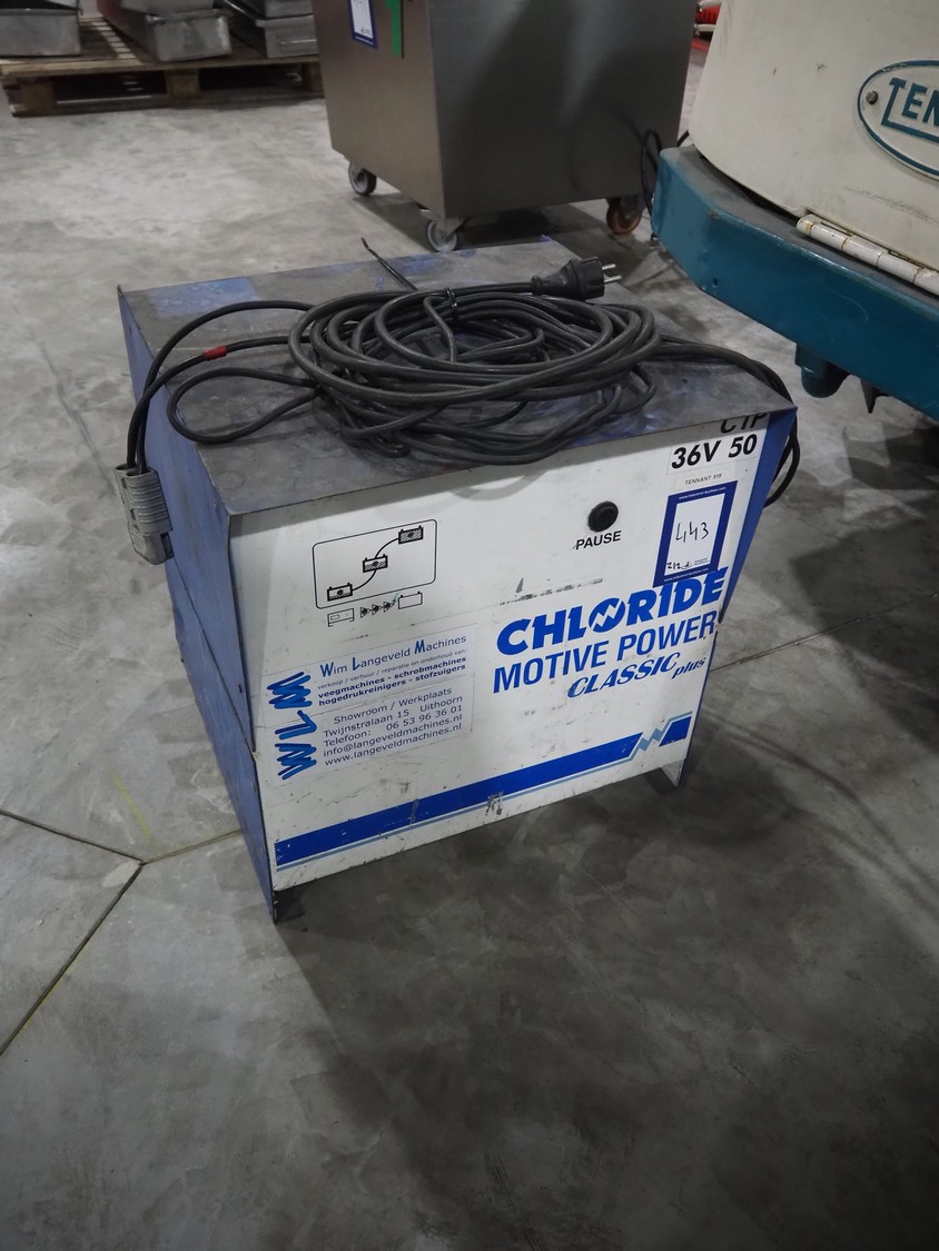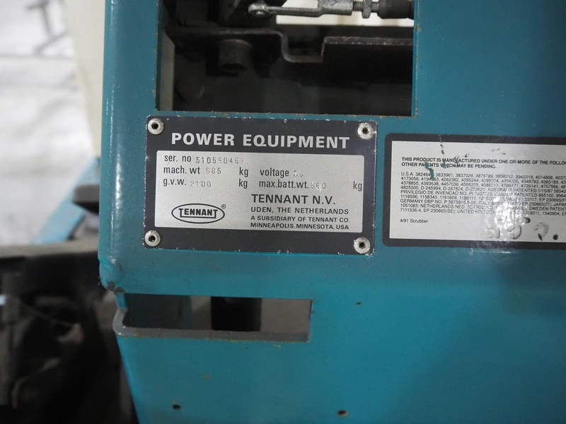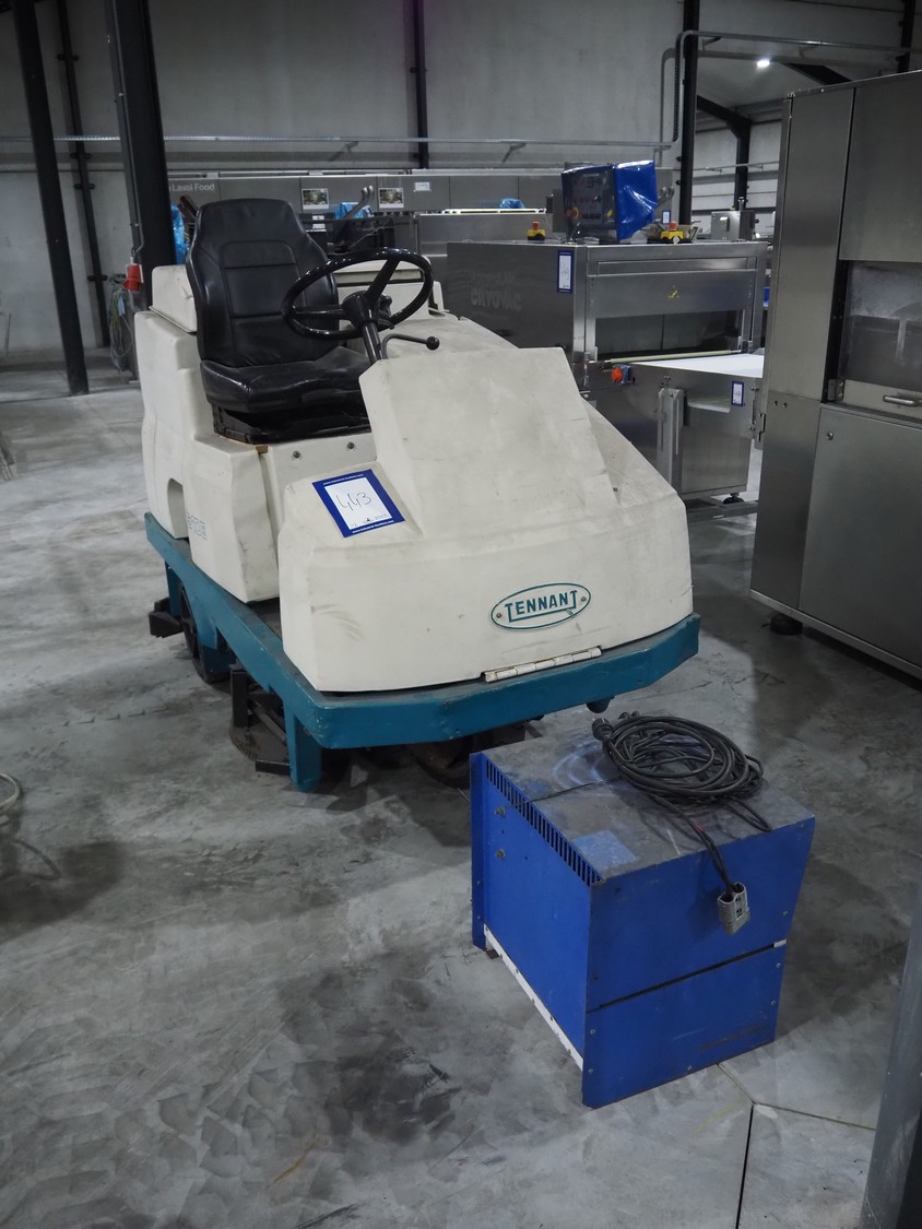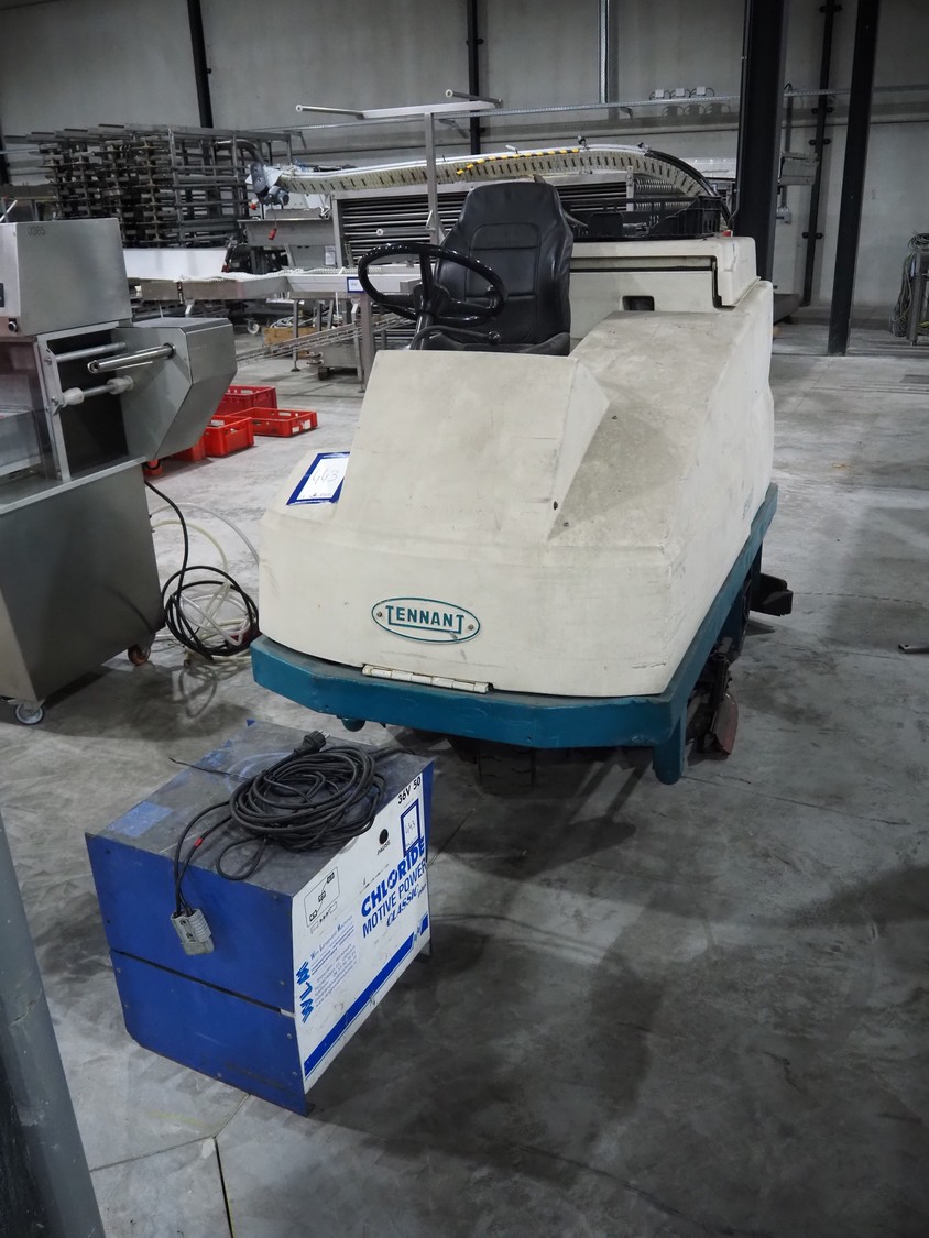 Tennant floor scrubbing machine, type: 18/5TTM435, serial number: 510550467, dimensions: 1200 mm x 2100 mm x 1600 mm. With Chloride motive power battery charger, 36 V.