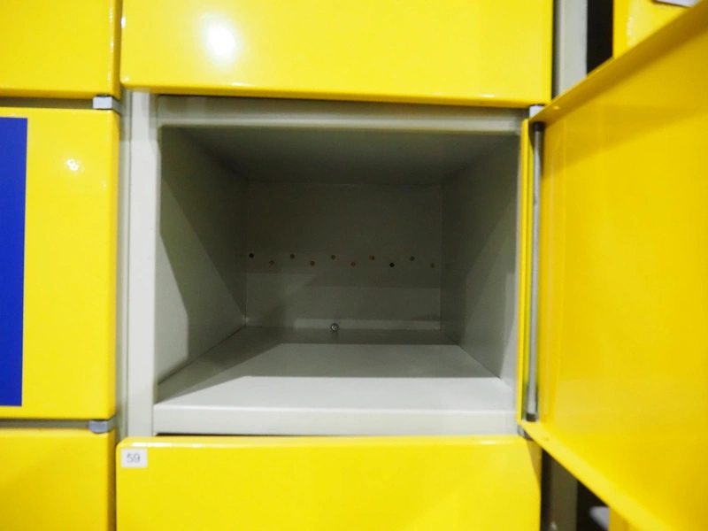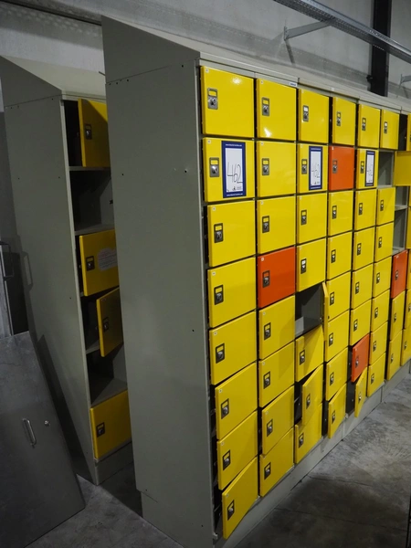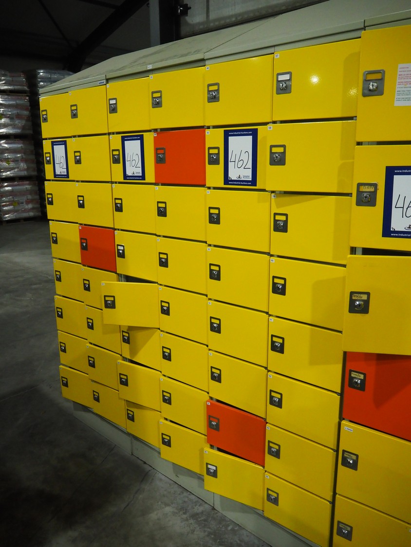 3 steel 16-doors lockers, inside dimensions: (16x) 465 mm x 295 mm x 220 mm, total dimensions: (3x) 600 mm x 510 mm x 2210 mm. Including keys.