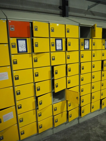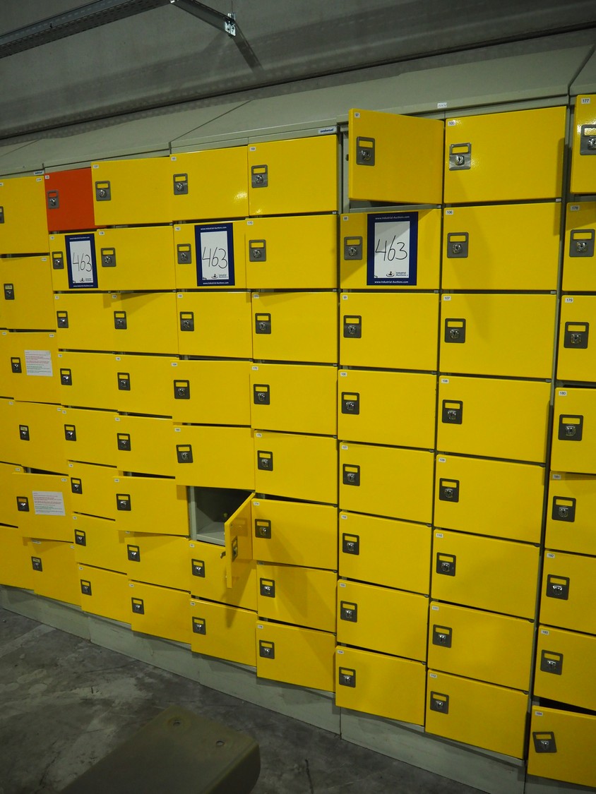 3 steel 16-doors lockers, inside dimensions: (16x) 465 mm x 295 mm x 220 mm, total dimensions: (3x) 600 mm x 510 mm x 2210 mm. Including keys.