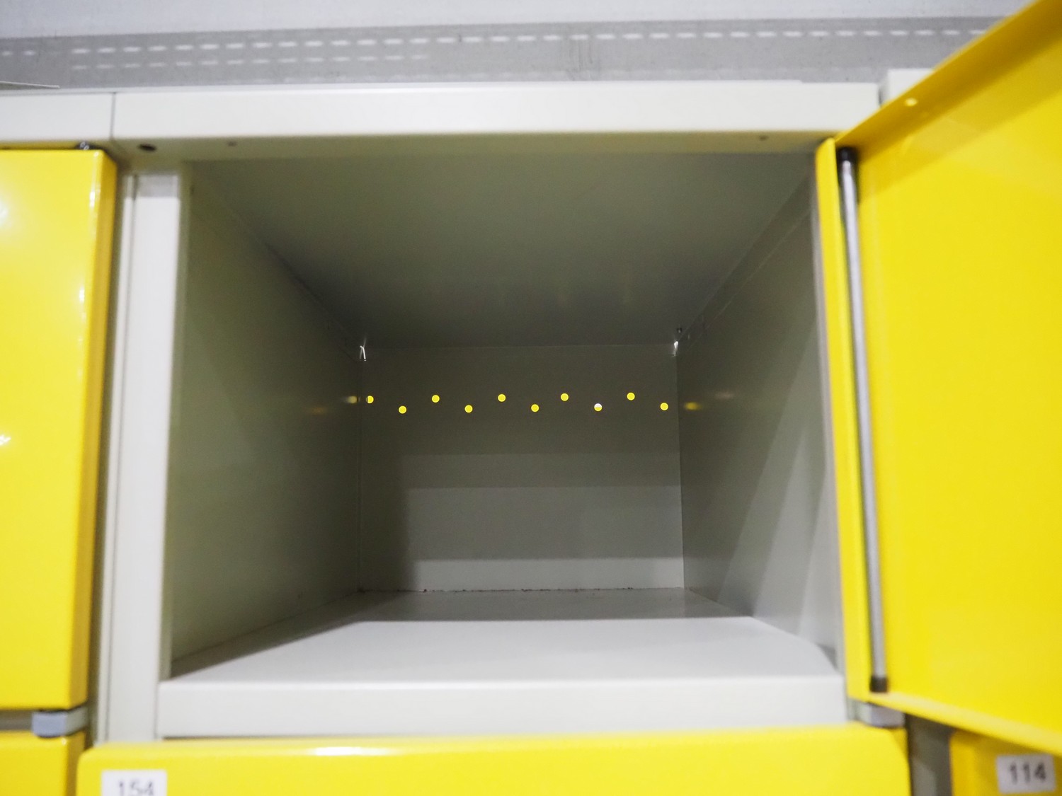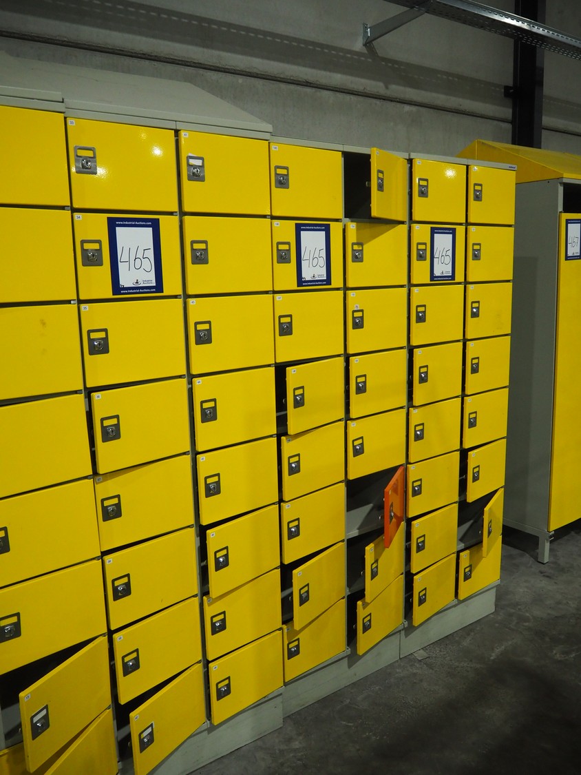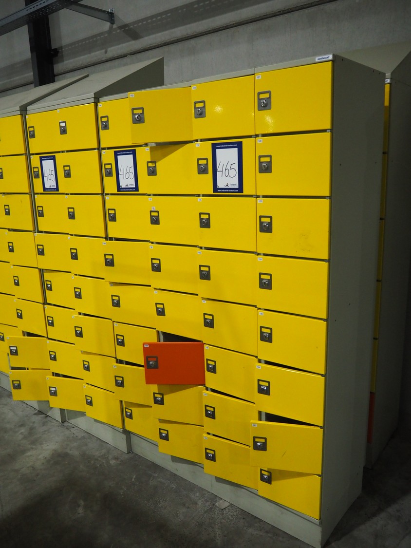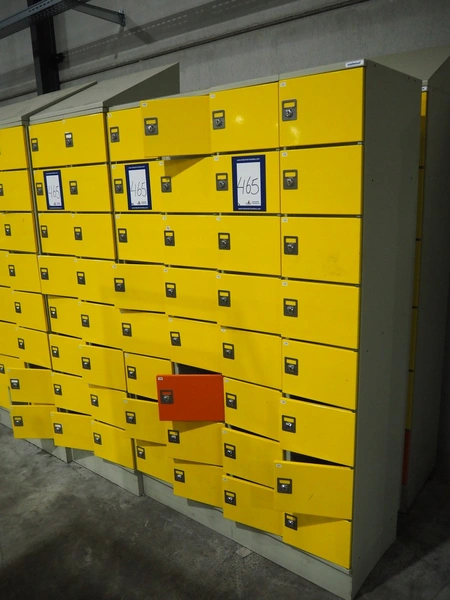 3 steel 16-doors lockers, inside dimensions: (16x) 465 mm x 295 mm x 220 mm, total dimensions: (3x) 600 mm x 510 mm x 2210 mm. Including keys.