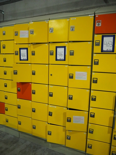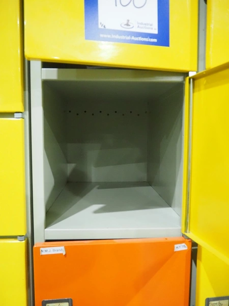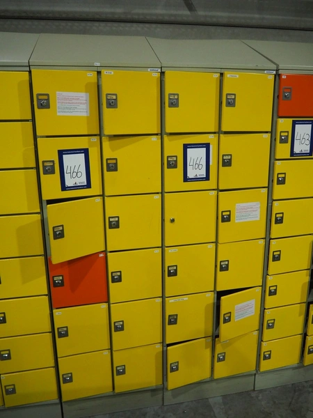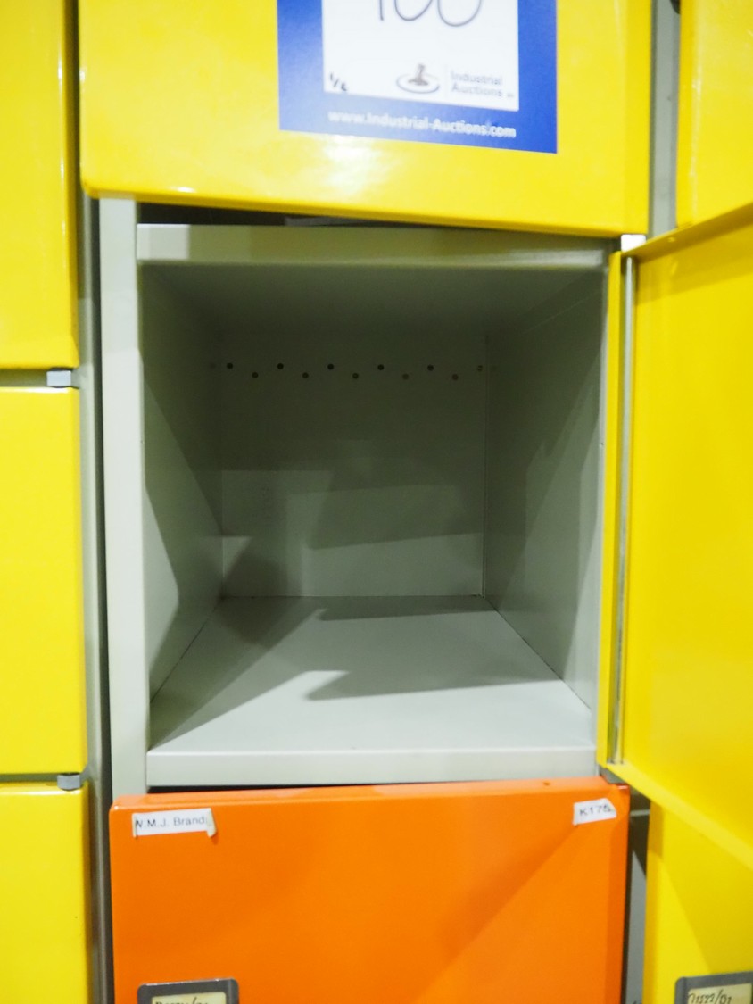 3 steel 12-doors lockers, inside dimensions: (12x) 470 mm x 300 mm x 275 mm, total dimensions: (3x) 600 mm x 510 mm x 2210 mm. Without keys.