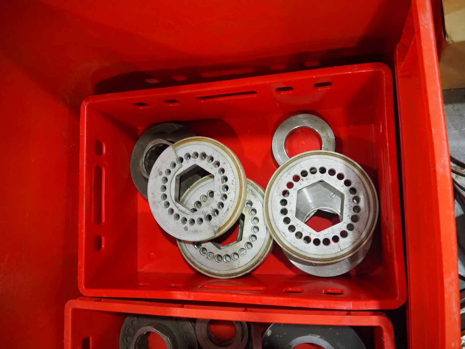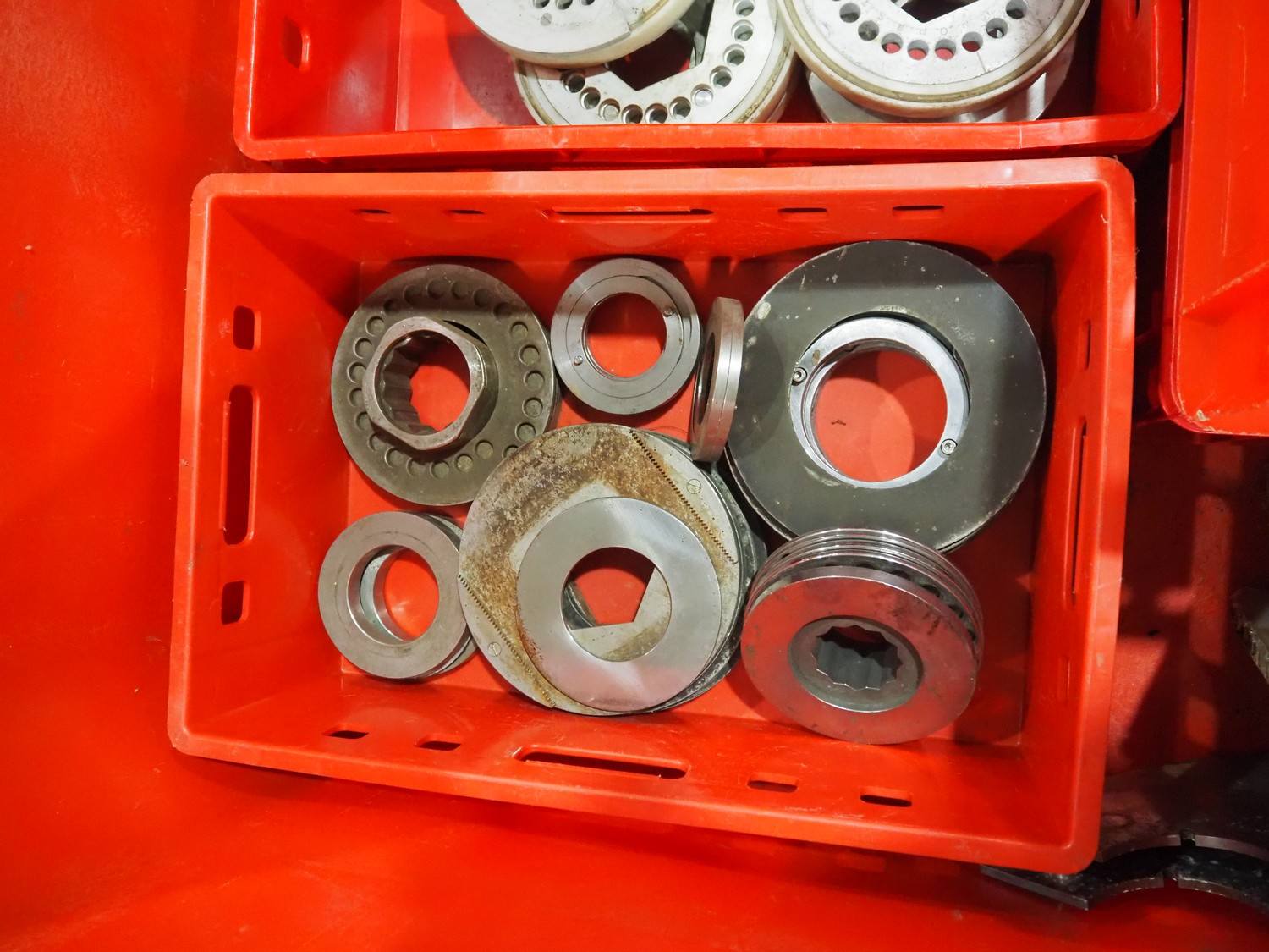 Plastic pallet box various machine parts.