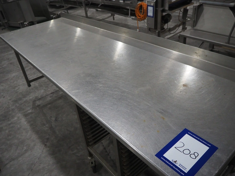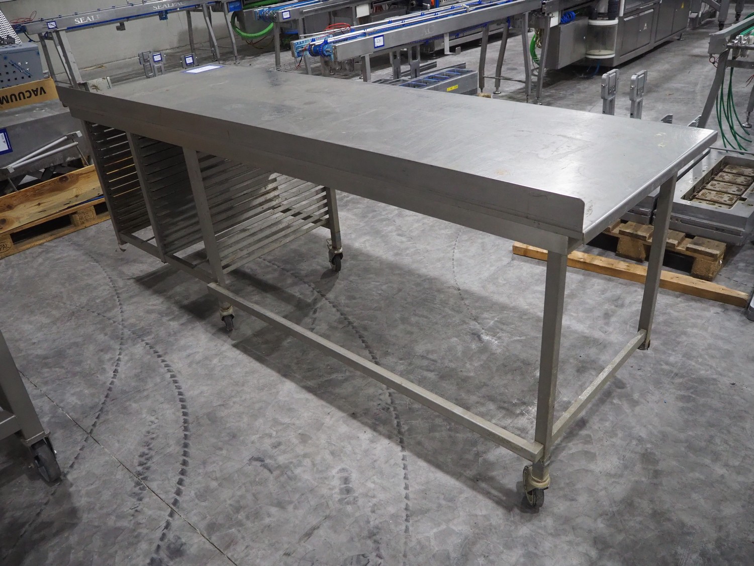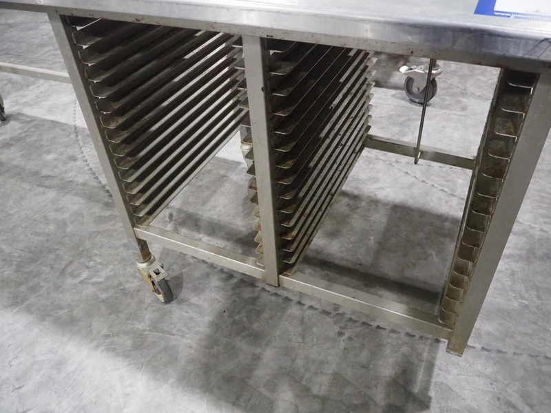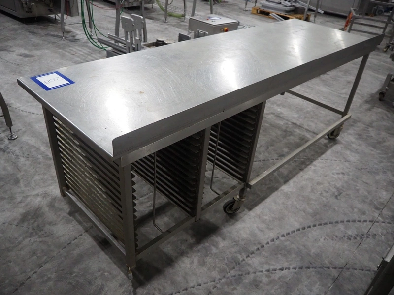 Mobile s/s table, 15 floors, (15x) dimensions: 580 mm x 405 mm, total dimensions: 2600 mm x 850 mm x 1040 mm. 3 wheels missing.