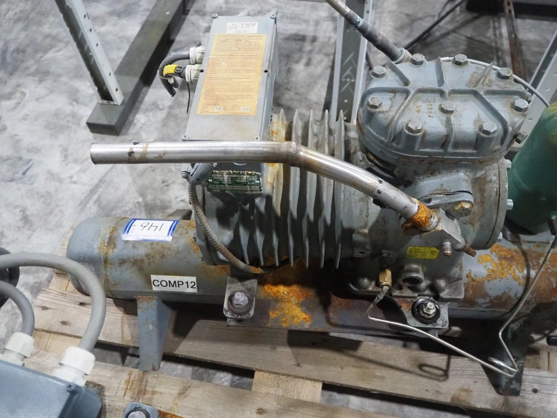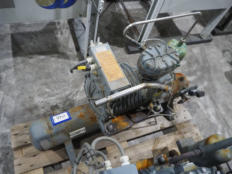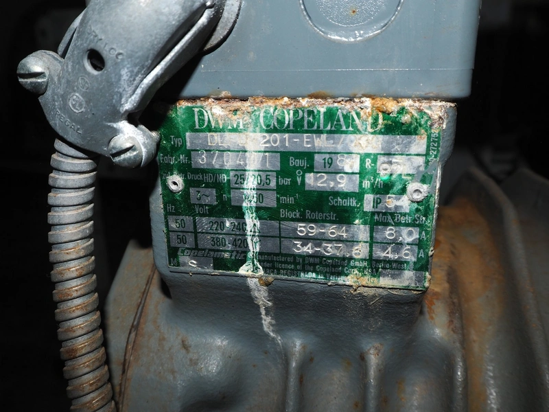 DWM Copeland cooling compressor, type: DLFD-201-EWL/000, serial number: 370401, year of construction: 1983, 220/240/380/420 V, 50 Hz, 3 Ph, 8.0/4.6 A, capacity: 12.9 m³ per hour, dimensions: 1250 mm x 500 mm x 720 mm.