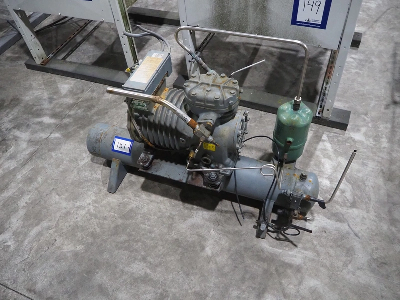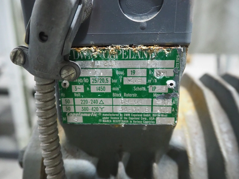 DWM Copeland cooling compressor, type: DLFD-201-EWL/000, serial number: 370310, year of construction: 1987, 220/240/380/420 V, 3 Ph, 50 Hz, 6.0/4.6 A, capacity: 12.9 m³ per hour, dimensions: 1250 mm x 500 mm x 720 mm.