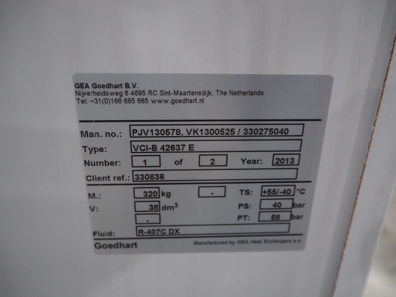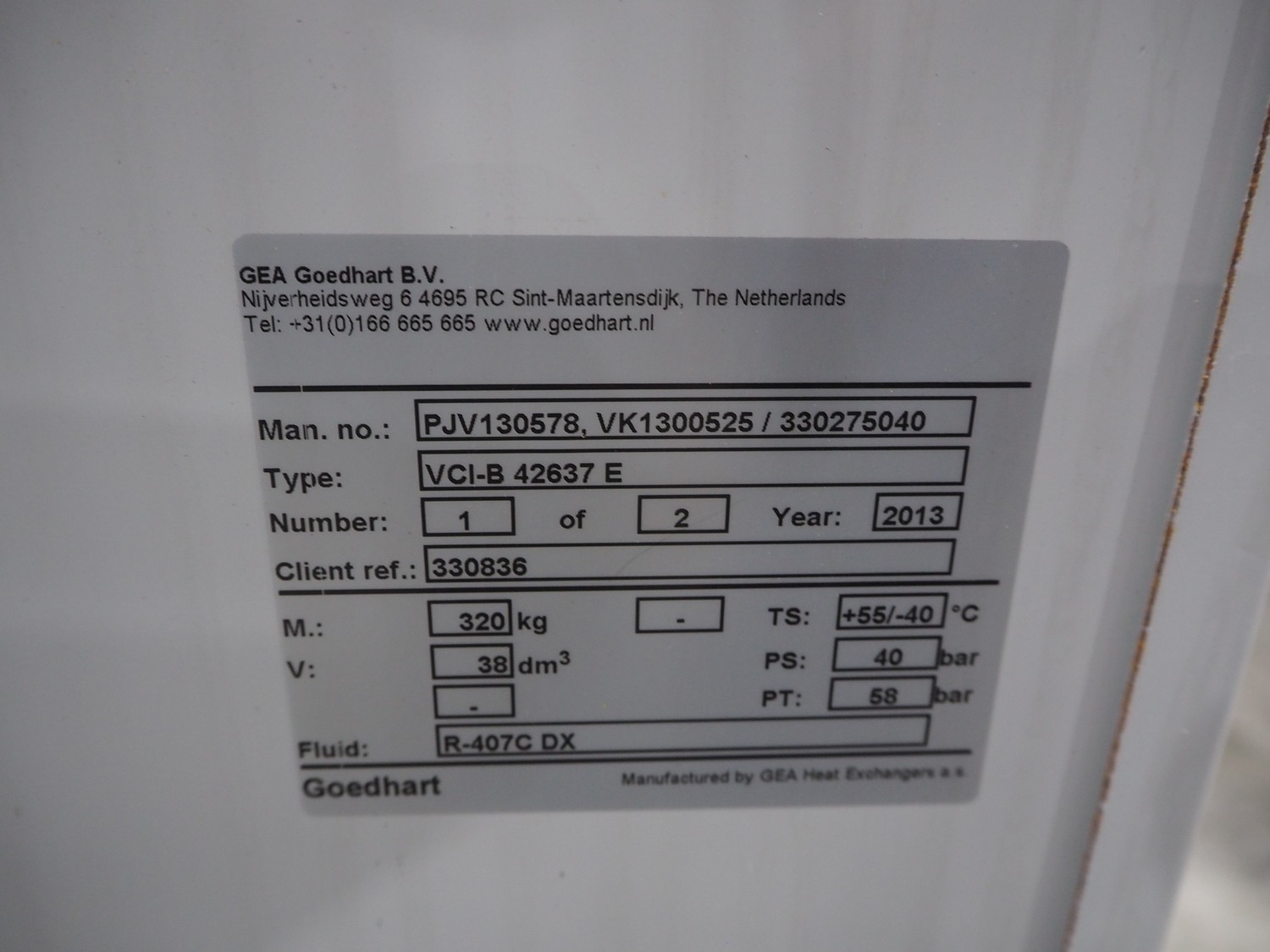 GEA Goedhart B.V. evaporator, type: VCI-B 42637 E, manufacturing number: PJV130578, VK1300525/3303275040, year of construction: 2013, refrigerant: R-407C DX, 2 fans, dimensions: 2850 mm x 1350 mm x 1070 mm.