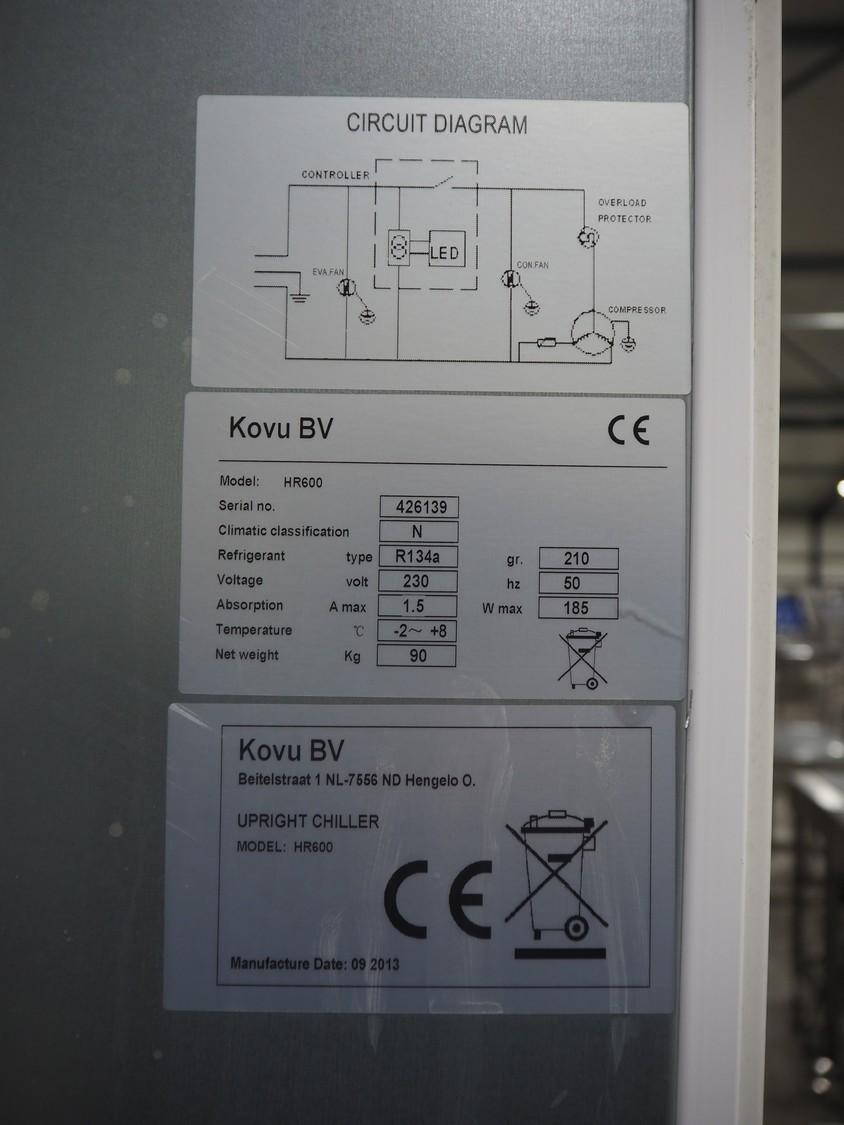 Kovu BV freezer, model: HR600, serial number: 426139, 230 V, 50 Hz, 185 W, refrigerant: R134a, weight: 90 kg, dimensions: 700 mm x 800 mm x 1880 mm.