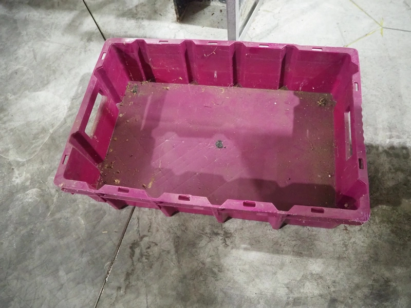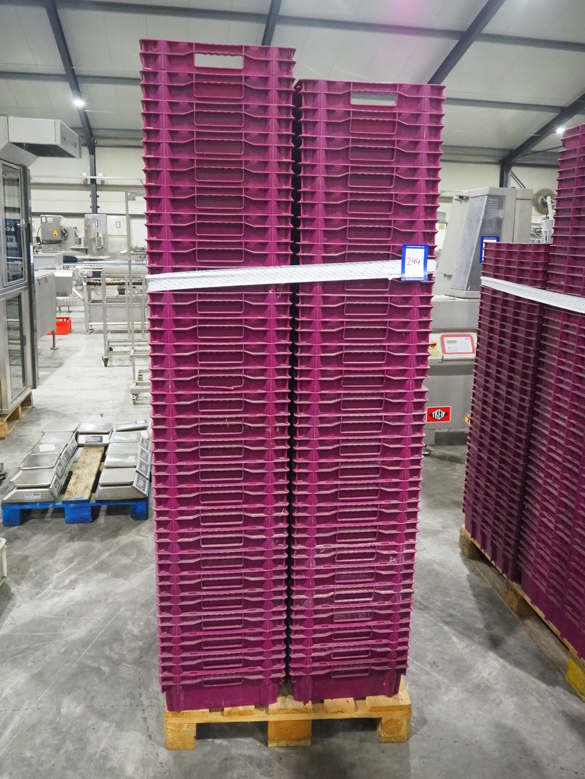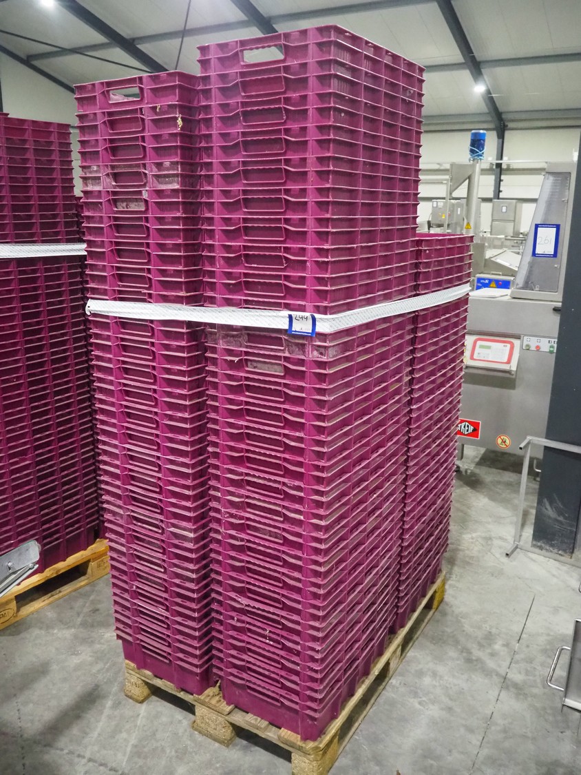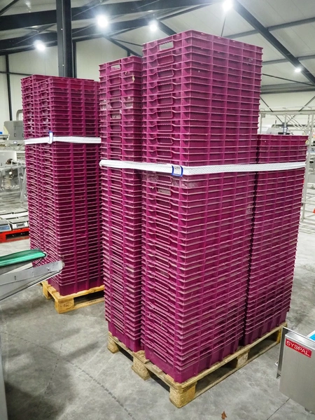 2 pallets with large amount of crates, dimensions each crate: 600 mm x 400 mm x 150 mm, total dimensions: (2x) 1200 mm x 800 mm x 2100 mm.