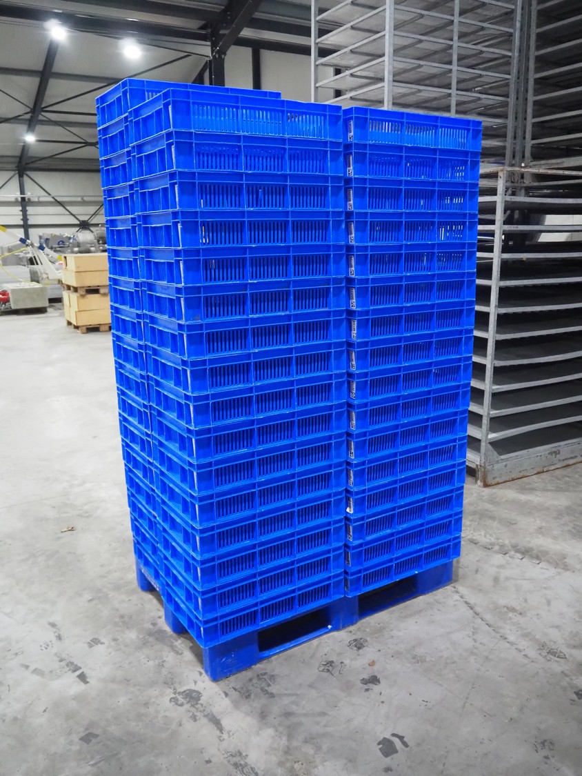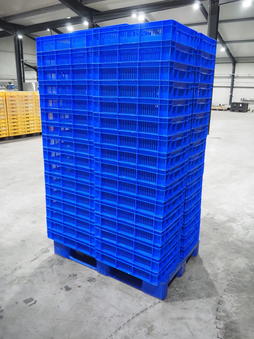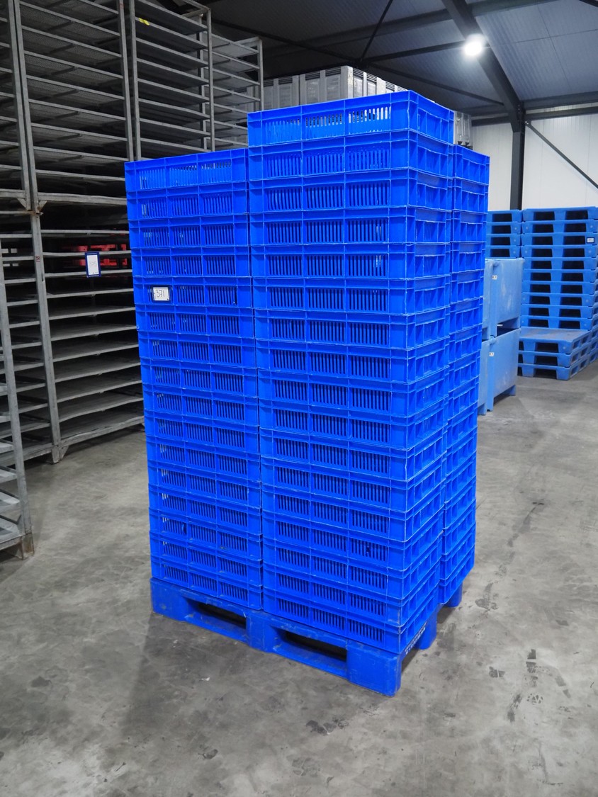 65 plastic crates, inside dimensions: 560 mm x 360 mm x 115 mm, total dimensions: 600 mm x 395 mm x 120 mm.