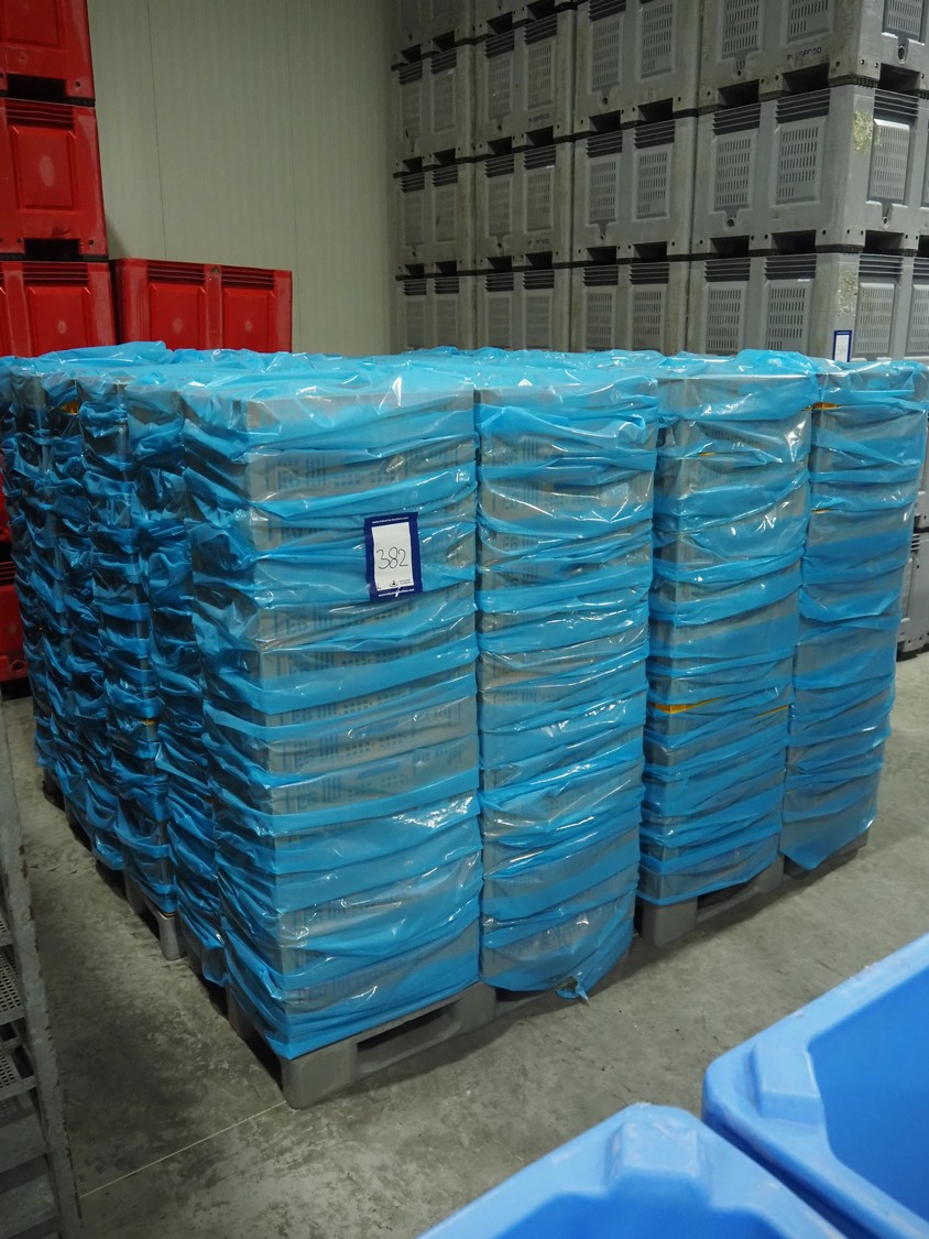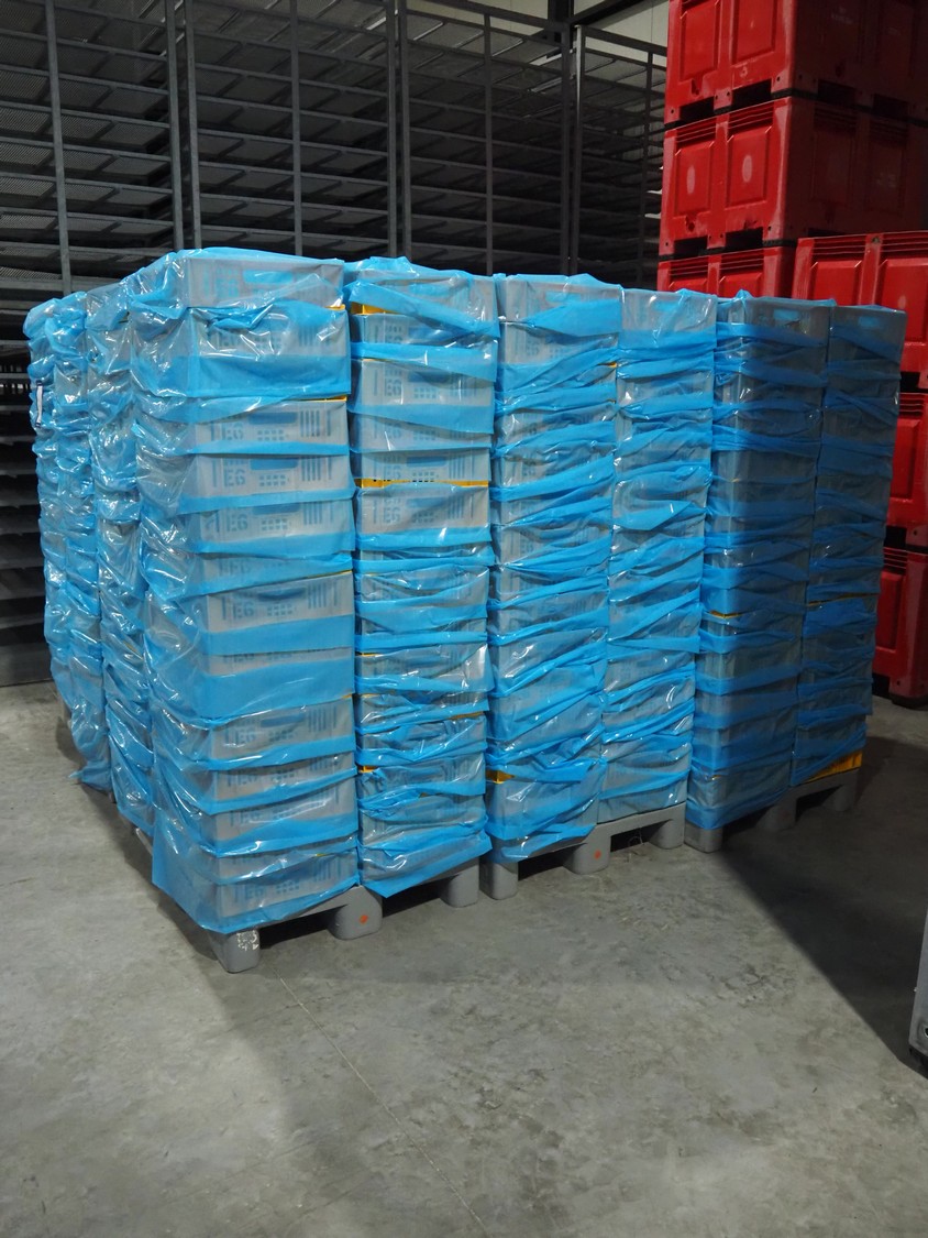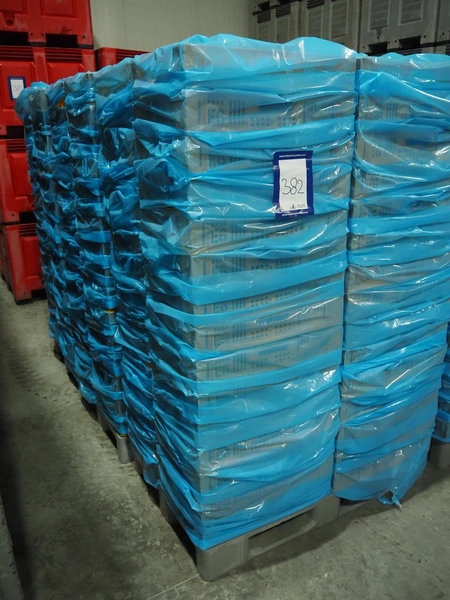 6 pallets with plastic crates, approximately 360 crates in total, crate dimensions: (6x) 590 mm x 390 mm x 110 mm, total dimensions: (6x) 1200 mm x 800 mm x 1810 mm.