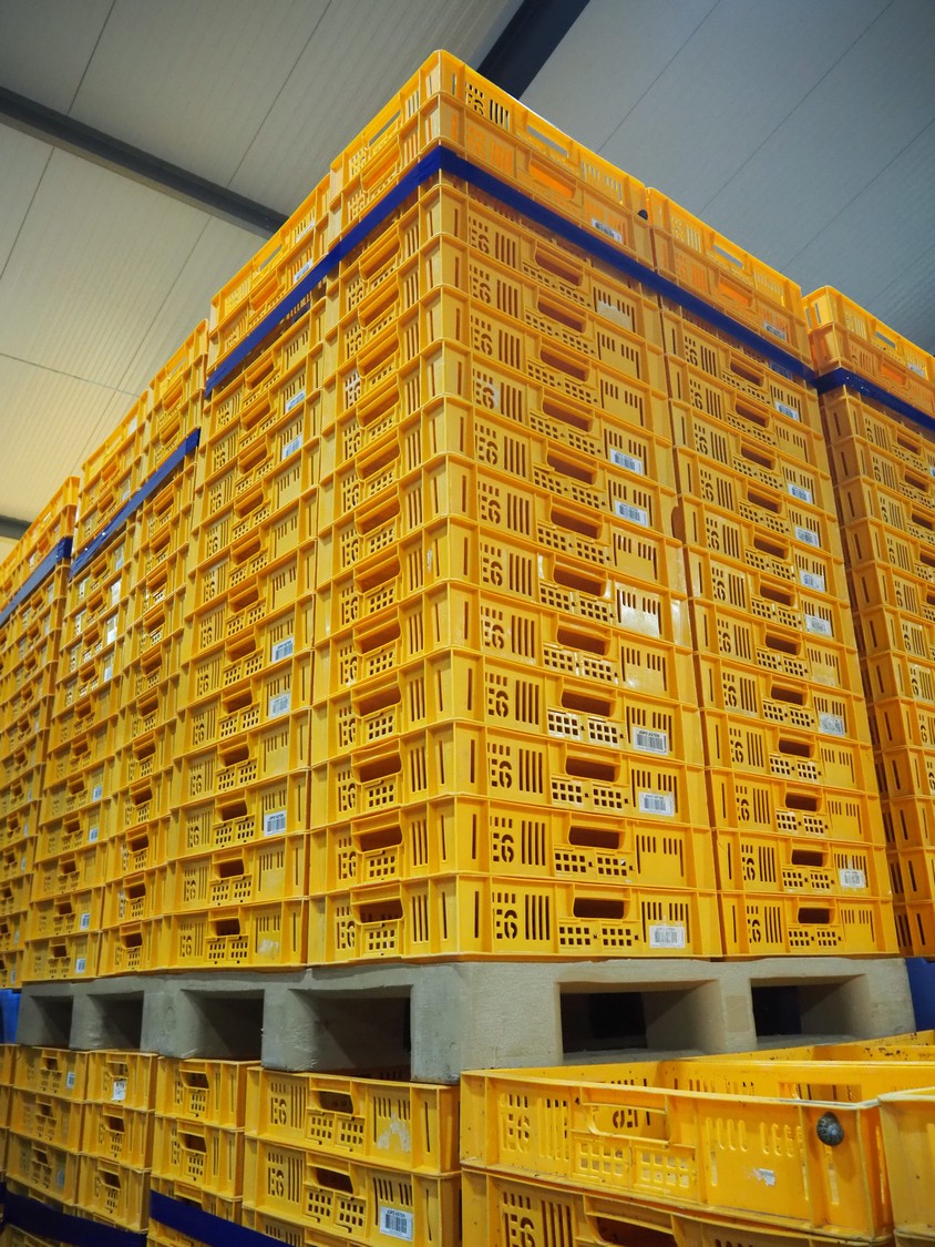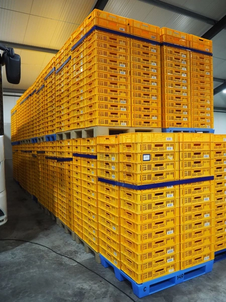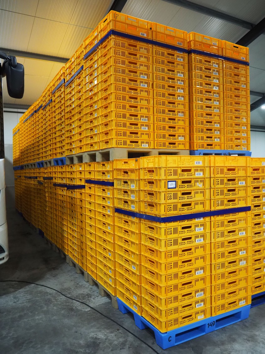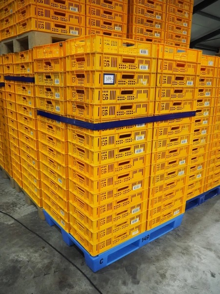 23 pallets with plastic crates, approximately 1665 crates in total, crate dimensions: 590 mm x 390 mm x 110 mm, total dimensions: (19x) 1200 mm x 1000 mm x 1800 mm and (4x) 1200 mm x 800 mm x 1800 mm.