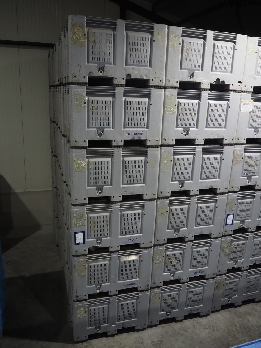 120 plastic pallet boxes, inside dimensions: (60x) 1110 mm x 900 mm x 575 mm, total dimensions: (60x) 1200 mm x 1000 mm x 800 mm.