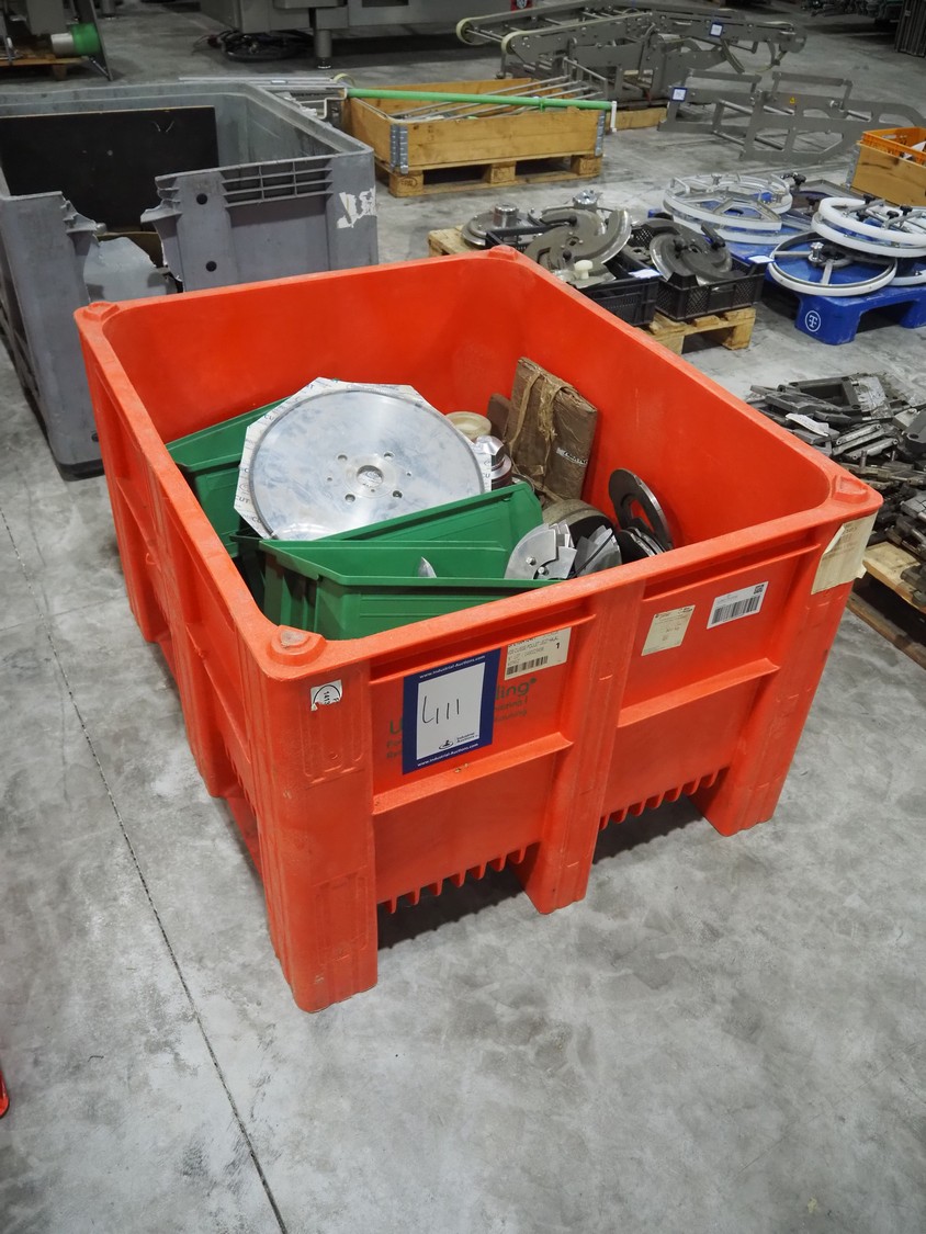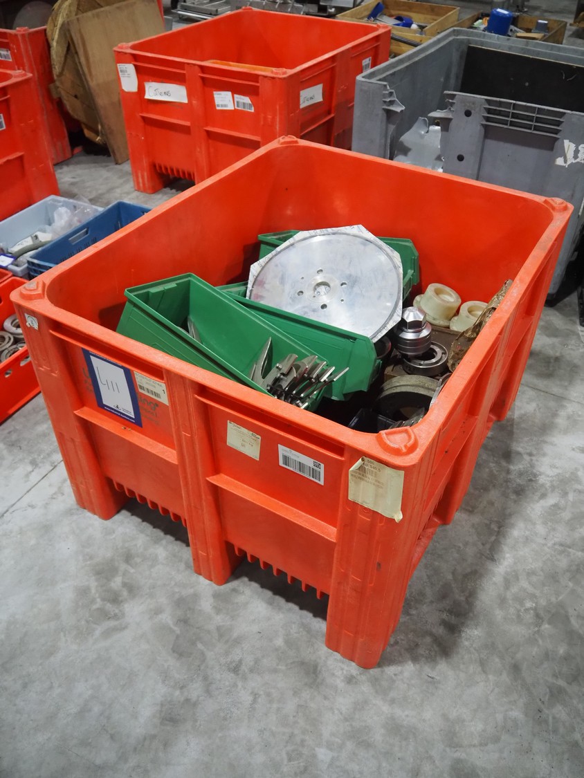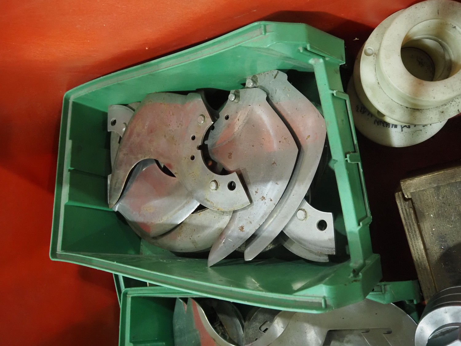Plastic pallet box with various knifes.