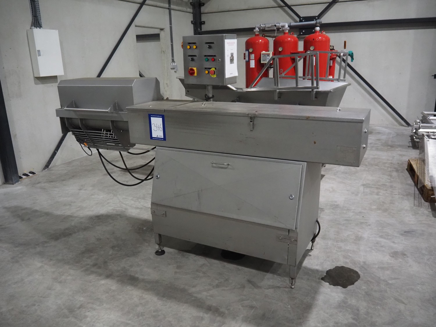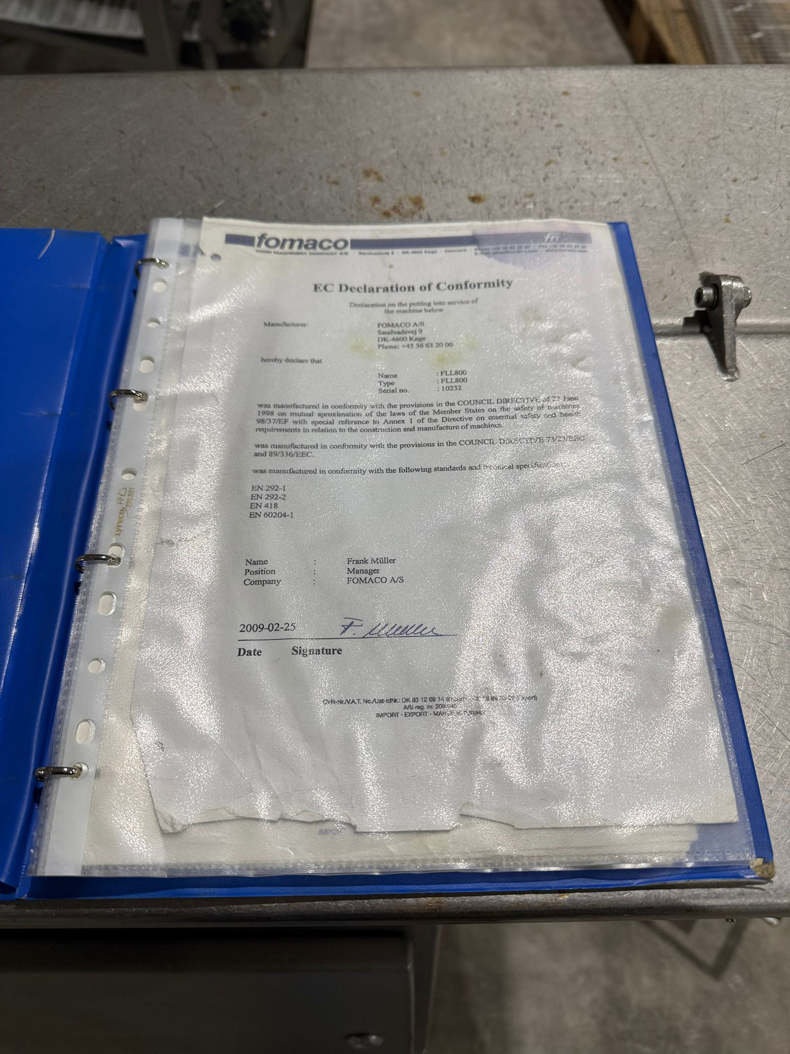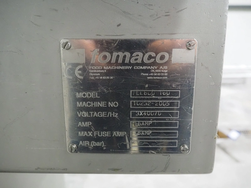 Fomaco meat press, model: FLL800-160, machine number: 10232-2005, year of construction: 2005, 400 V, 3 Ph, 16 A, dimensions chamber: Ø 135 mm x 860 mm, total dimensions: 2600 mm x 850 mm x 1680 mm.