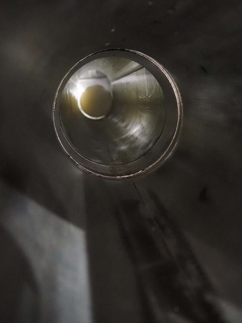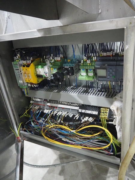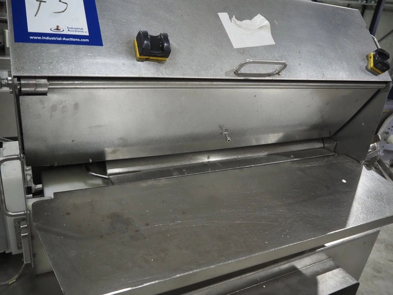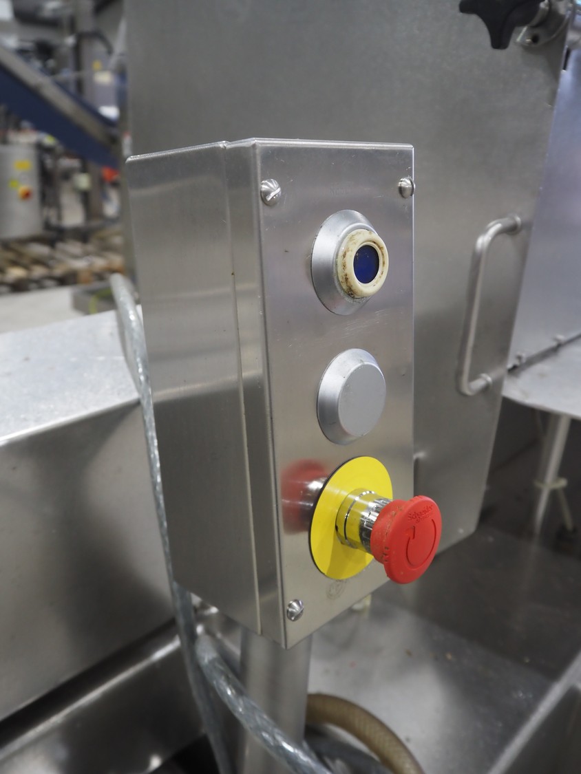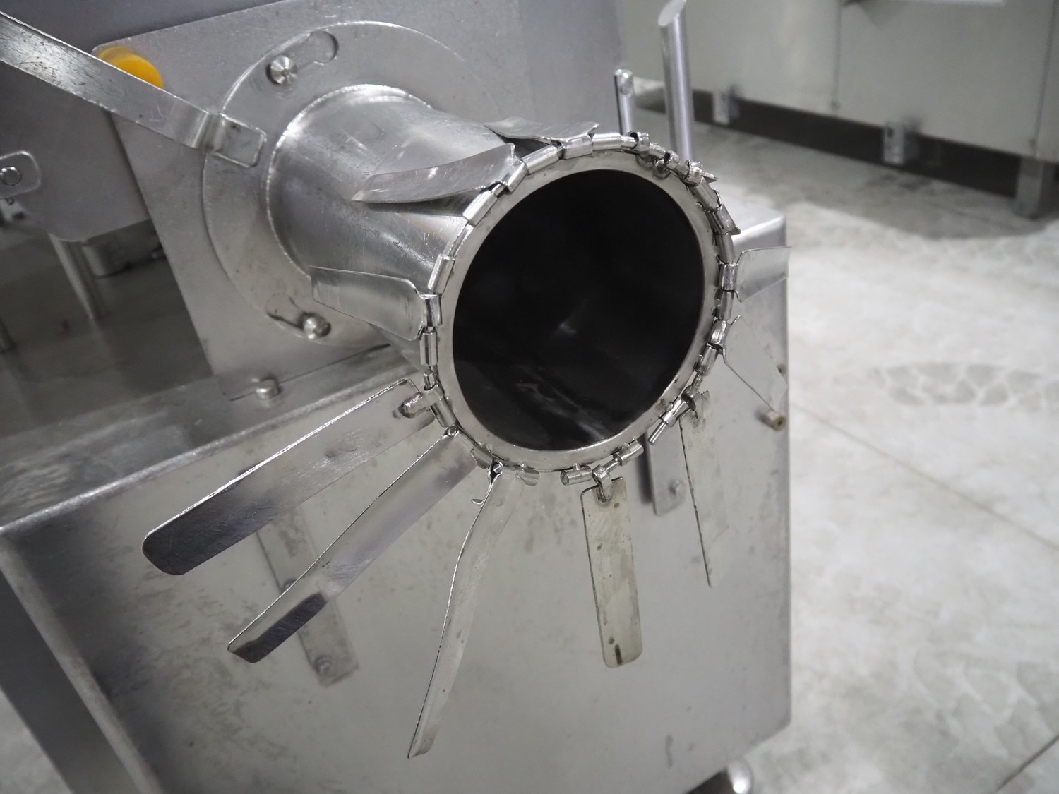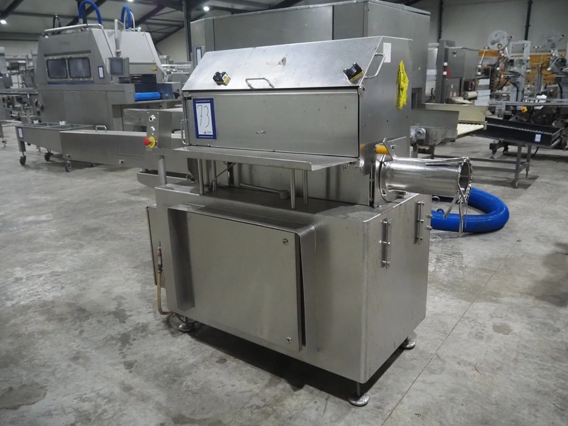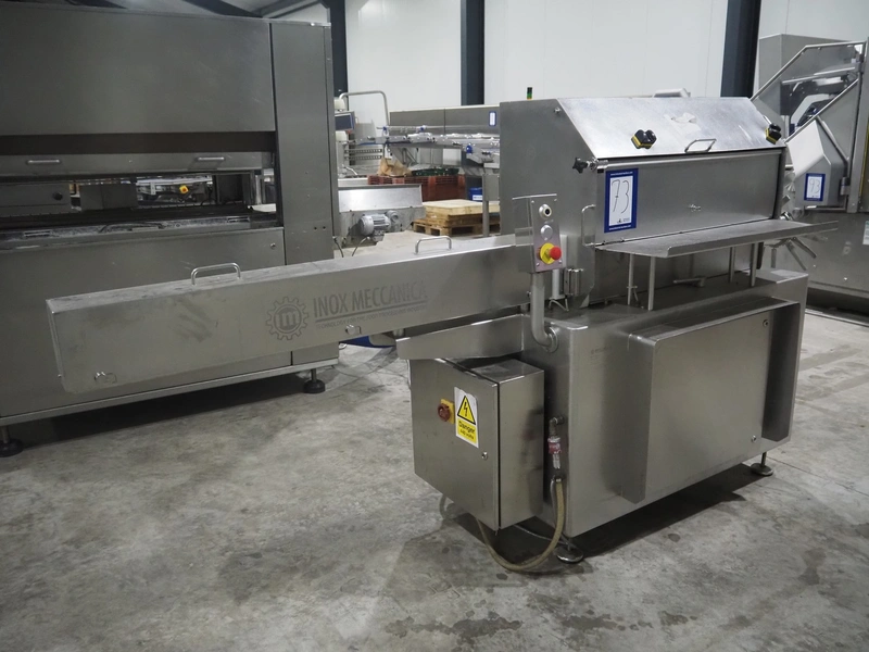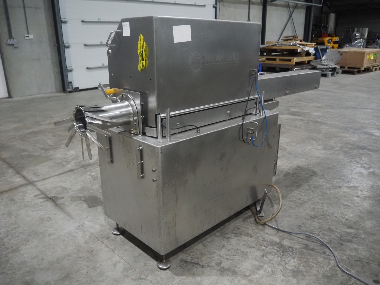 Inox Meccanica meat press, output diameter: 135 mm, total dimensions: 2950 mm x 1100 mm x 1530 mm.