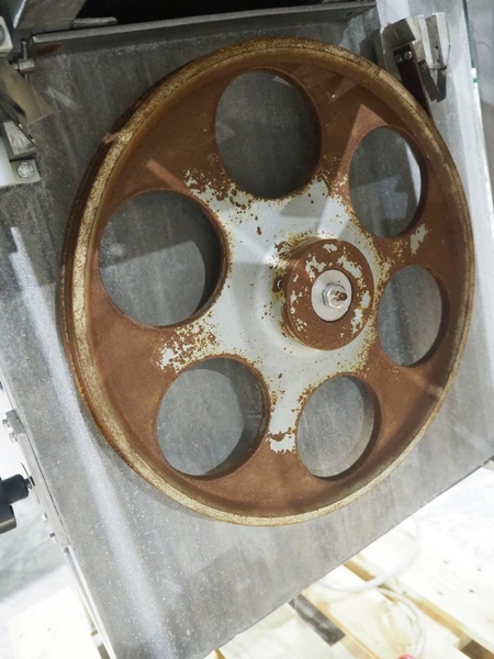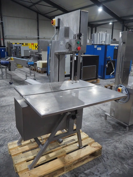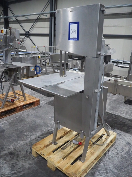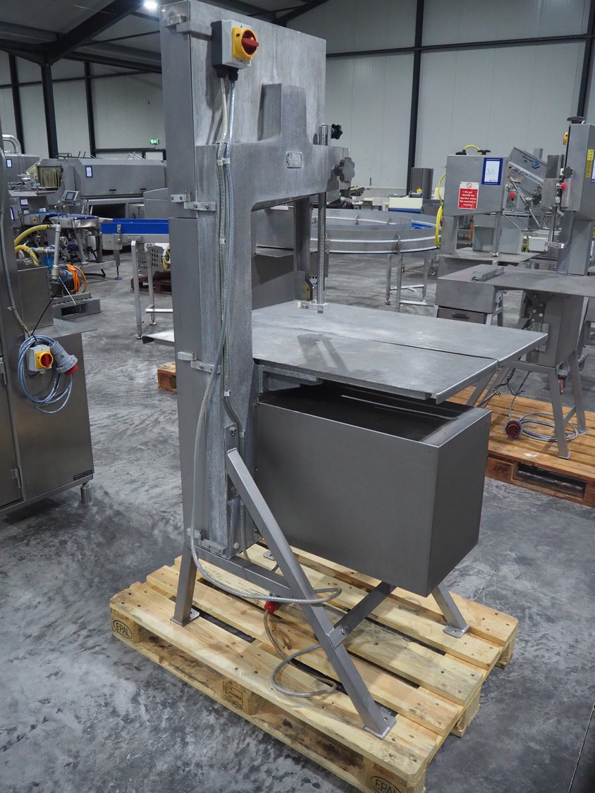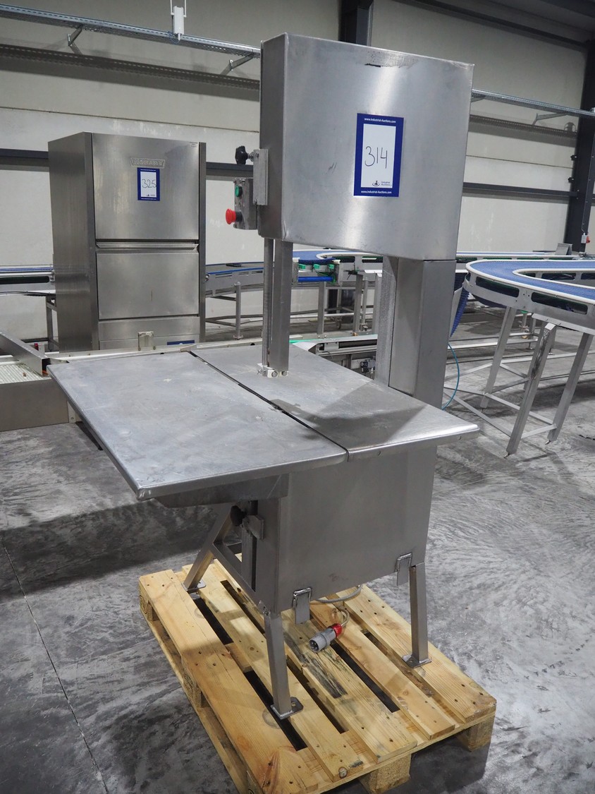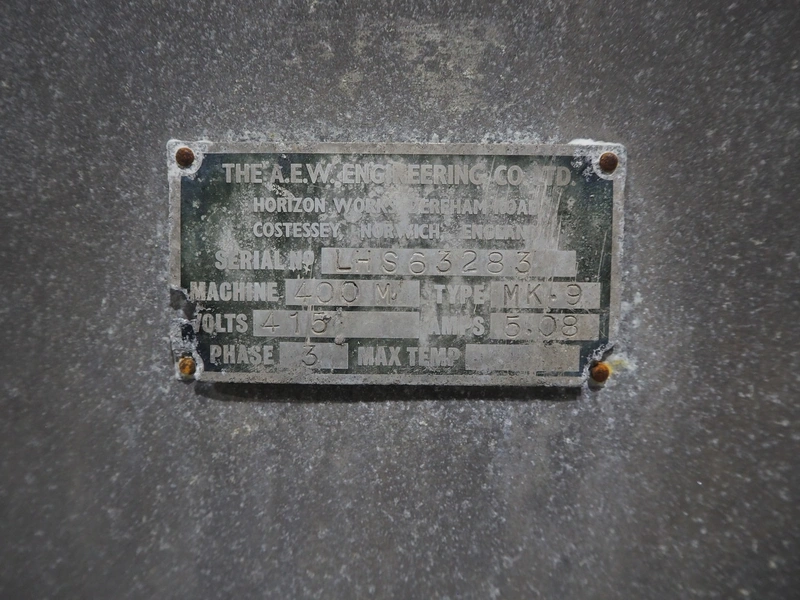 The A.E.W. Engineering band saw, type: MK9, machine: 400M, serial number: LHS63283, 415 V, 3 Ph, 5.08 A, table dimensions: 1050 mm x 880 mm, total dimensions: 1050 mm x 1000 mm x 1880 mm. Incomplete, without saw.