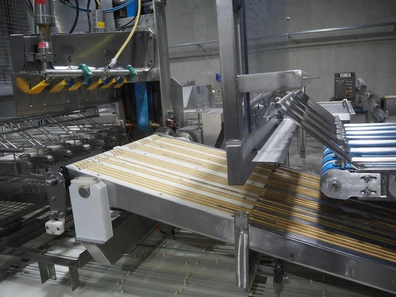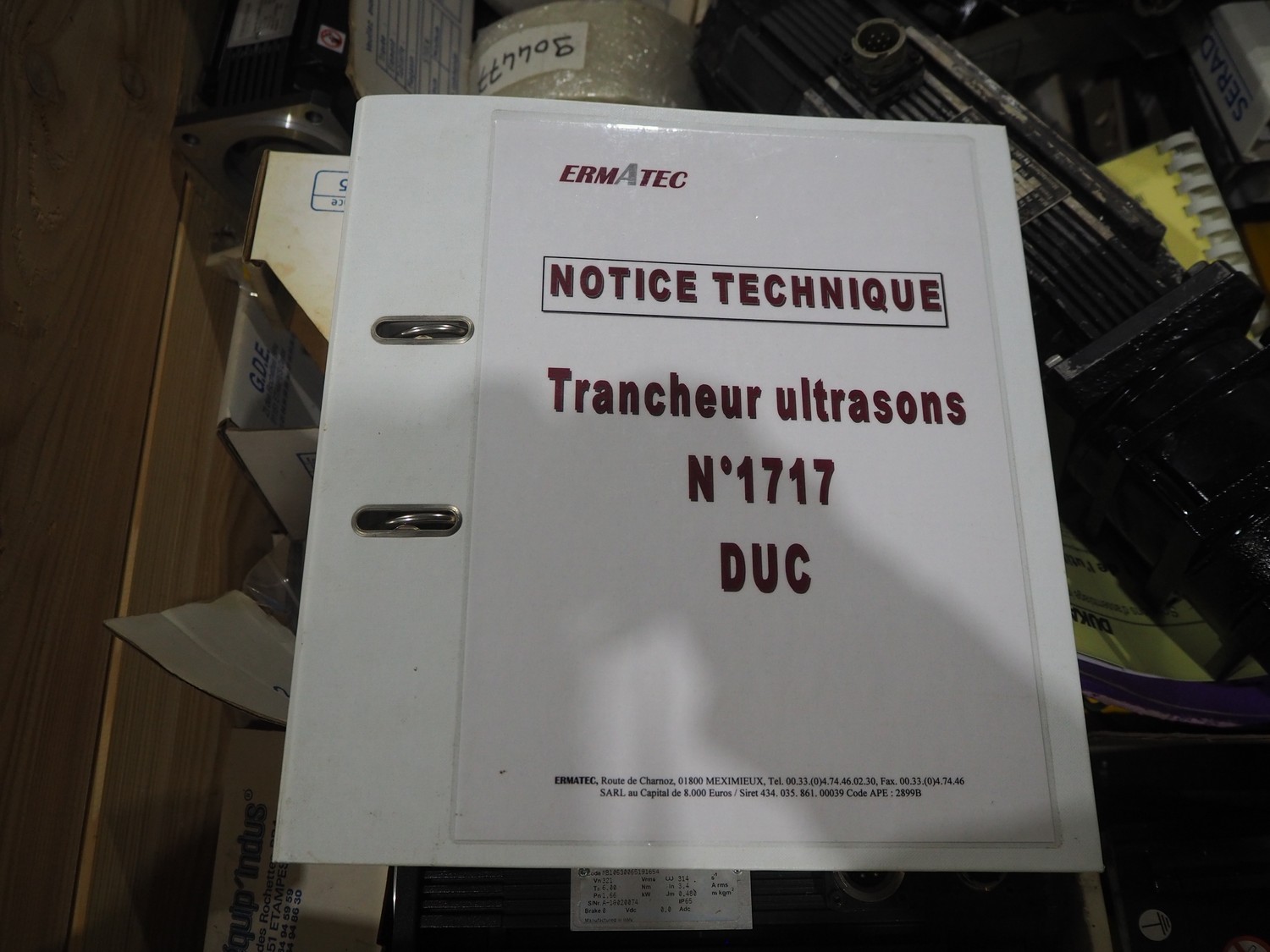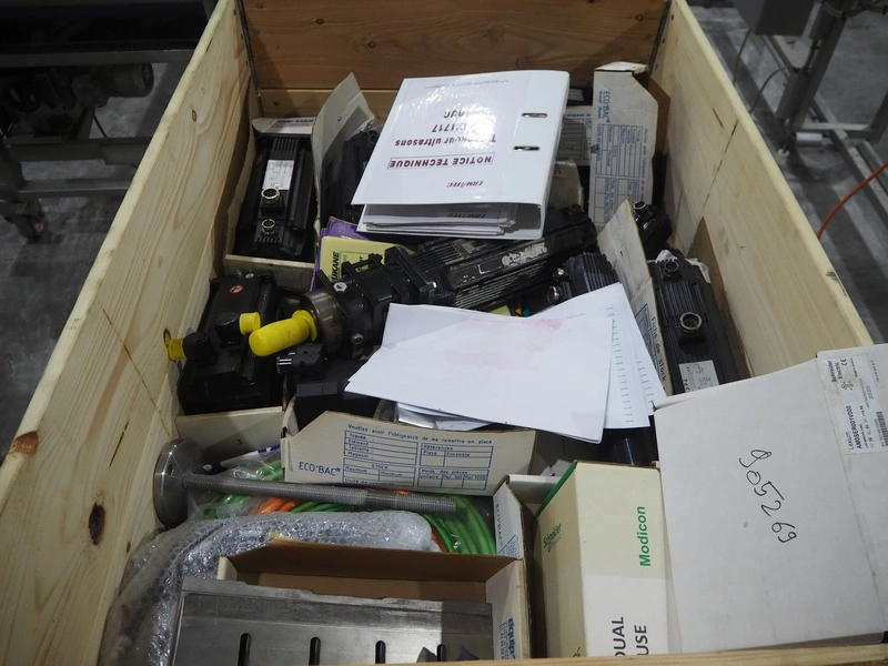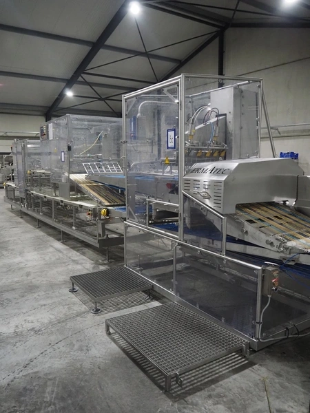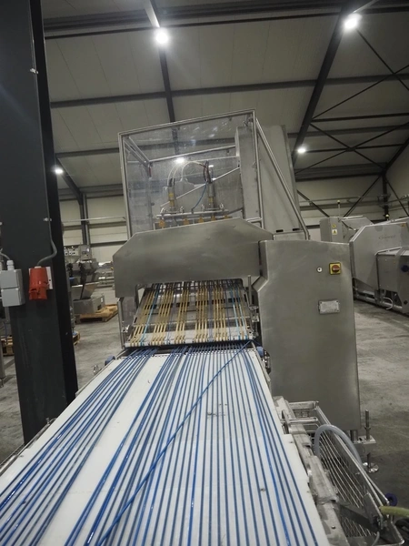 Ermatec ultrasonic slicing line used for cheese, type: 1717-19-12-08, serial number: Trancheur From, year of construction: 17/12/08, working width: 600 mm, 6 lanes, plastic belts, belt width: 75 mm, total dimensions: 13200 mm x 1900 mm x 2600 mm. Including pallet with various parts, dimensions: 1200 mm x 980 mm x 1120 mm.