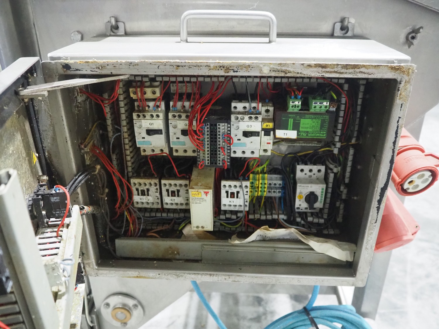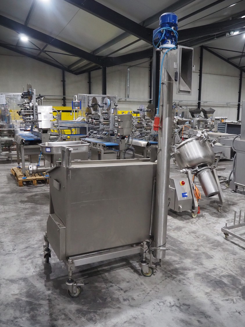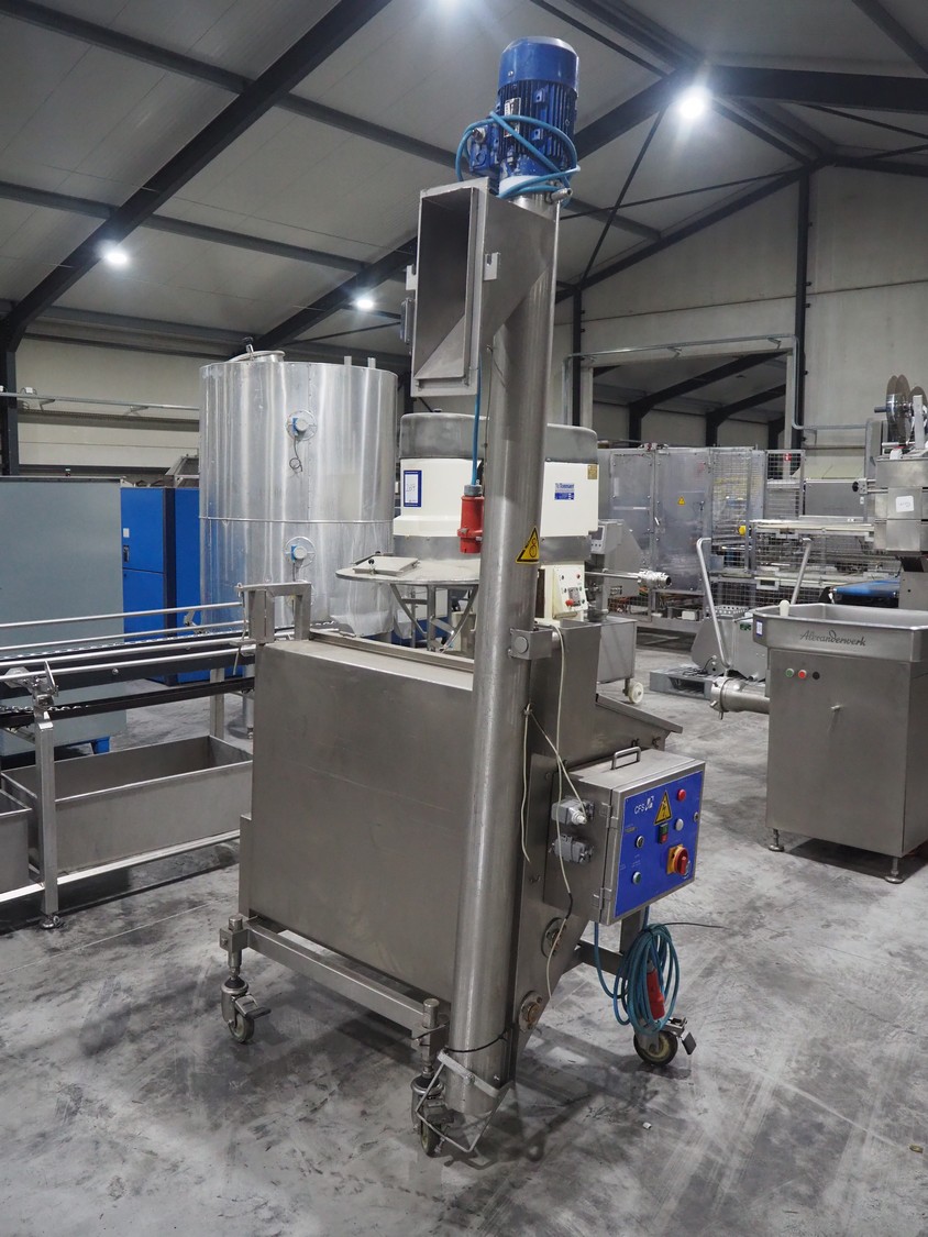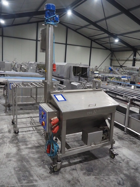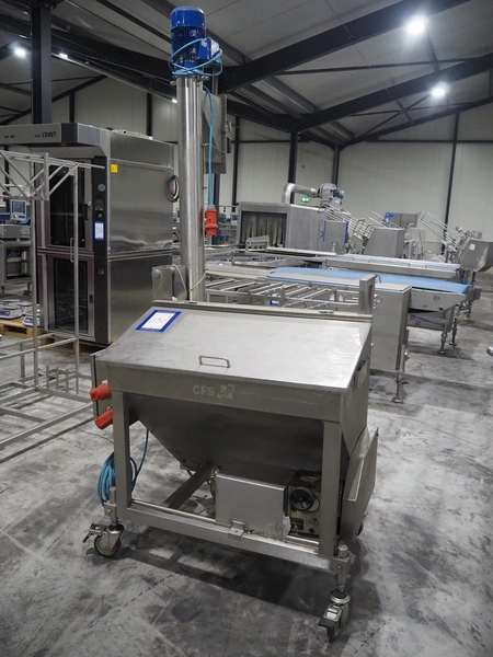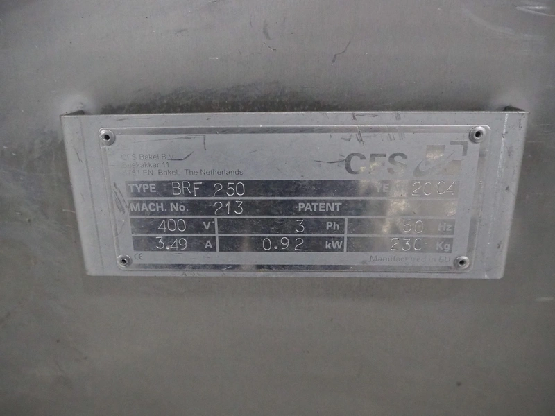 CFS mobile bunker for bread crumbs, type: BRF 250, machine number: 213, year of construction: 2004, 400 V, 3 Ph, 50 Hz, 3.49 A, 0.92 kW, weight: 230 kg, elevating height: 1860 mm, total dimensions: 1300 mm x 1000 mm x 2600 mm.