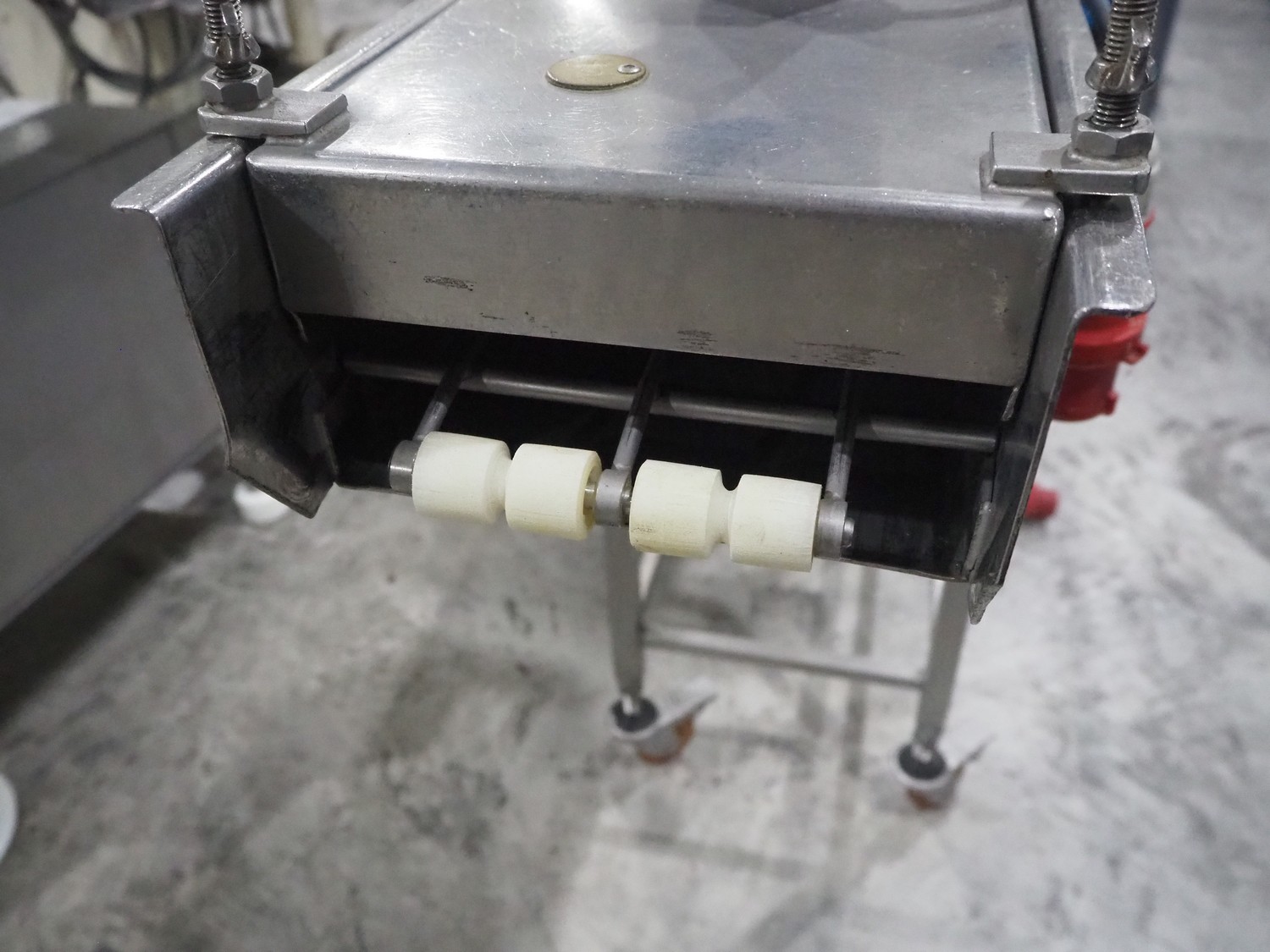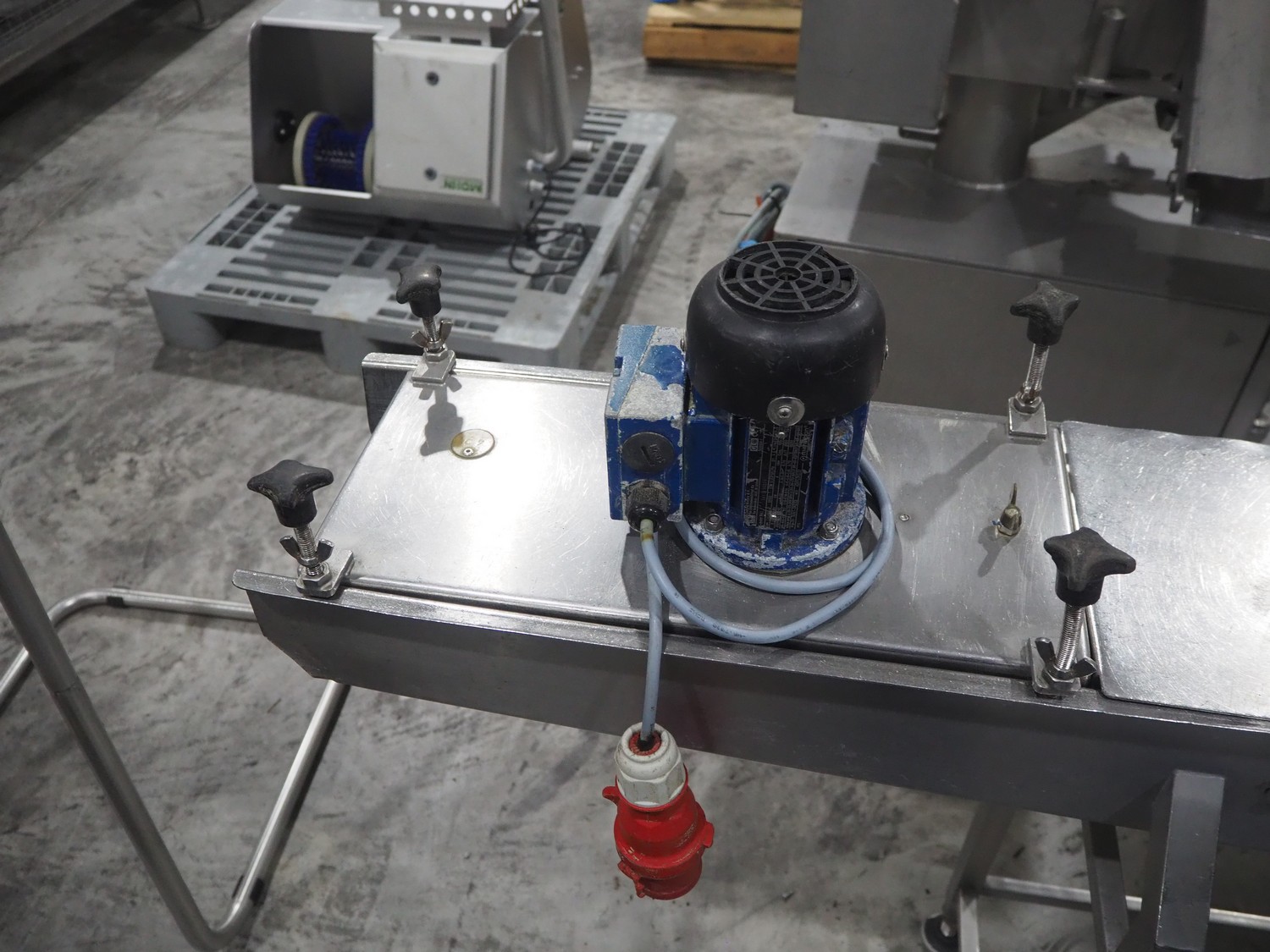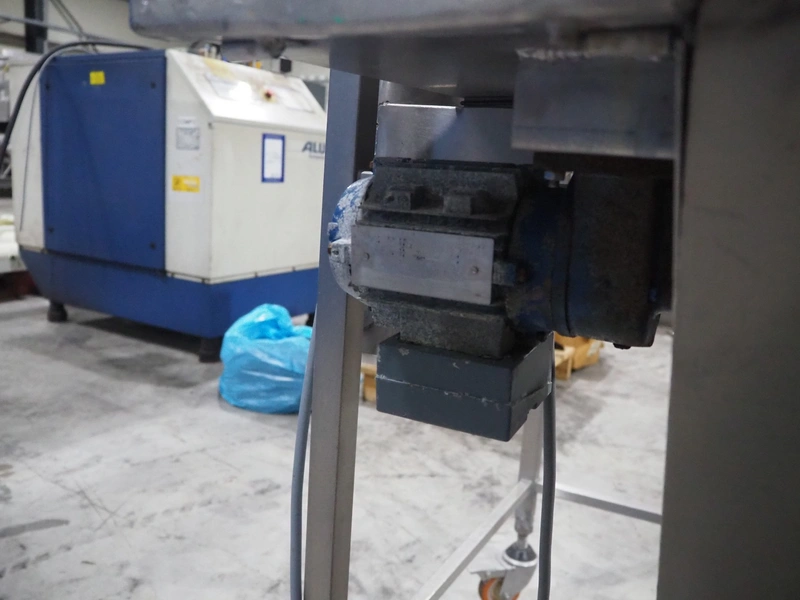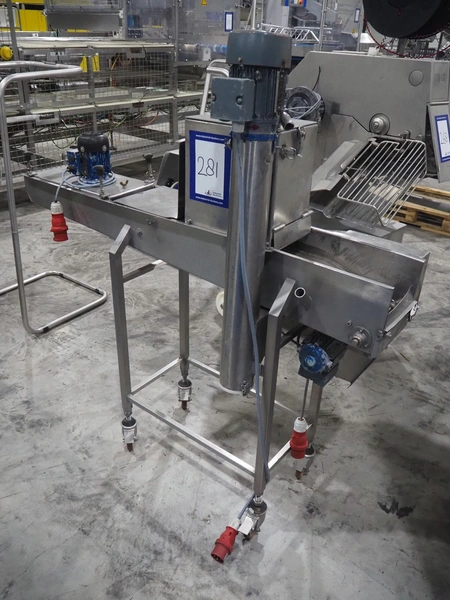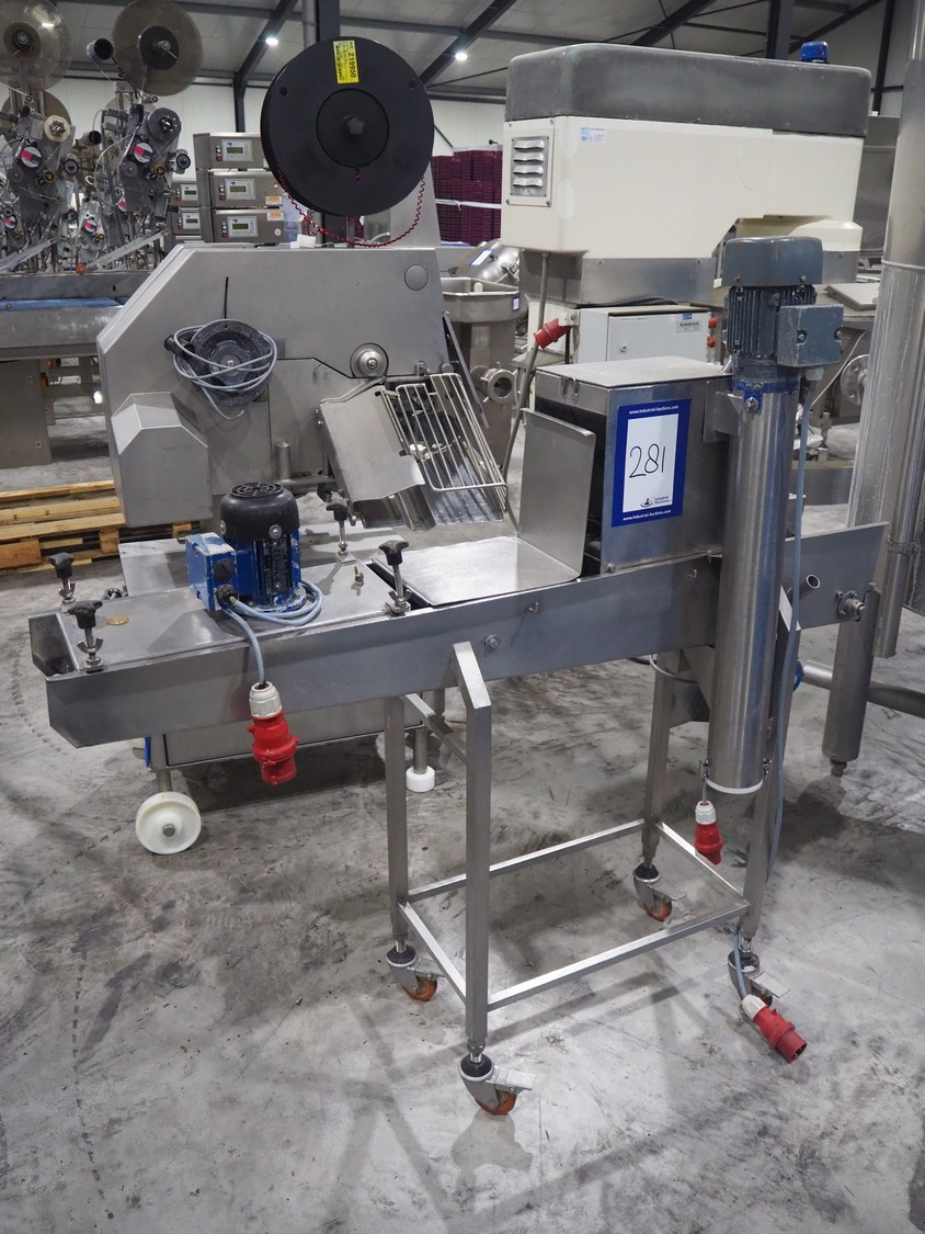 Koppens mobile breading machine, number: PR 200-44, 380 V, 3 Ph, 50 Hz, 3.7 A, 0.61 kW, weight: 135 kg, maximum belt width: 200 mm, clearance: 210 mm x 60 mm, total dimensions: 1550 mm x 500 mm x 1520 mm. Without belt.