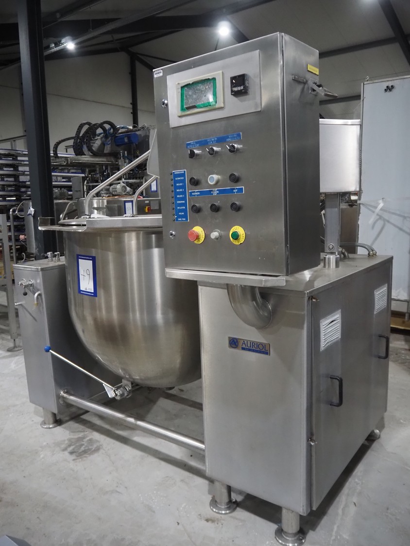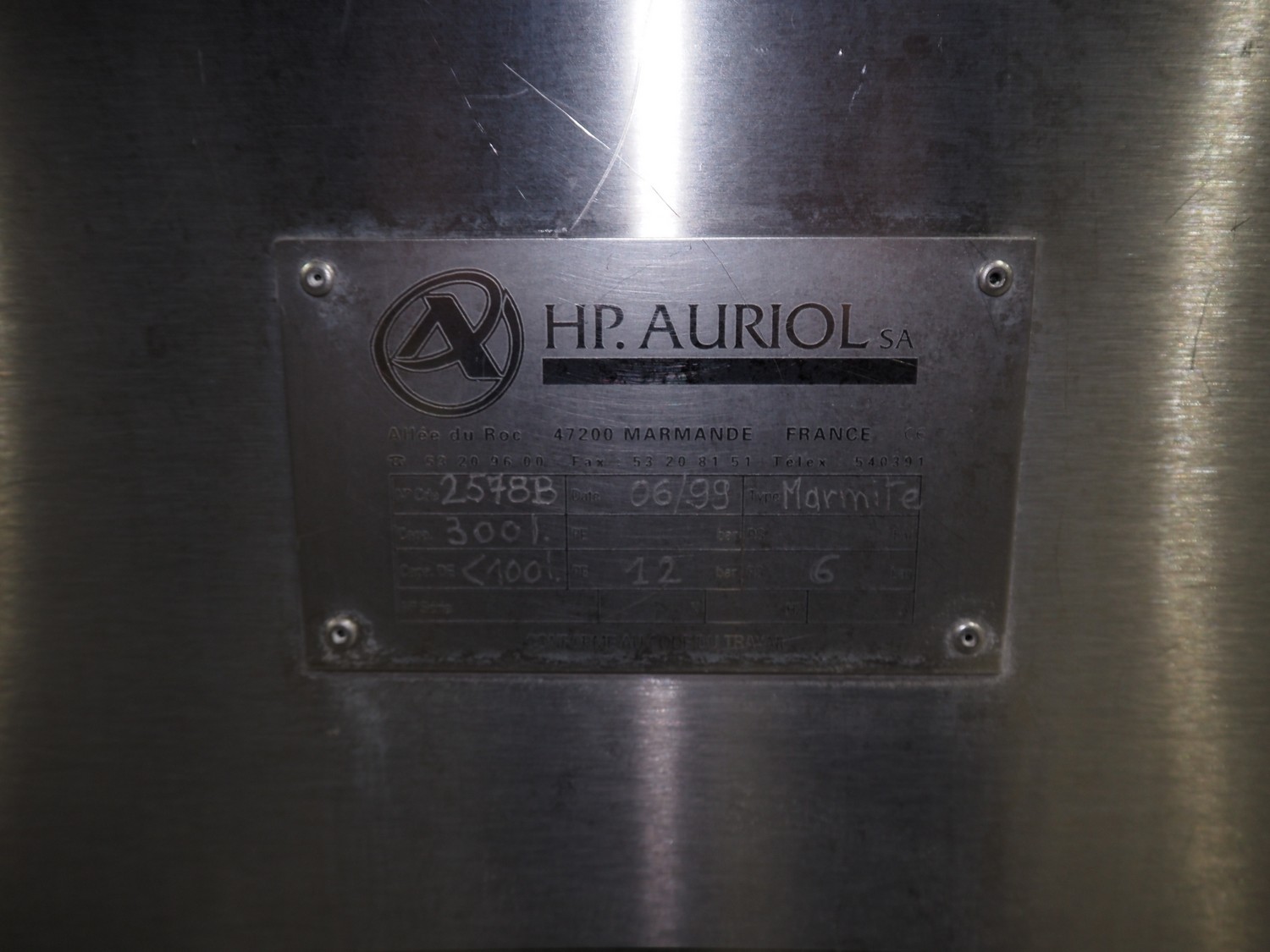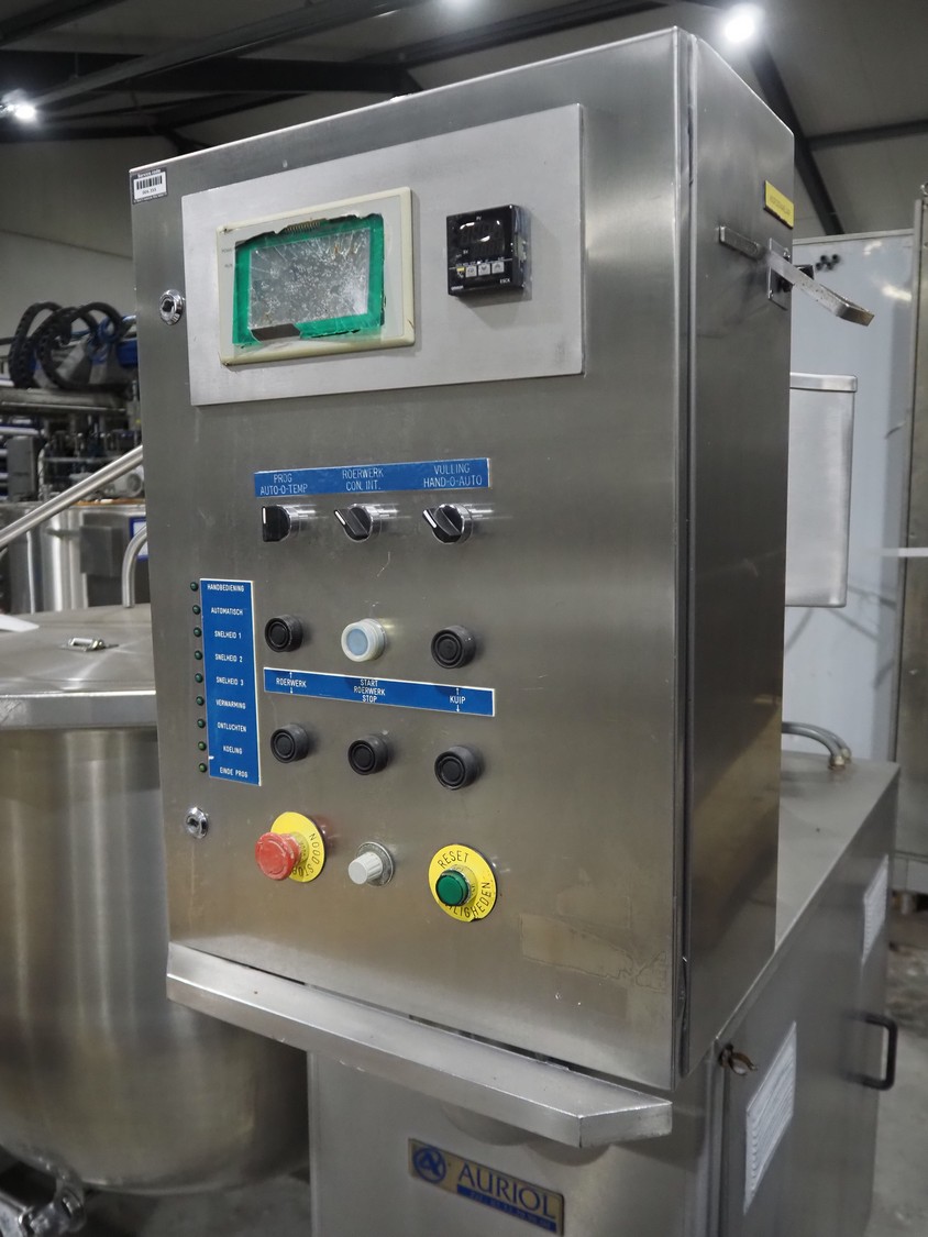 HP. Auriol cooking vessel with mixing arm and scrapers, number: 2578 B, year of construction: 07/1999, 380 V, 50 Hz, volume: 300 liter, dimensions: 1950 mm x 1400 mm x 1870 mm. Control panel broken