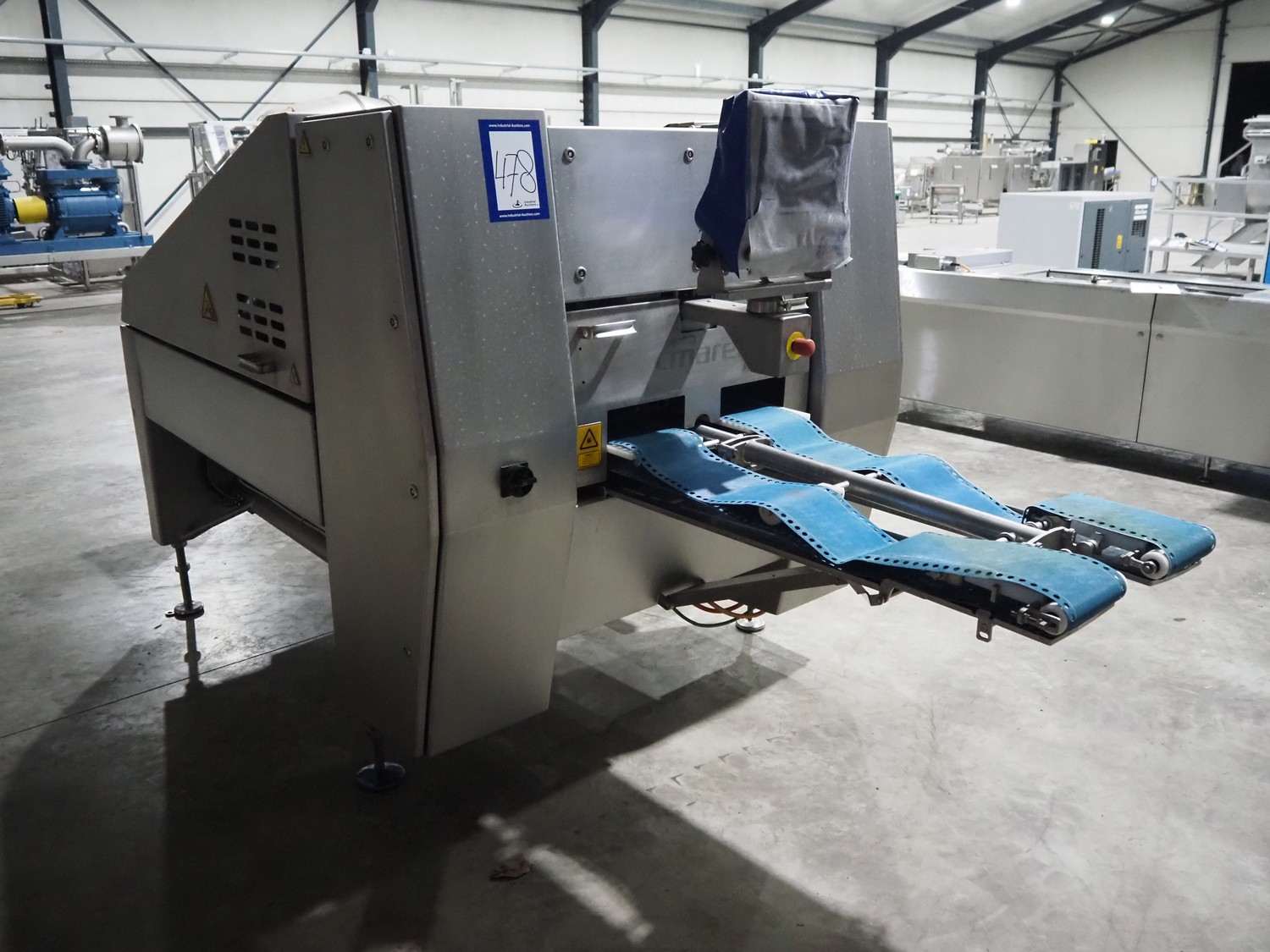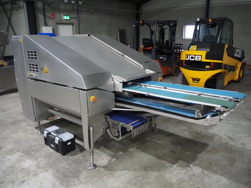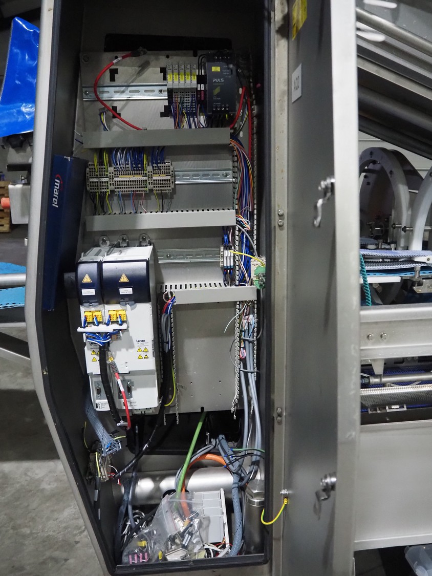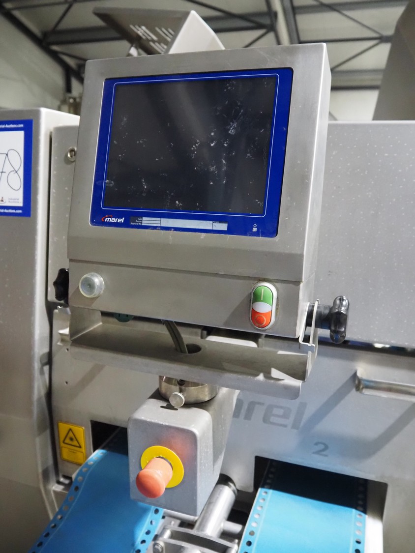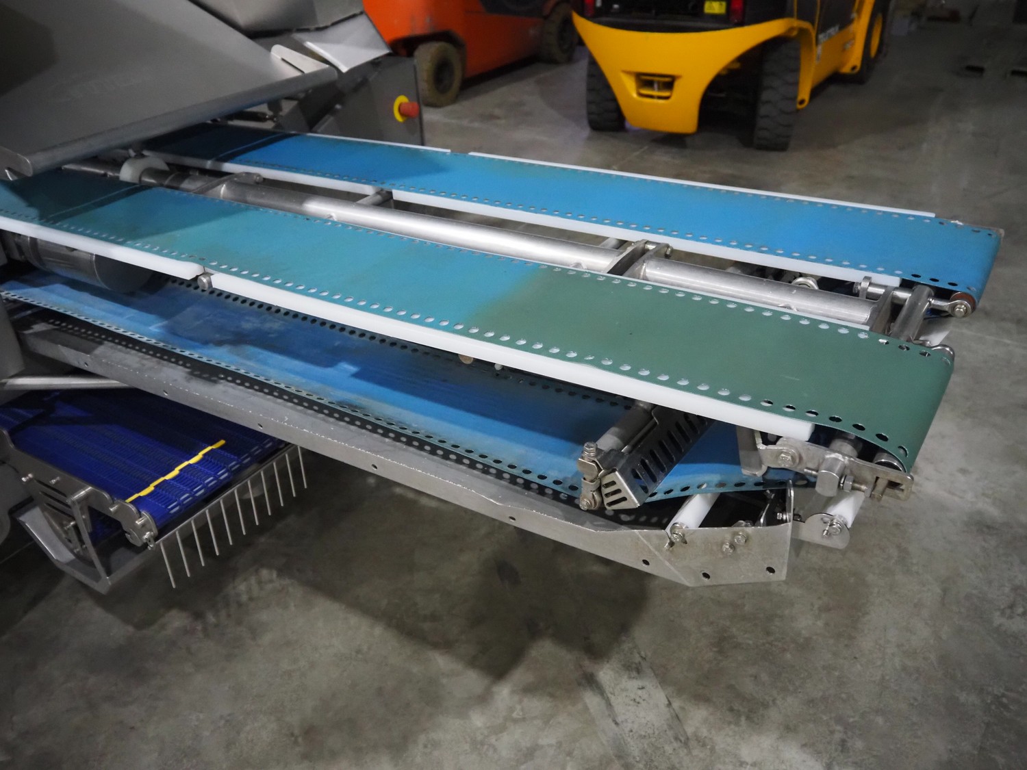 Marel Portion cutter, type: LR0325, model: I-Cut122, serial number: 10431550, year of construction: 2019, 380/480 V, 3 Ph, 50/60 Hz, 1 A, plastic belt, belt width: (2x) 200 mm, total dimenions: 4350 mm x 1520 mm x 1600 mm. Incomplete, technical condition unknown.