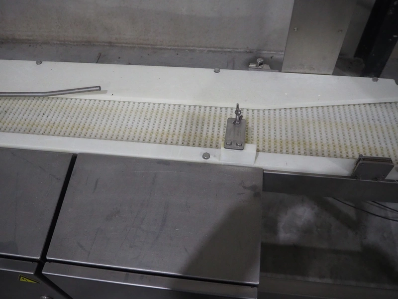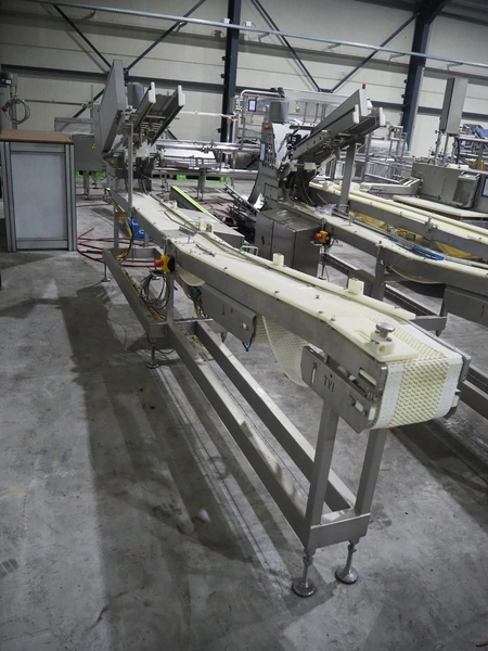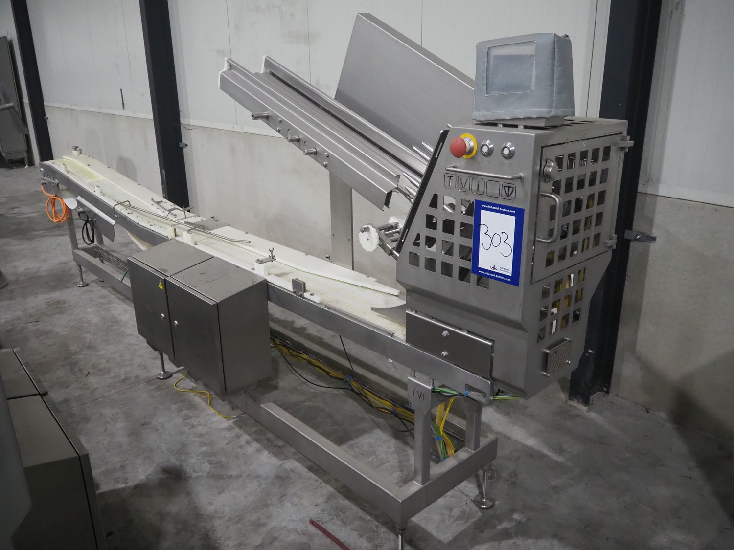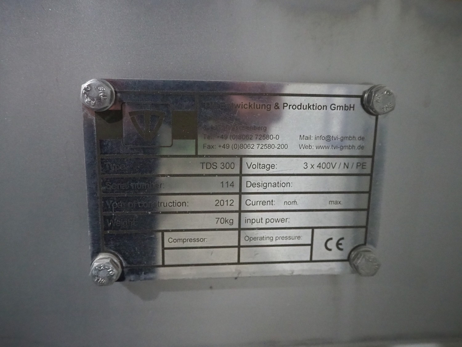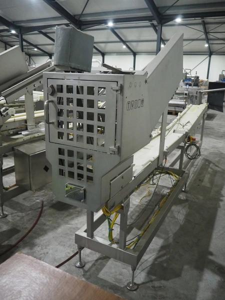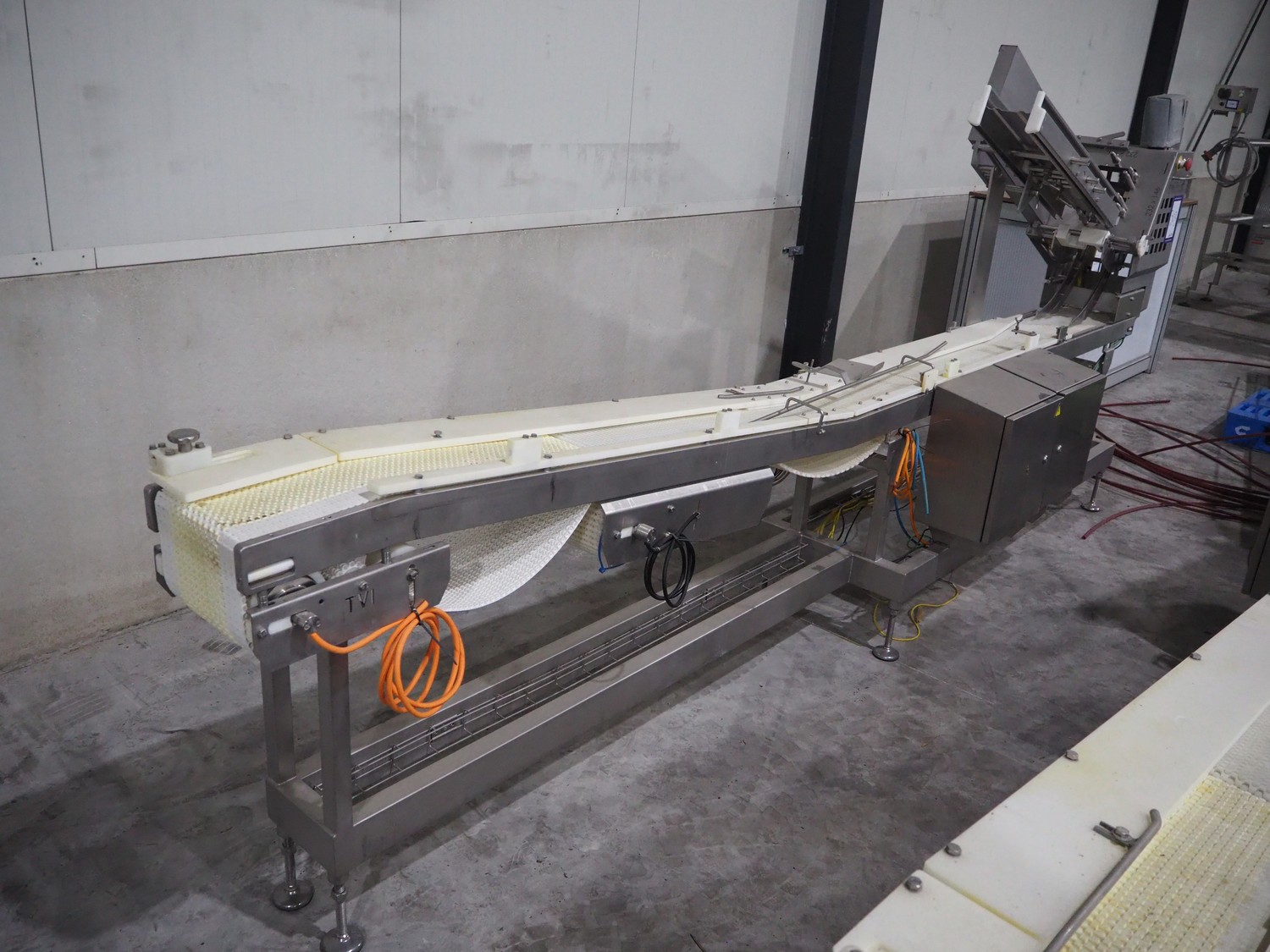 TVI Entwicklung & Produktion GmbH tray denester, type: TDS 300, serial number: 114, year of construction: 2012, 400 V, 3 Ph, weight: 70 Kg, dye: 232 mm x 146 mm, plastic mesh belt, belt width: 250 mm, total dimensions: 4350 mm x 1000 mm x 1800 mm.