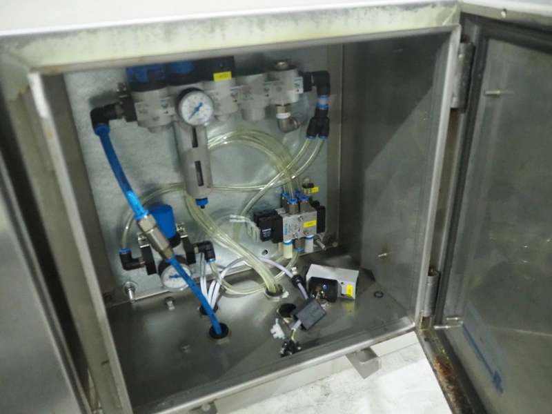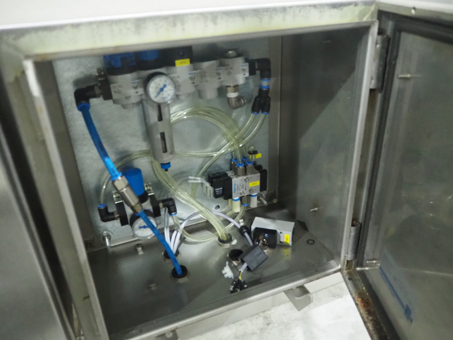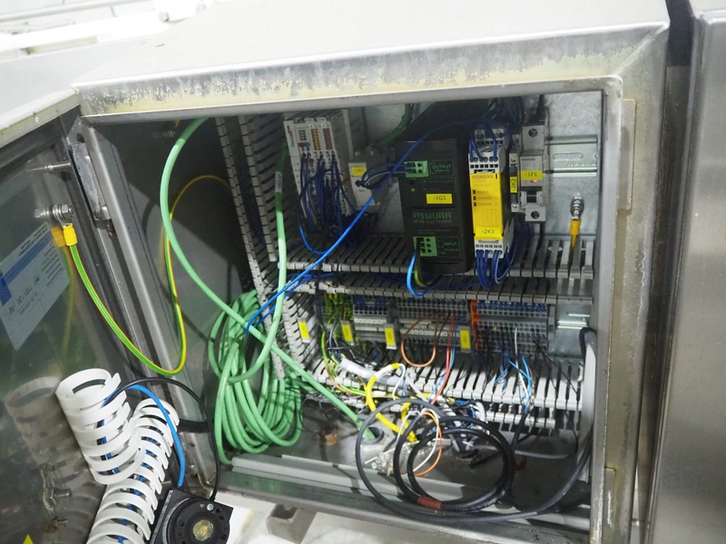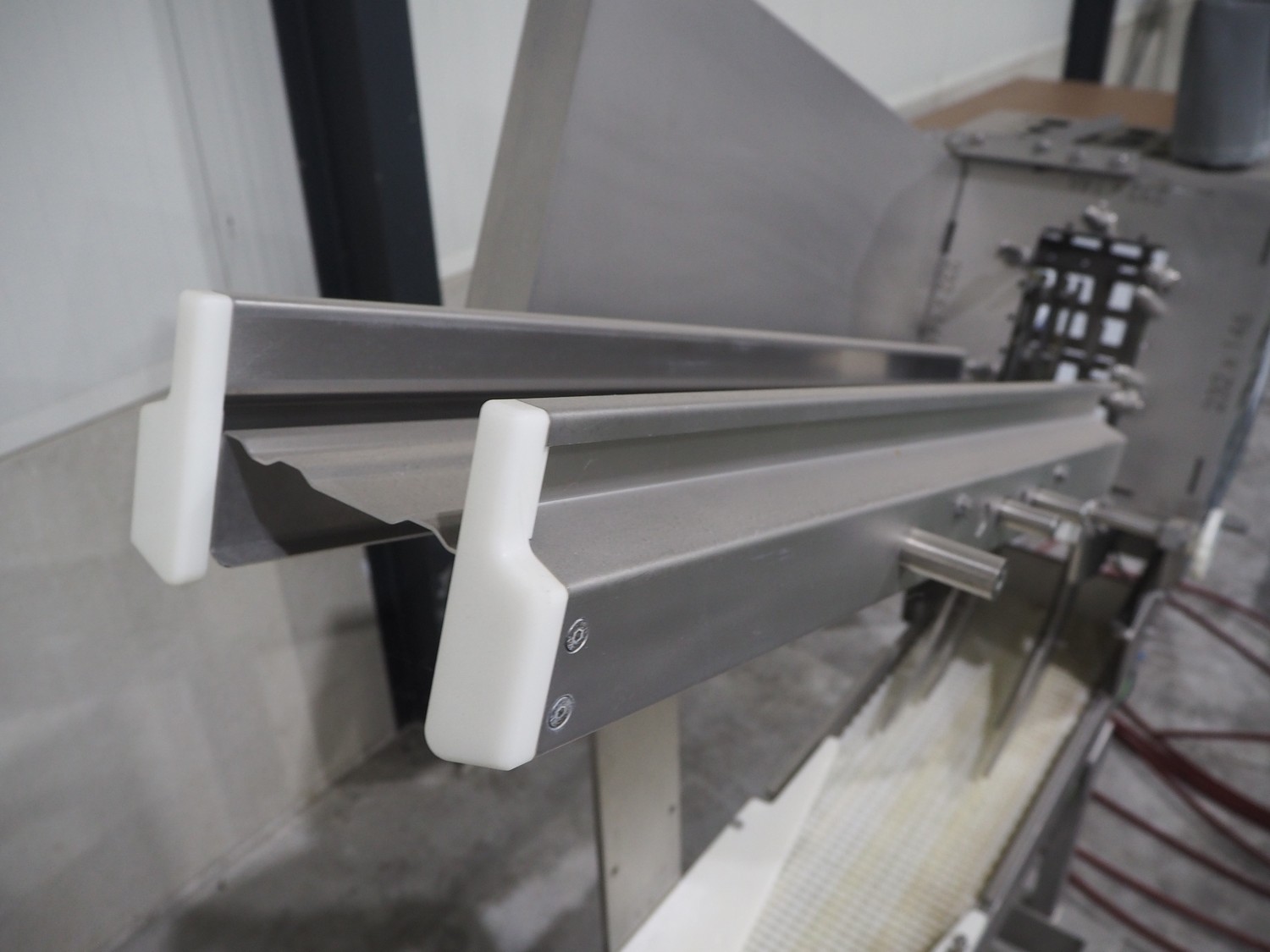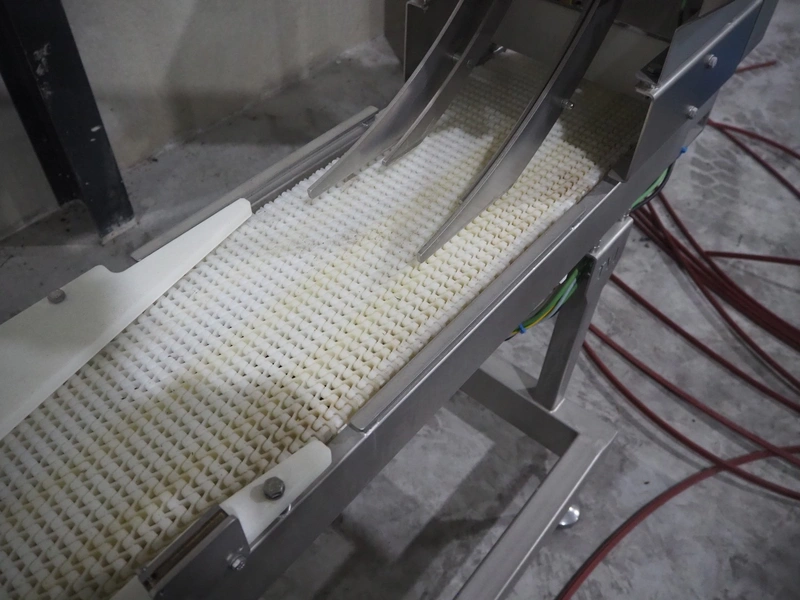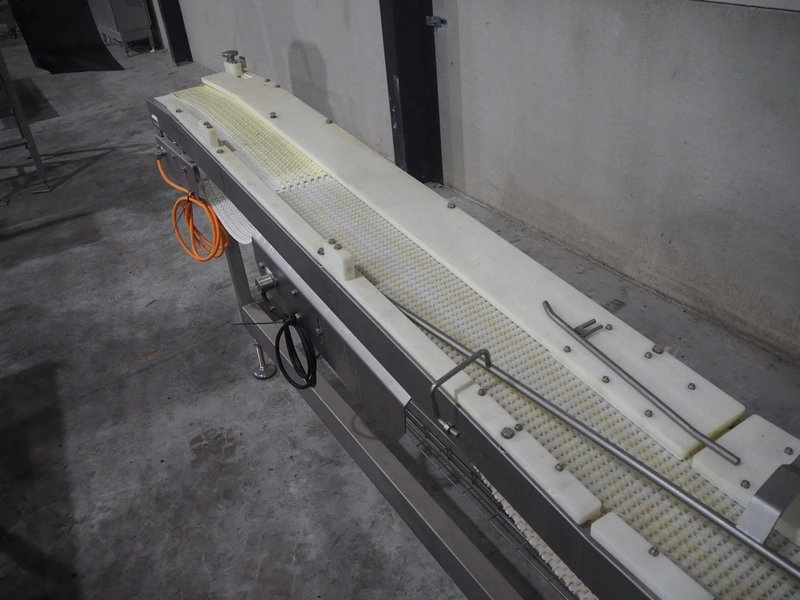 TVI Entwicklung & Produktion GmbH tray denester, type: TDS 300, serial number: 114, year of construction: 2012, 400 V, 3 Ph, weight: 70 Kg, dye: 232 mm x 146 mm, plastic mesh belt, belt width: 250 mm, total dimensions: 4350 mm x 1000 mm x 1800 mm.