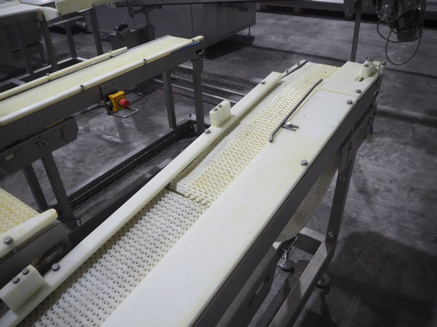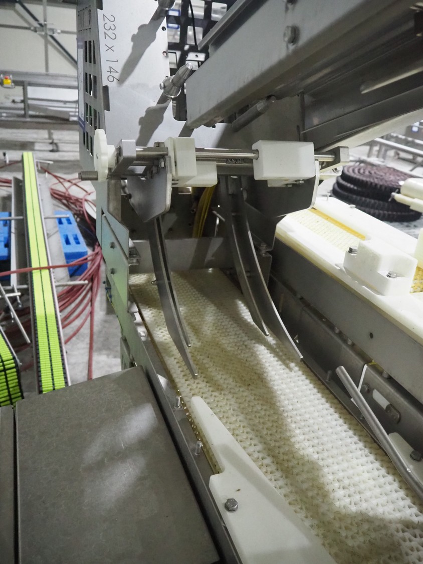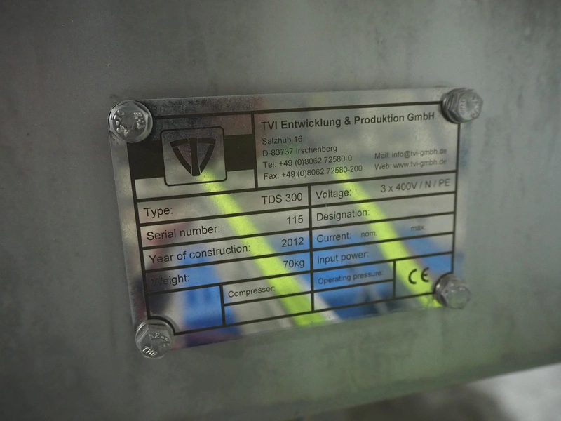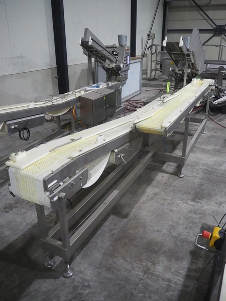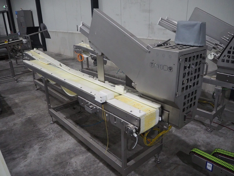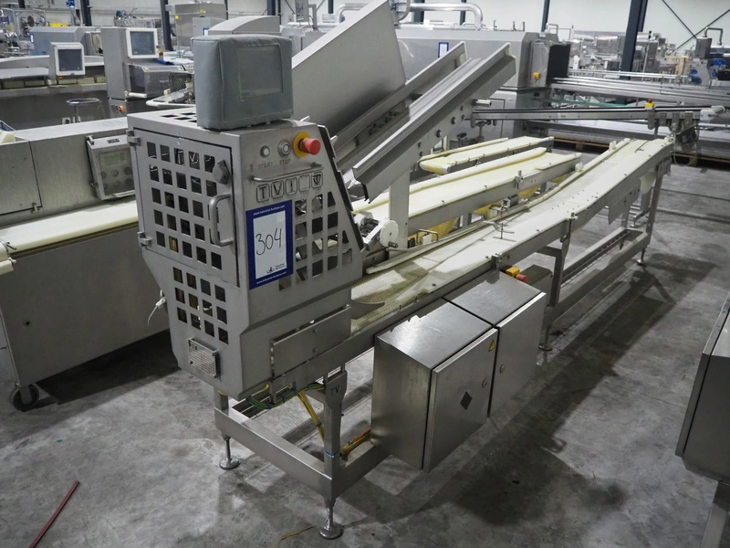 TVI Entwicklung & Produktion GmbH tray denester, type: TDS 300, serial number: 115, year of construction: 2012, 400 V, 3 Ph, weight: 70 Kg, dye: 232 mm x 146 mm, plastic mesh belt, belt width: 250 mm, total dimensions: 4350 mm x 1000 mm x 1800 mm.