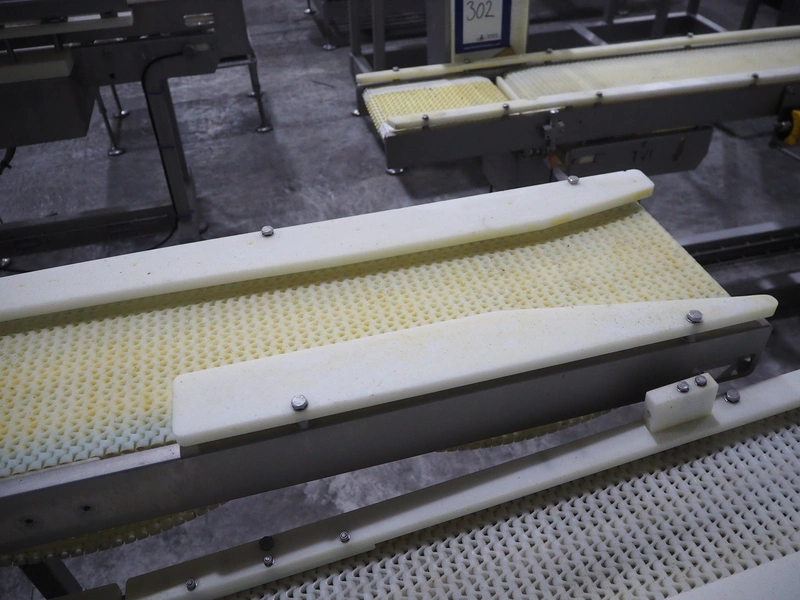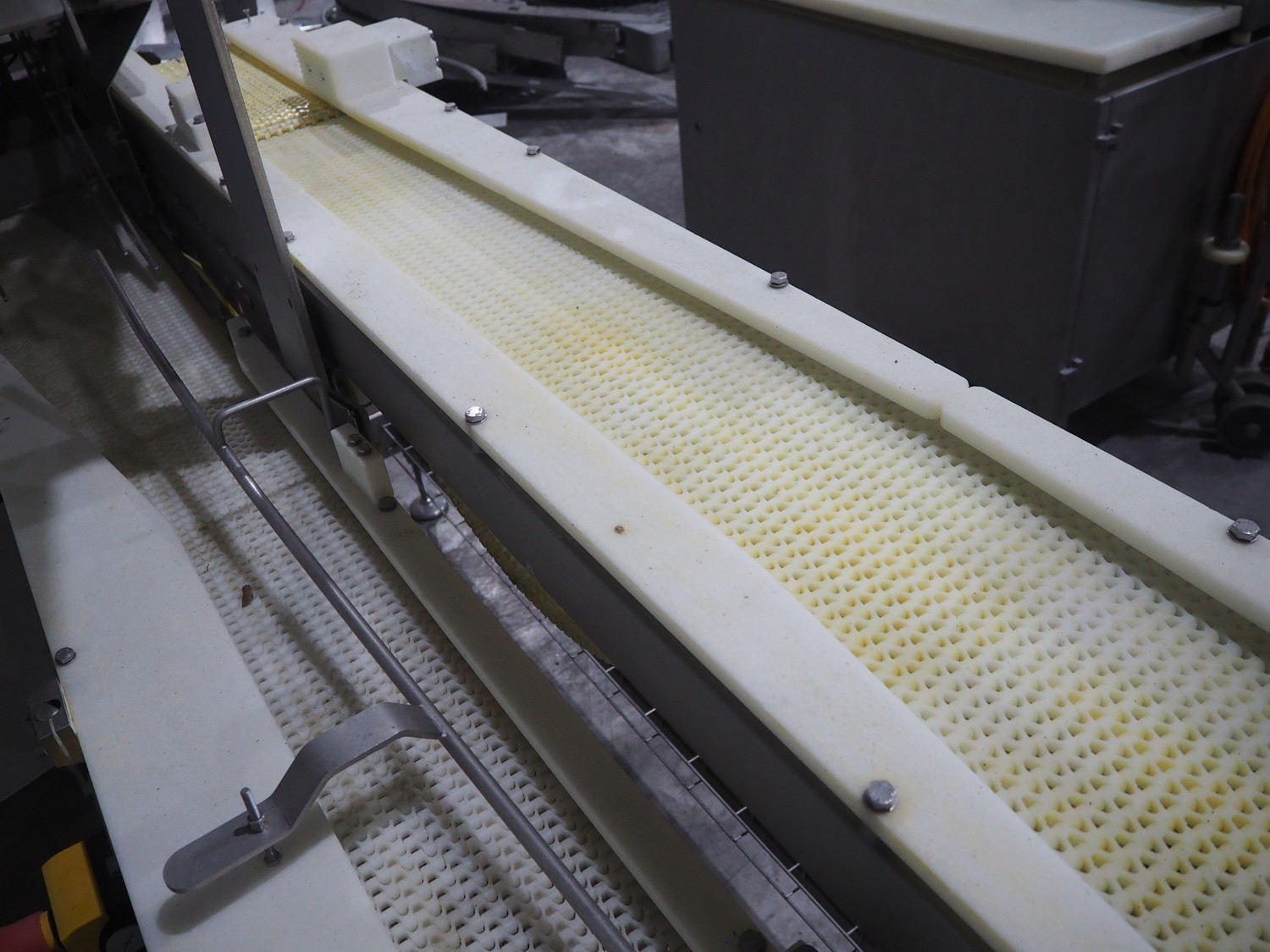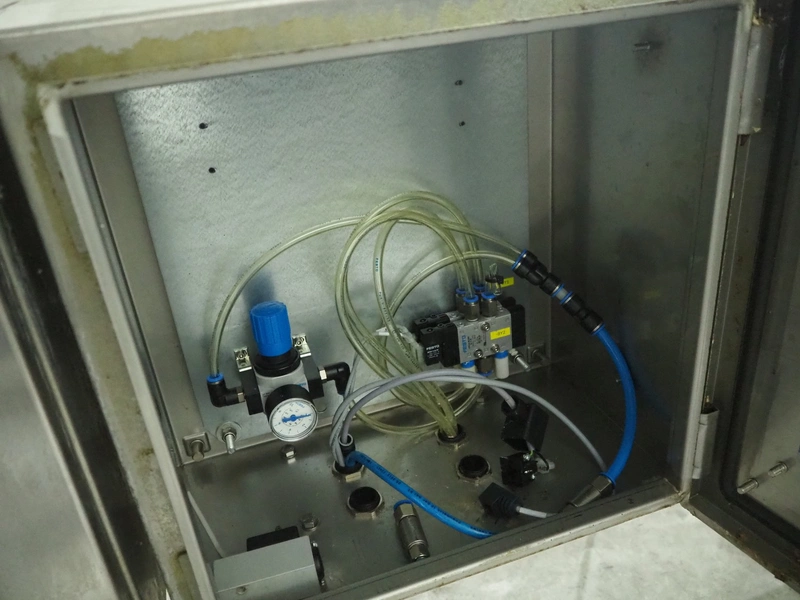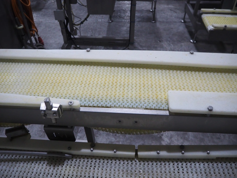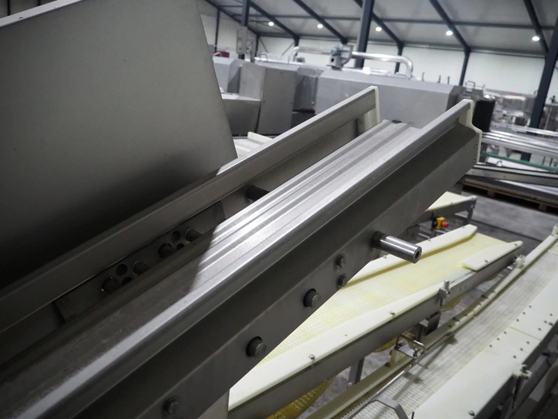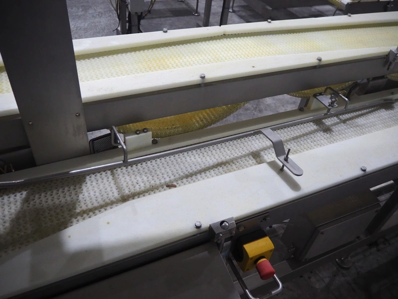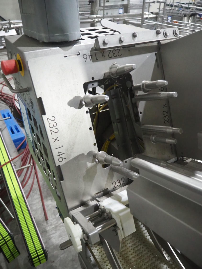 TVI Entwicklung & Produktion GmbH tray denester, type: TDS 300, serial number: 115, year of construction: 2012, 400 V, 3 Ph, weight: 70 Kg, dye: 232 mm x 146 mm, plastic mesh belt, belt width: 250 mm, total dimensions: 4350 mm x 1000 mm x 1800 mm.