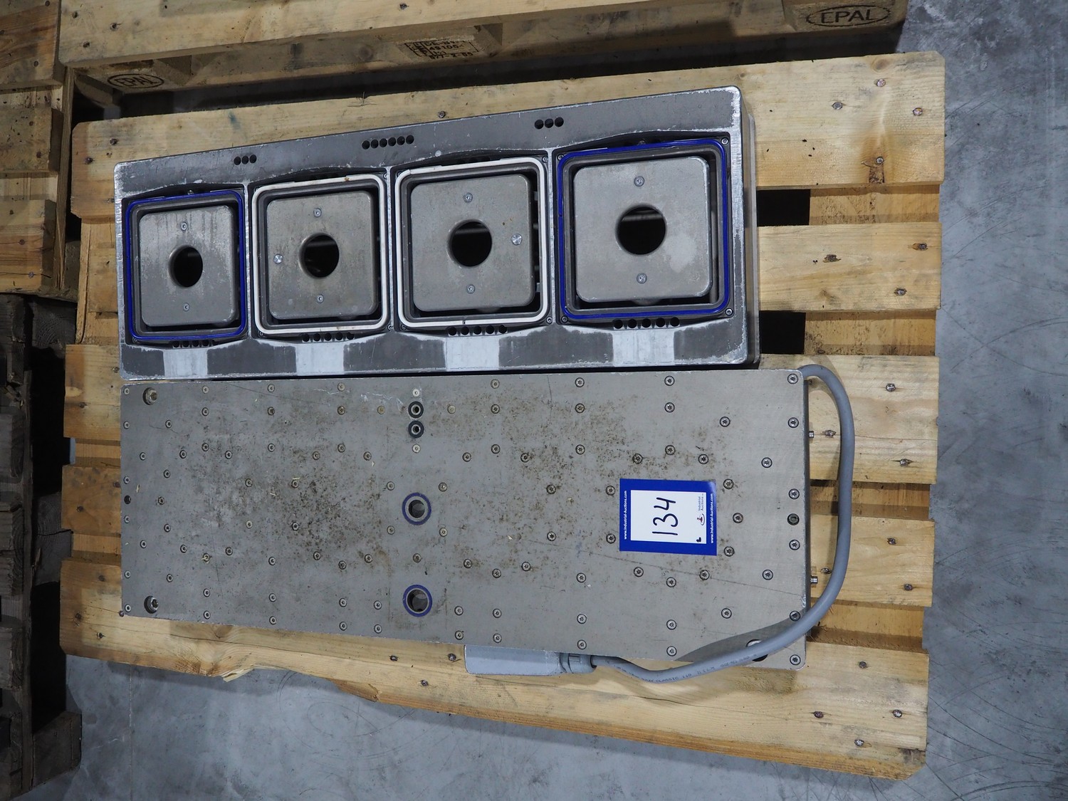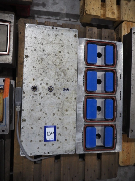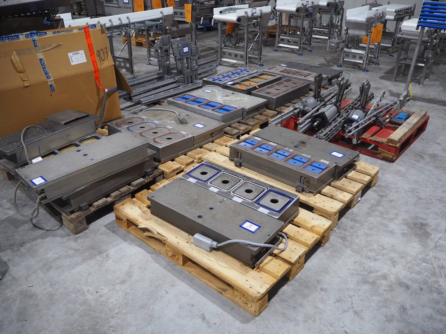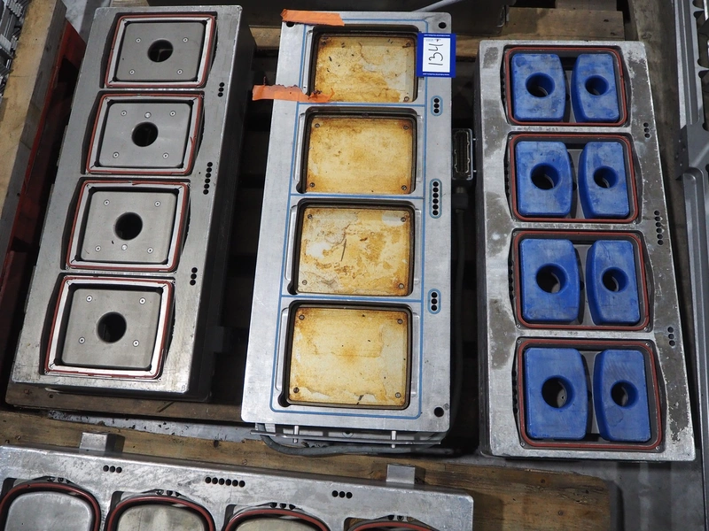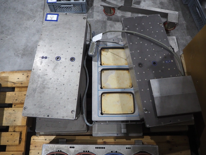 8 pallets with dyes for Ishida traysealer, dimensions: (4x) 210 mm x 160 mm, (4x) 245 mm x 155 mm, (4x) 205 mm x 165 mm, (4x) 200 mm x 160 mm, (5x) 170 mm x 120 mm, (4x) 165 mm x 165 mm, (4x) 245 mm x 160 mm, (3x) Ø 180 mm, (3x) 280 mm x 190 mm, (3x) 230 mm x 150 mm. Including pallet with grippers.