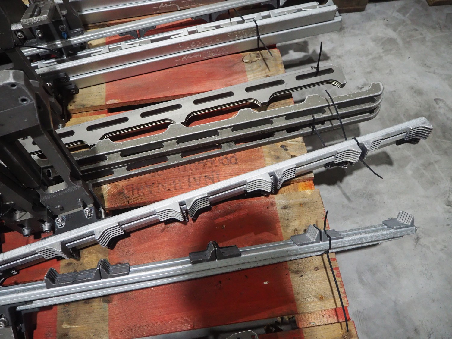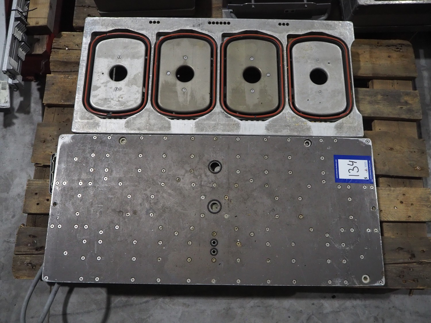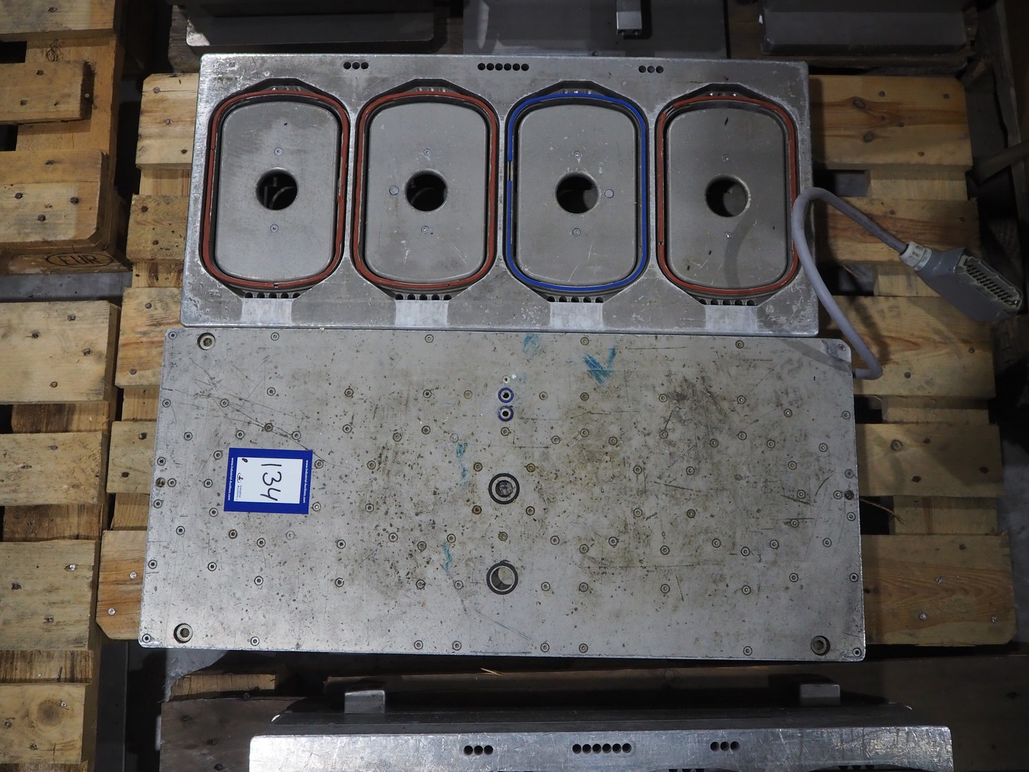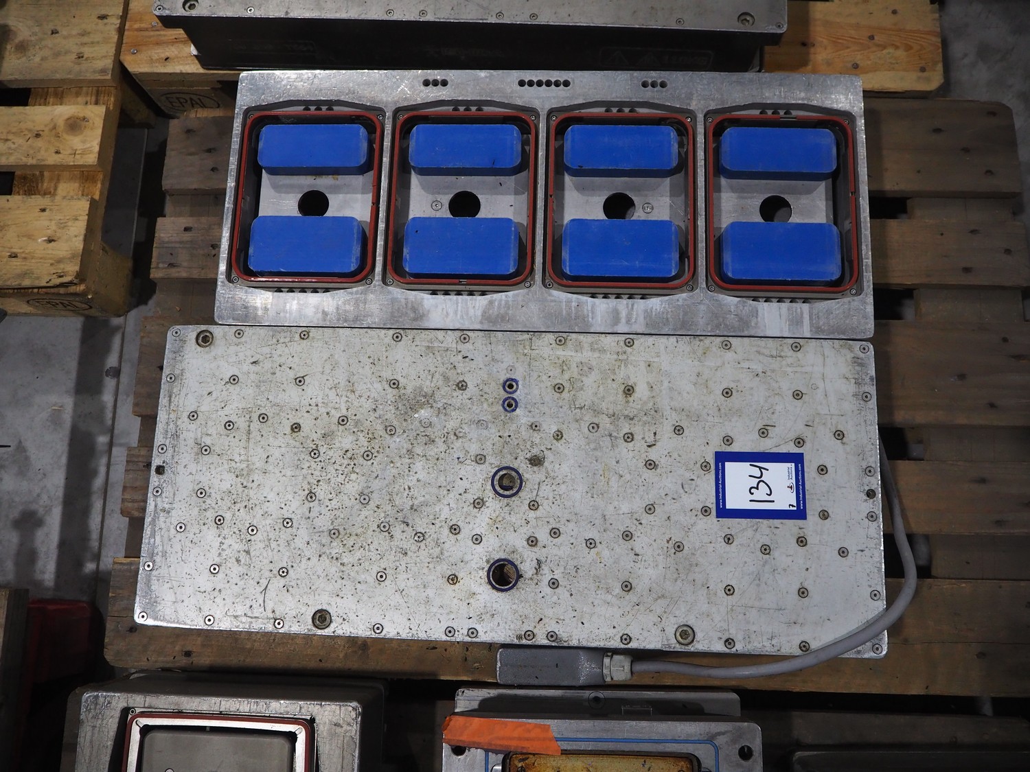 8 pallets with dyes for Ishida traysealer, dimensions: (4x) 210 mm x 160 mm, (4x) 245 mm x 155 mm, (4x) 205 mm x 165 mm, (4x) 200 mm x 160 mm, (5x) 170 mm x 120 mm, (4x) 165 mm x 165 mm, (4x) 245 mm x 160 mm, (3x) Ø 180 mm, (3x) 280 mm x 190 mm, (3x) 230 mm x 150 mm. Including pallet with grippers.