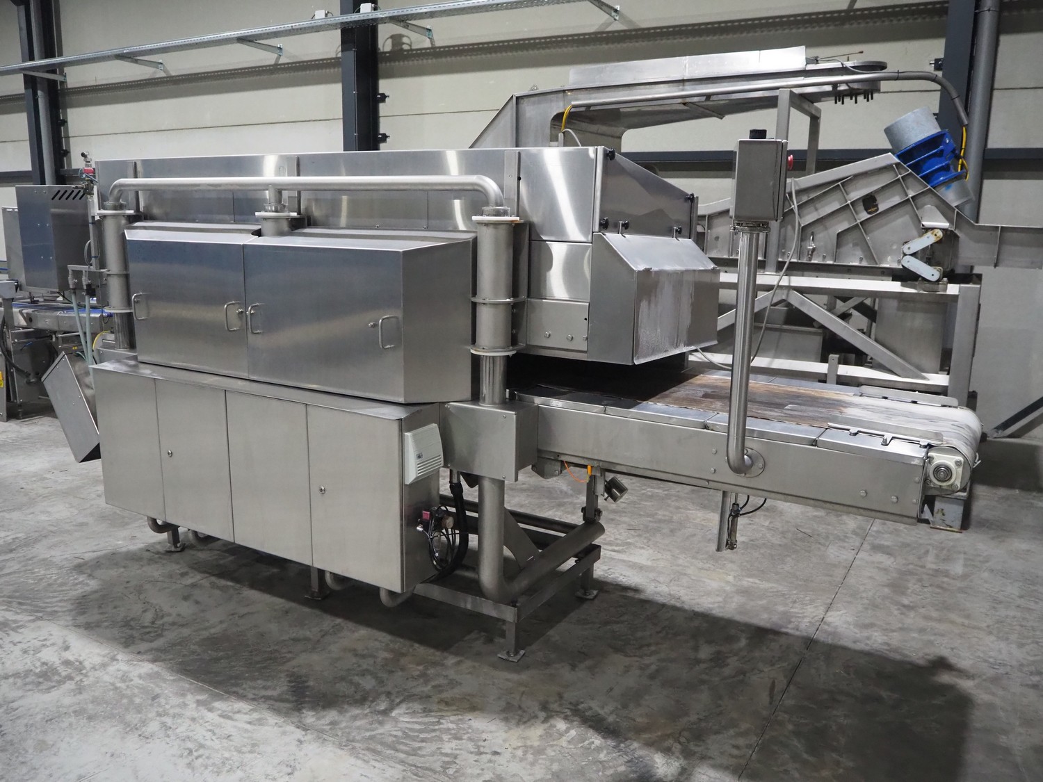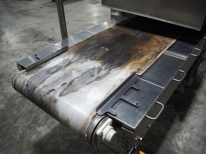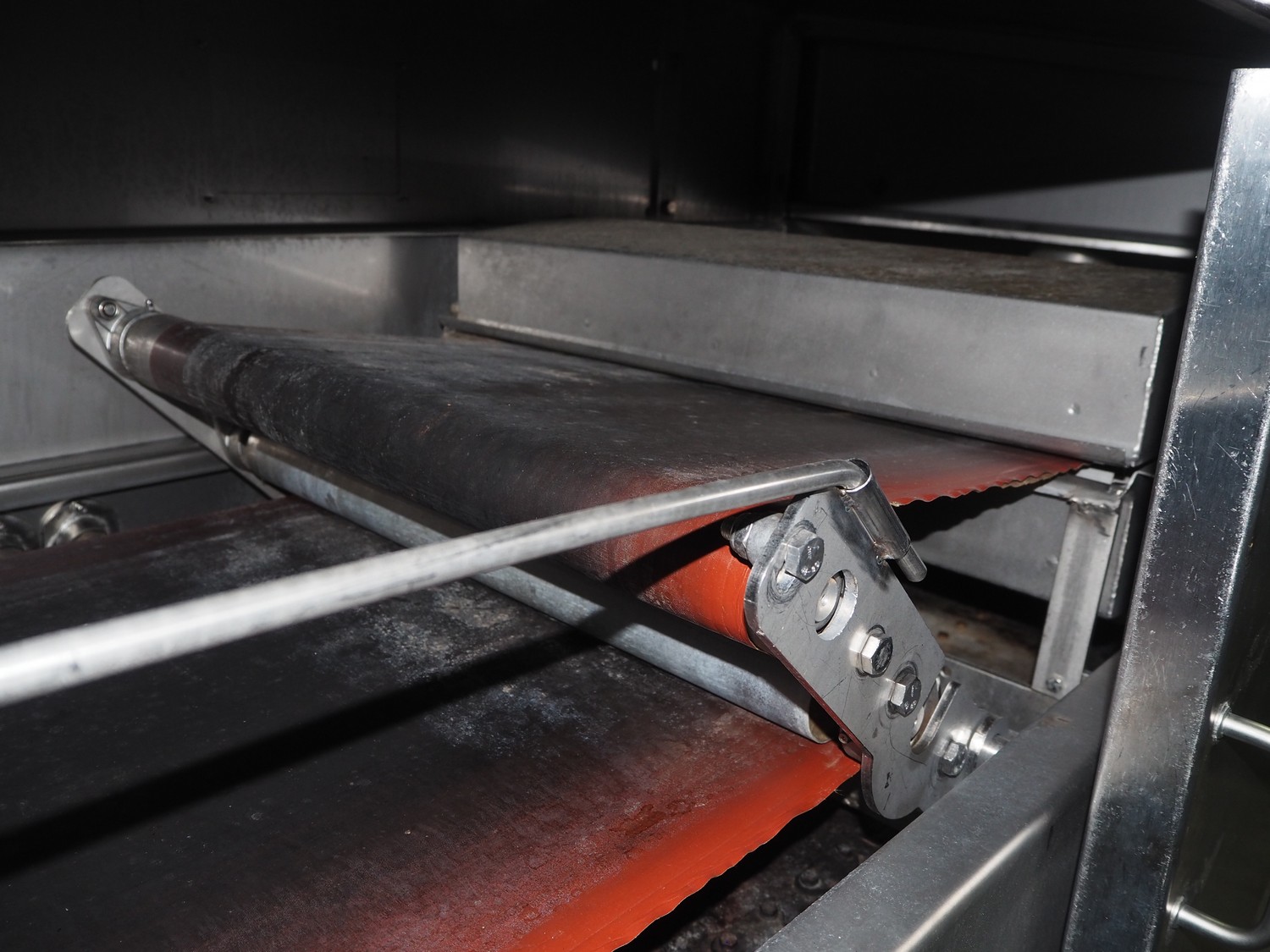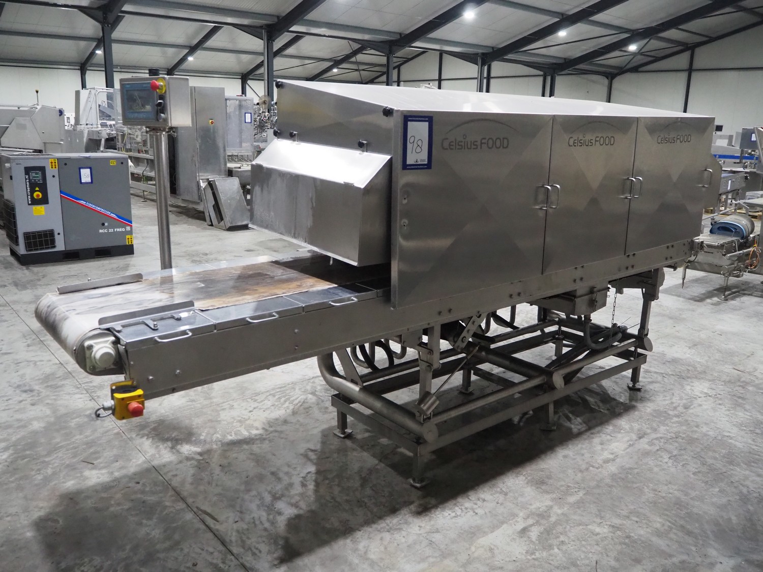 Celsiusfood teflon grill belt, belt width: (1x) 545 mm, (1x) 560 mm, clearance: 545 mm x 115 mm, electric heated, total dimensions: 4000 mm x 1350 mm x 1860 mm.