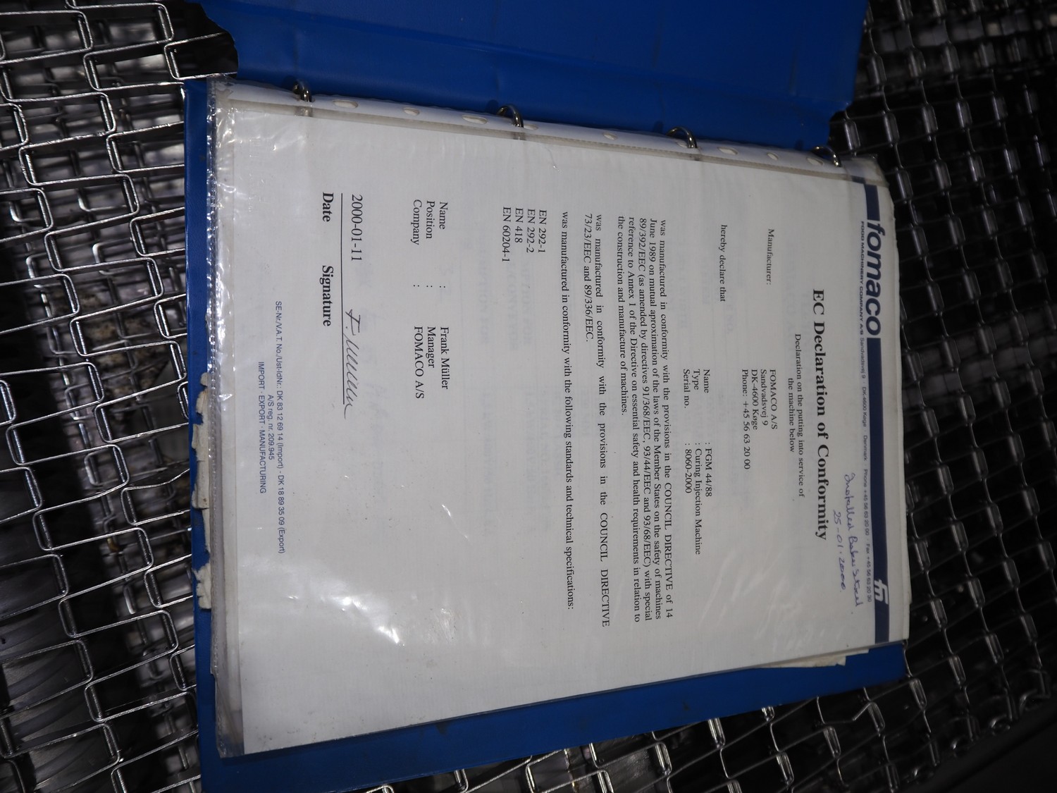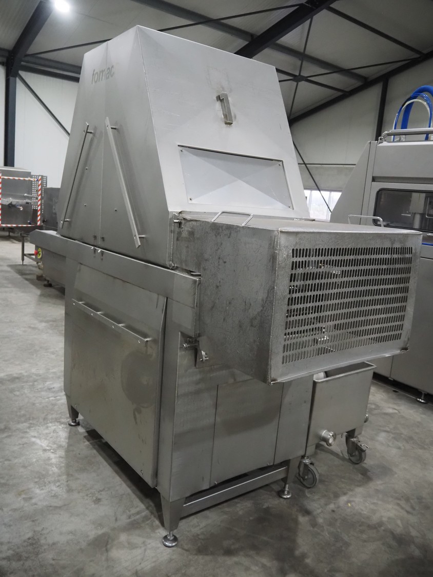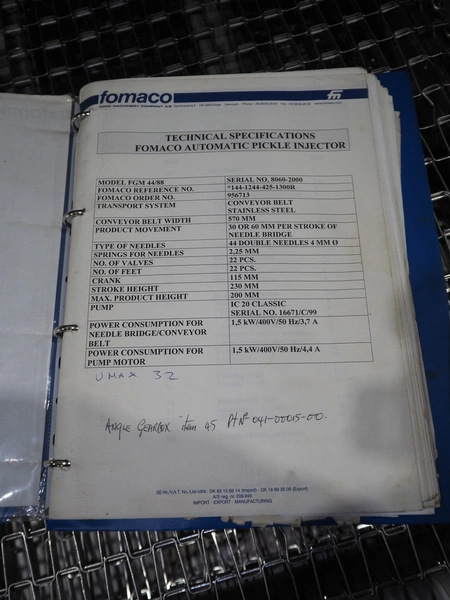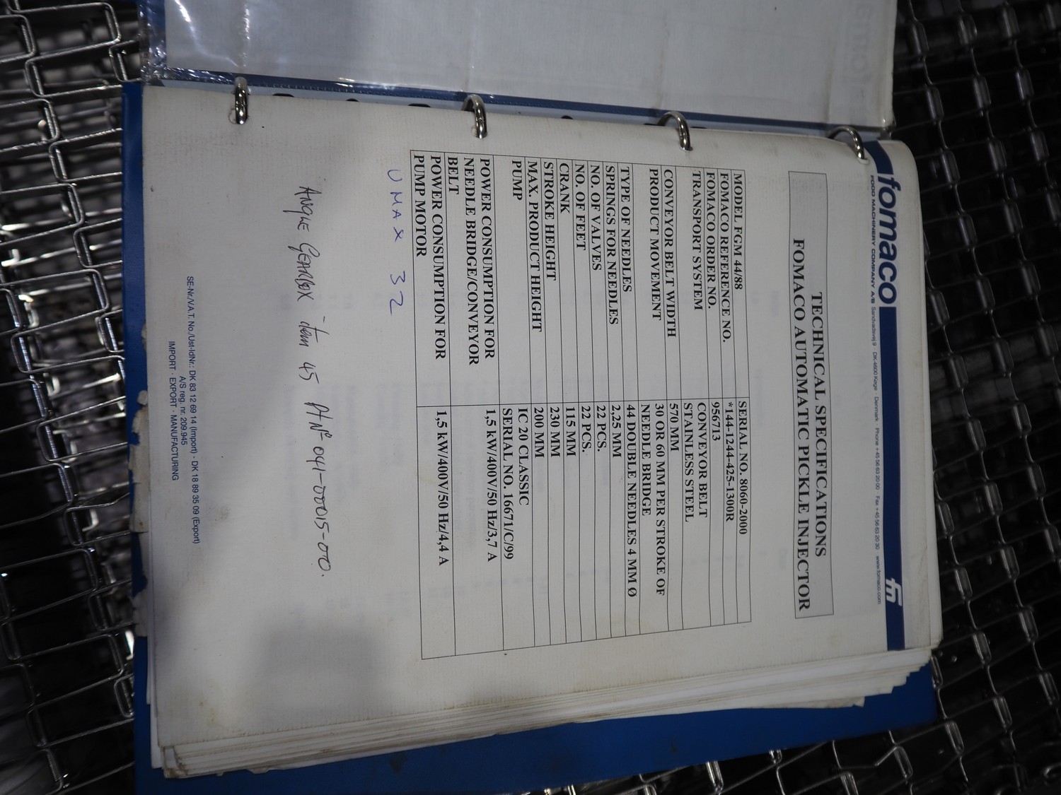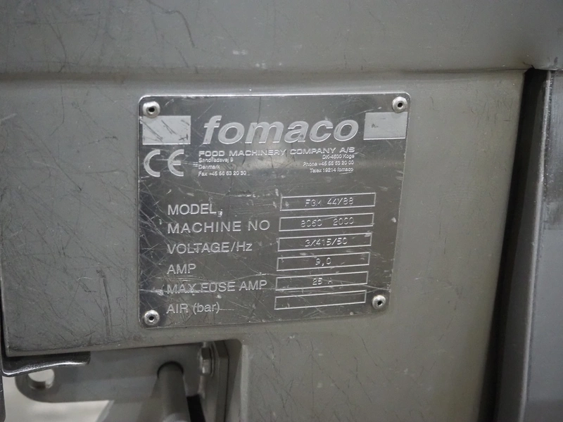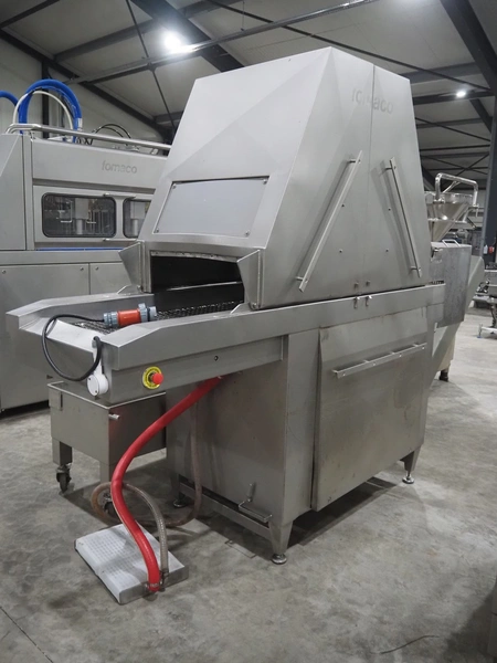 Fomaco injector, model: FGM 44/88, machine number: 8060 2000, year of construction: 2000, 3x415 V, 50 Hz, 9.0/25.0 A, s/s mesh belt, belt width: 550 mm, clearance: 560 mm x 200 mm, total dimensions injector: 2700 mm x 980 mm x 2280 mm, including Fomaco A/S mobile filter tub, dimensions: 1700 mm x 600 mm x 630 mm. Filter tub is incomplete.