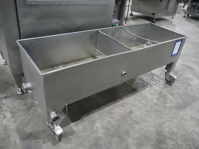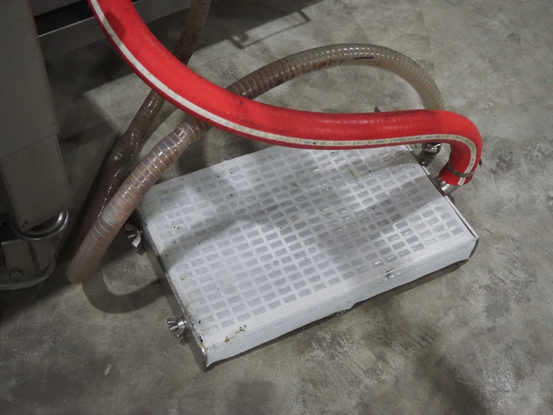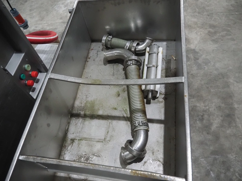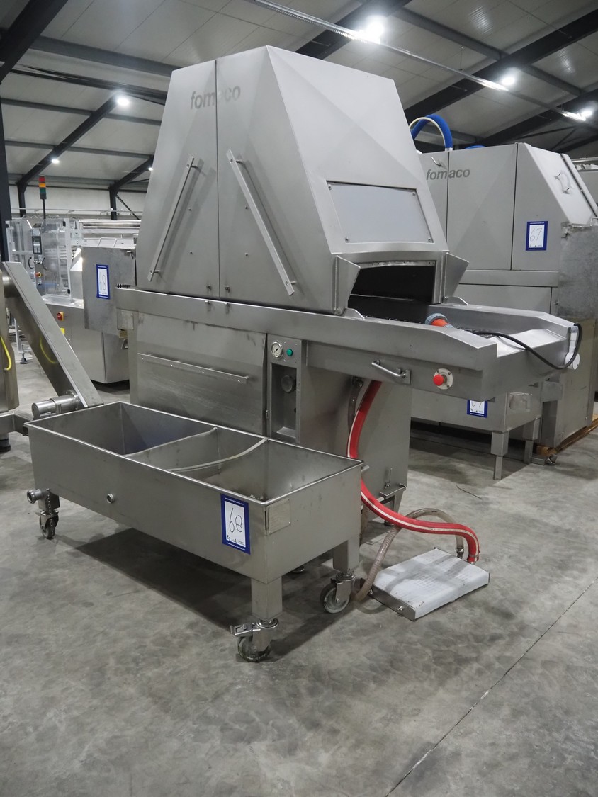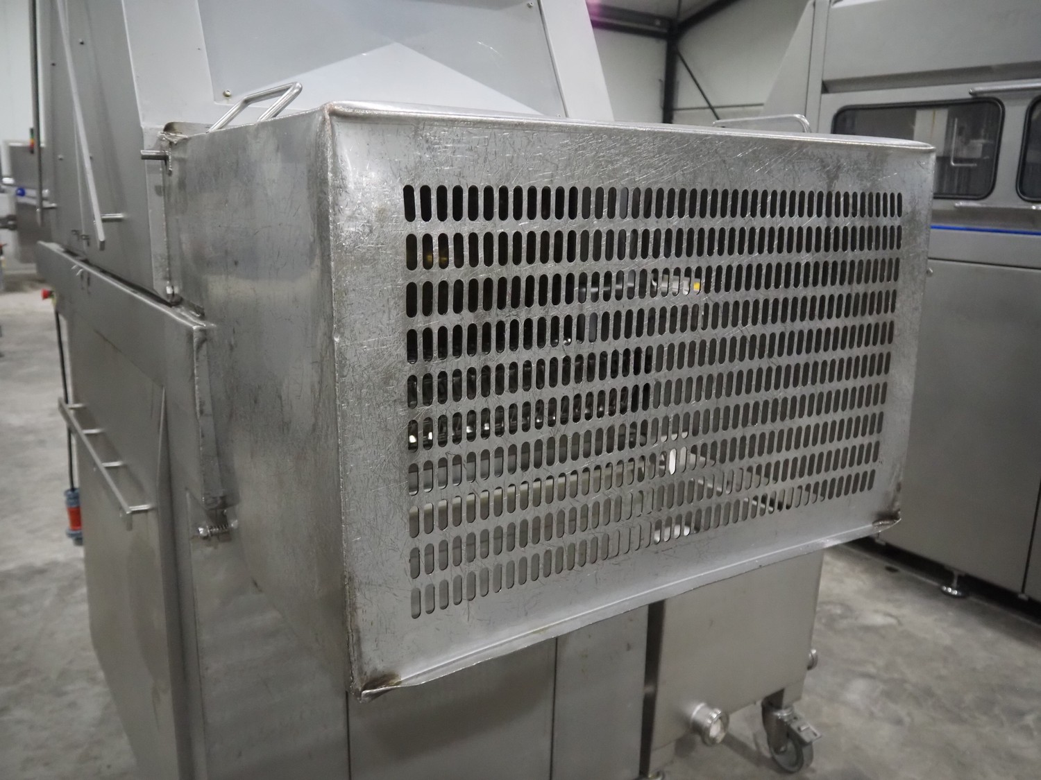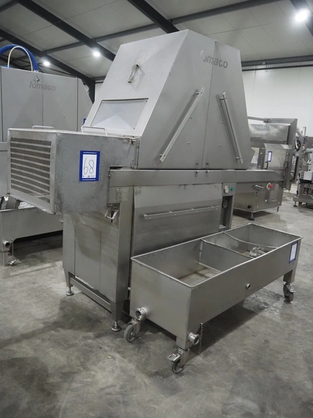 Fomaco injector, model: FGM 44/88, machine number: 8060 2000, year of construction: 2000, 3x415 V, 50 Hz, 9.0/25.0 A, s/s mesh belt, belt width: 550 mm, clearance: 560 mm x 200 mm, total dimensions injector: 2700 mm x 980 mm x 2280 mm, including Fomaco A/S mobile filter tub, dimensions: 1700 mm x 600 mm x 630 mm. Filter tub is incomplete.