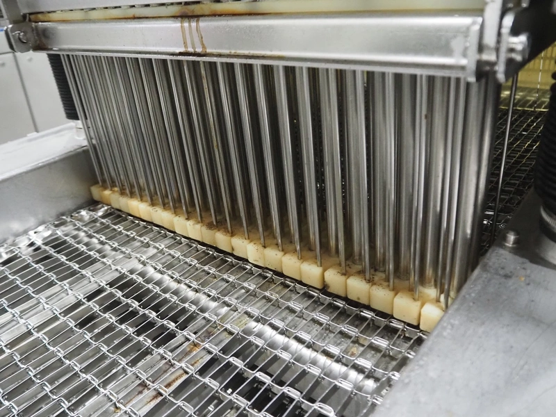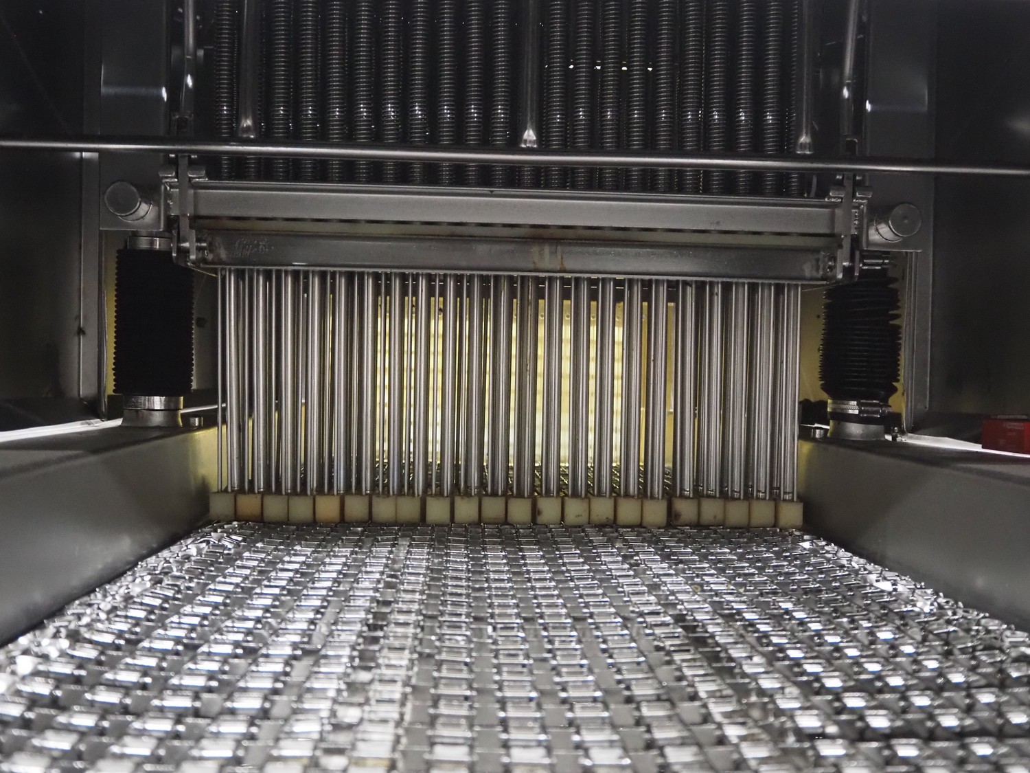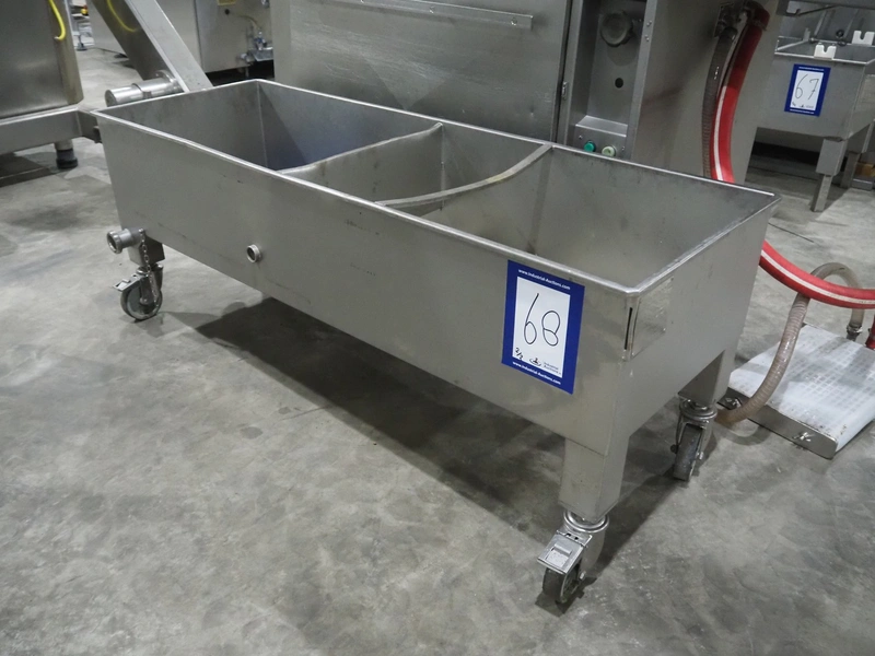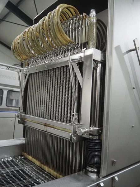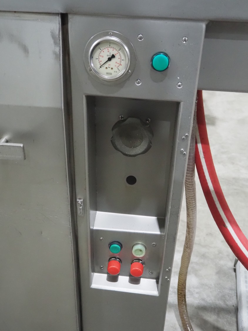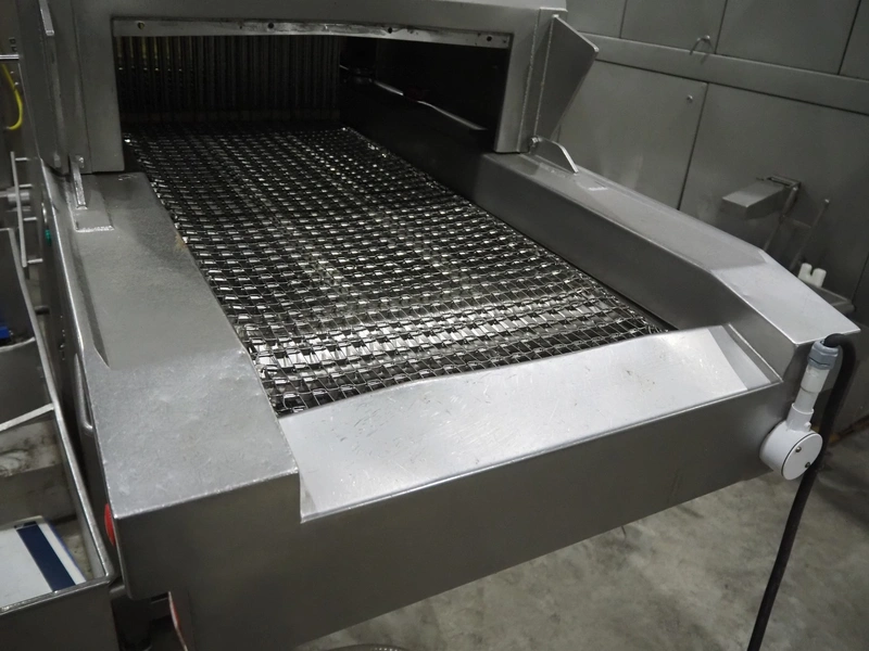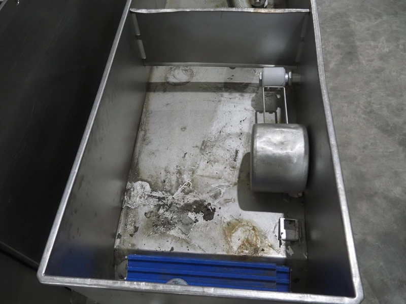 Fomaco injector, model: FGM 44/88, machine number: 8060 2000, year of construction: 2000, 3x415 V, 50 Hz, 9.0/25.0 A, s/s mesh belt, belt width: 550 mm, clearance: 560 mm x 200 mm, total dimensions injector: 2700 mm x 980 mm x 2280 mm, including Fomaco A/S mobile filter tub, dimensions: 1700 mm x 600 mm x 630 mm. Filter tub is incomplete.