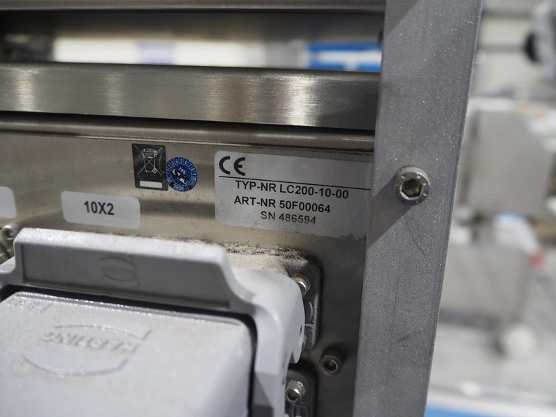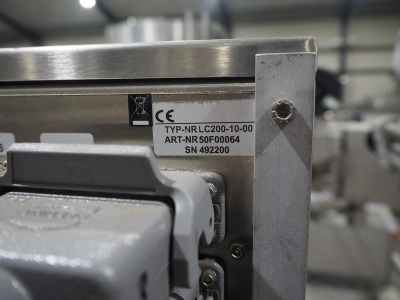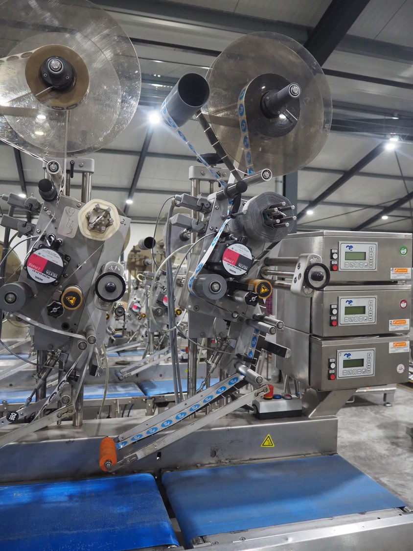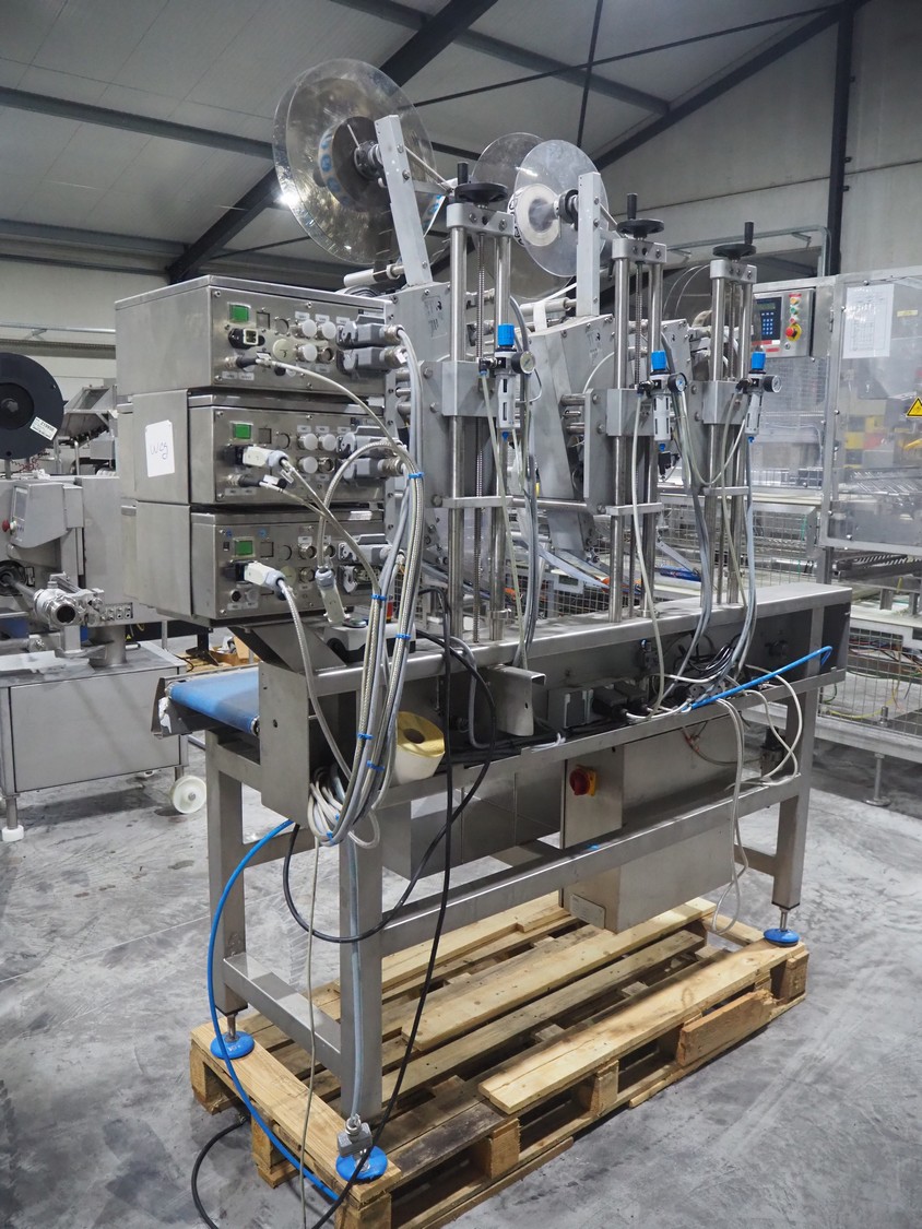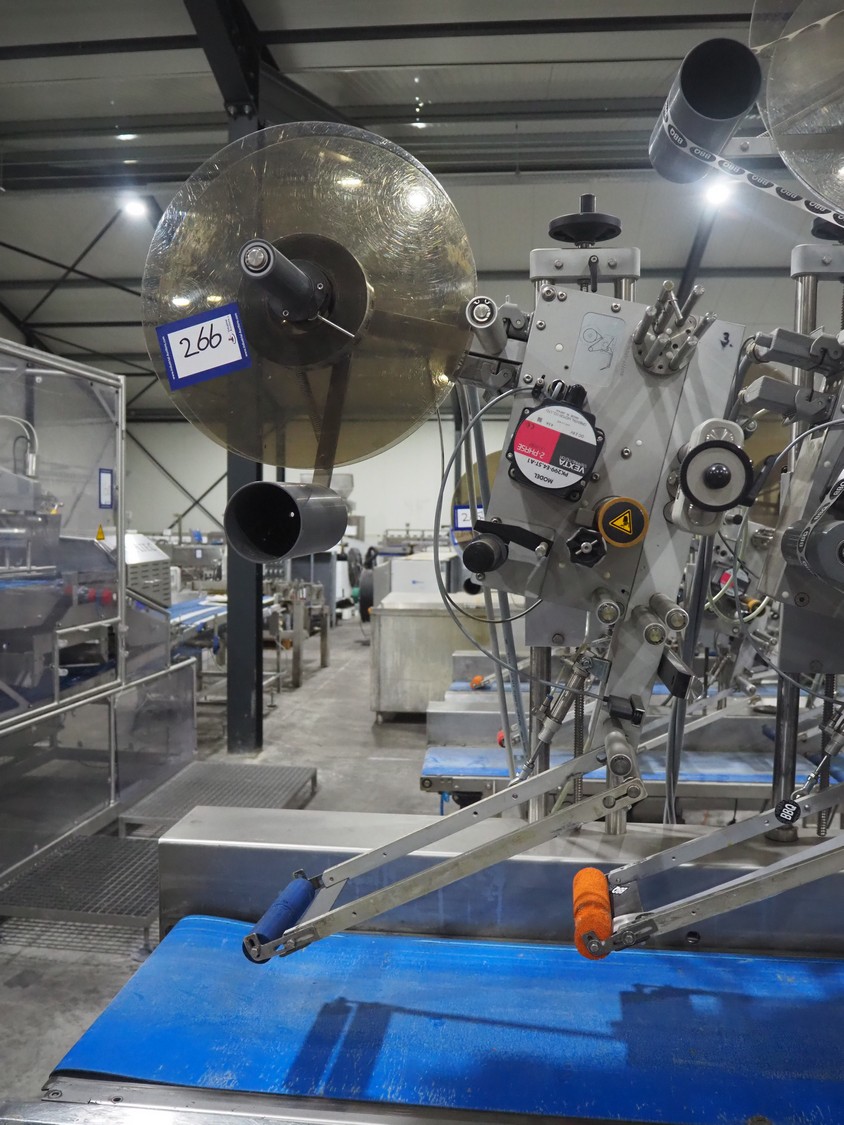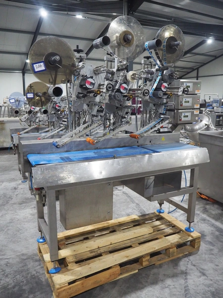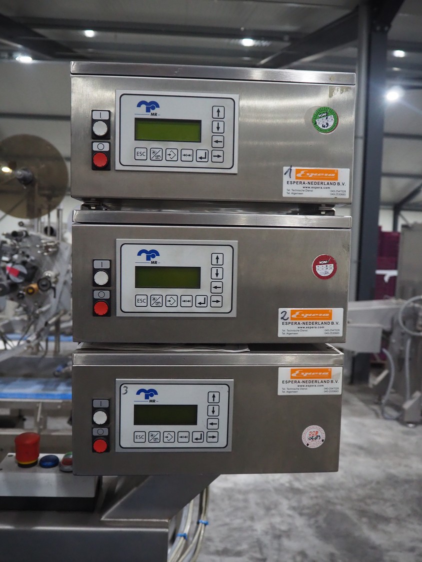 Espera labelling machine with 3 MR Etikettiertechnik labellers, Espera model: ES 7000, labeller type: (3x) MR233, year of construction: 2007, 230 V, 50 Hz, maximum label width: 150 mm, plastic belts, belt width: 350 mm, total dimensions: 2000 mm x 750 mm x 2200 mm.
