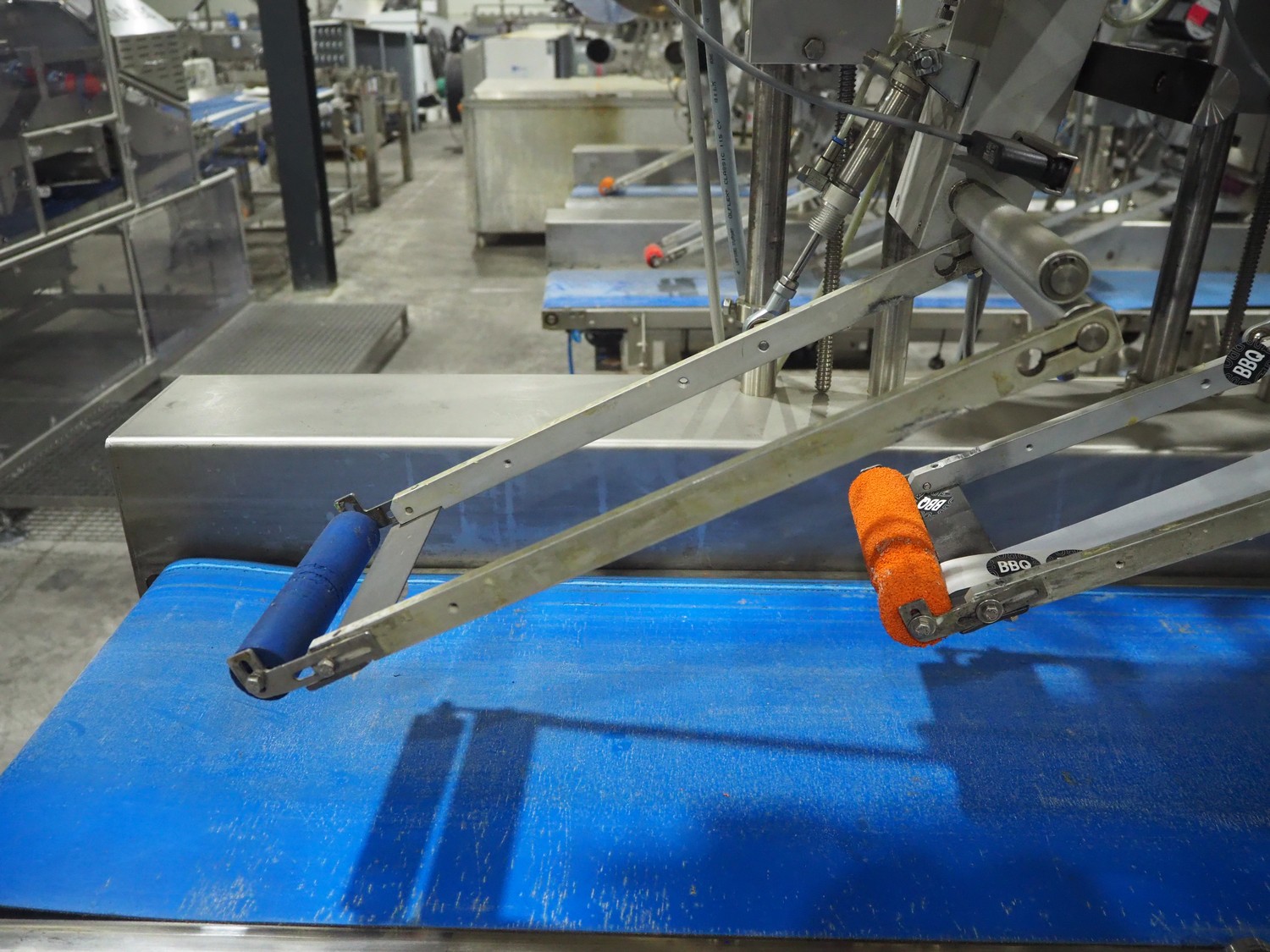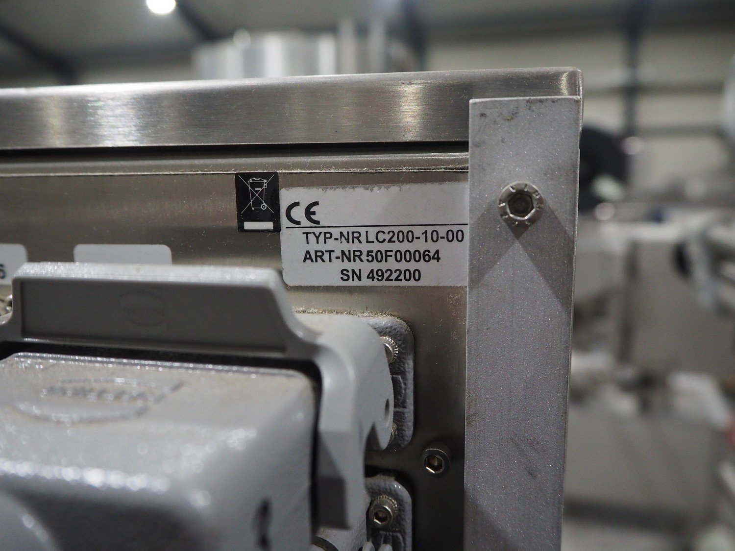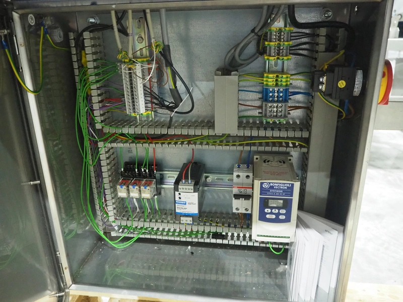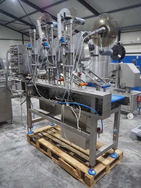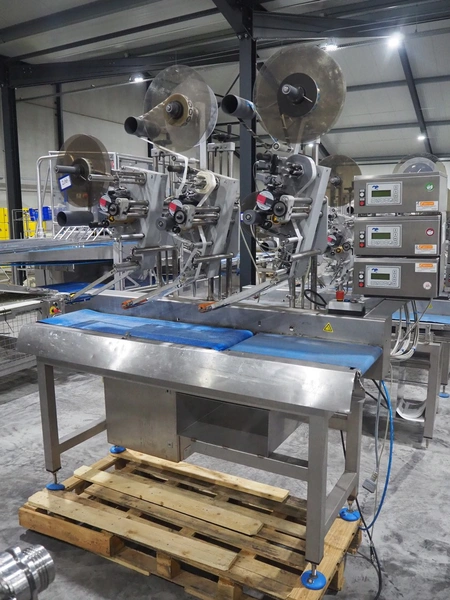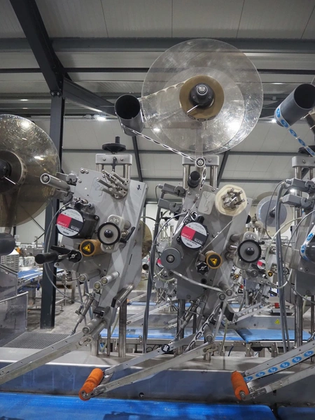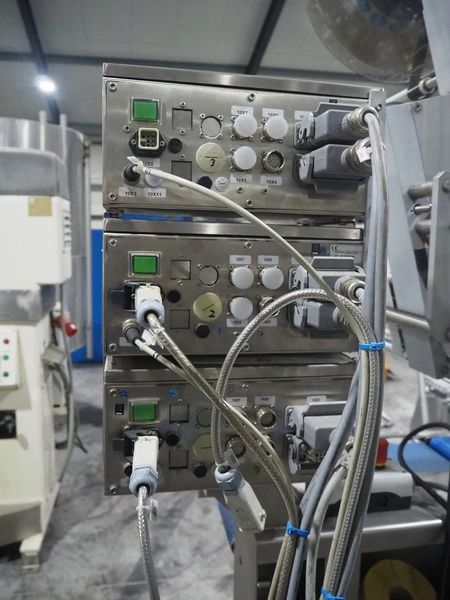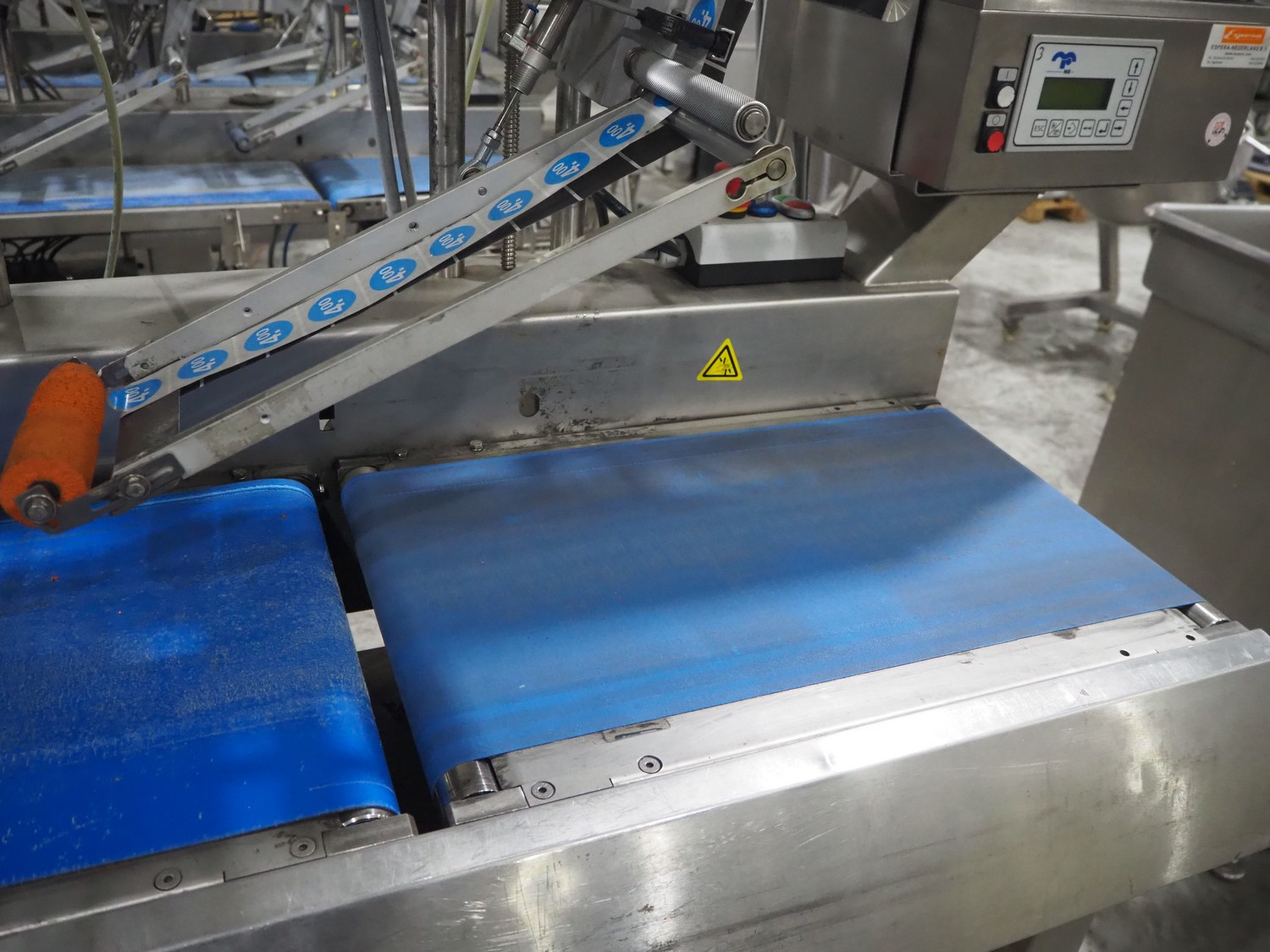 Espera labelling machine with 3 MR Etikettiertechnik labellers, Espera model: ES 7000, labeller type: (3x) MR233, year of construction: 2007, 230 V, 50 Hz, maximum label width: 150 mm, plastic belts, belt width: 350 mm, total dimensions: 2000 mm x 750 mm x 2200 mm.