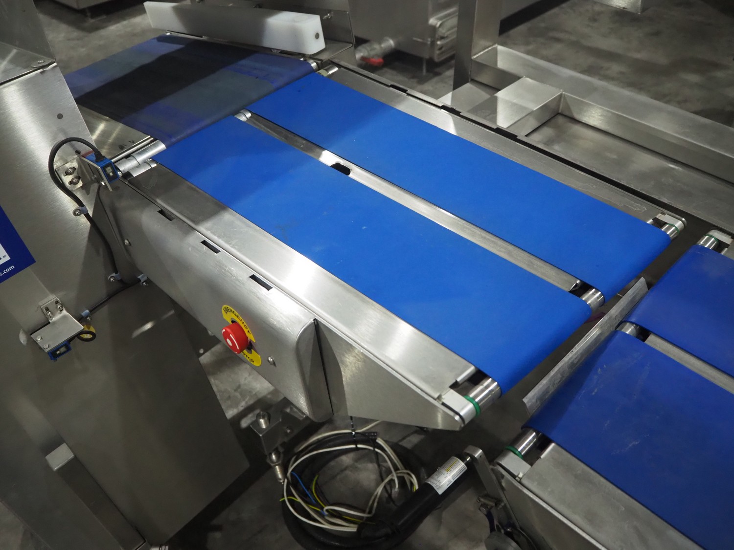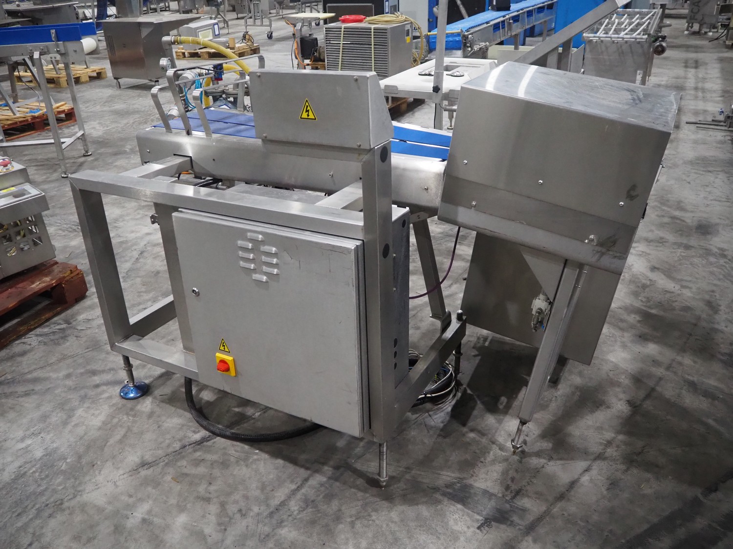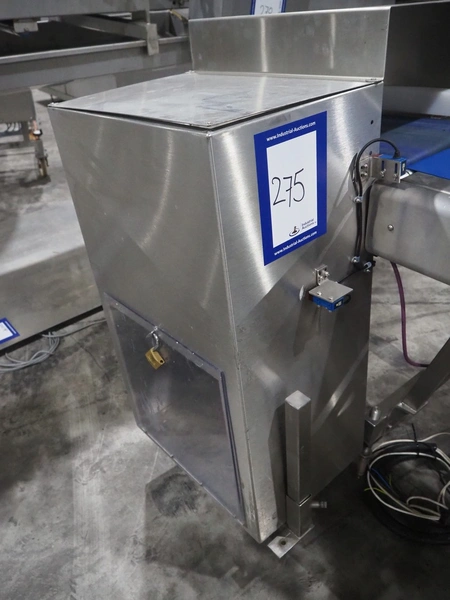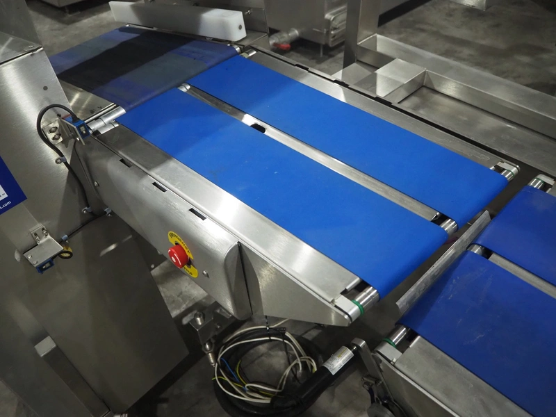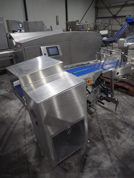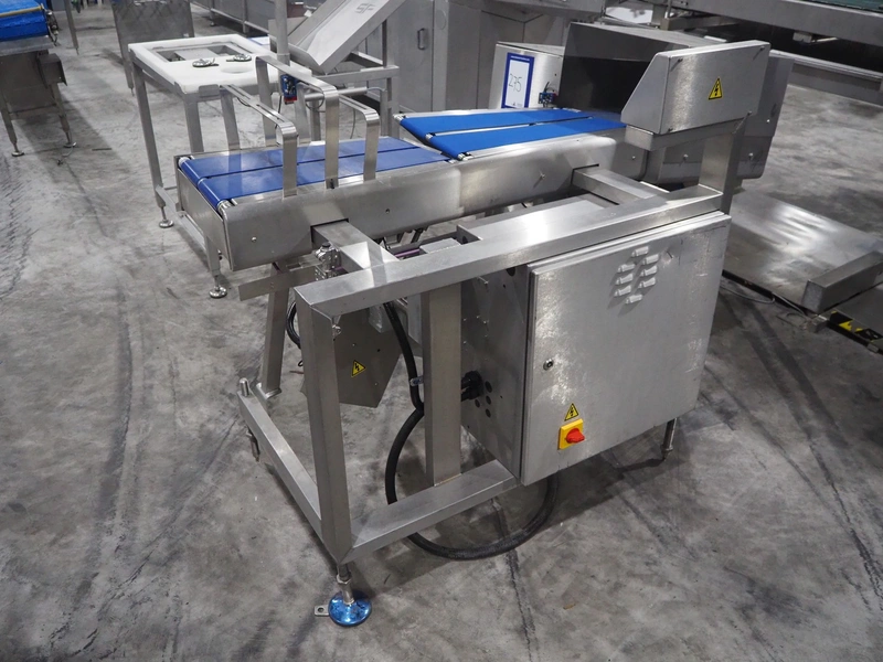 Marel weighing and labelling machine with rejector, plastic belt, belt width: (2x) 136 mm and 285 mm, total dimensions: 1720 mm x 1120 mm x 1220 mm.