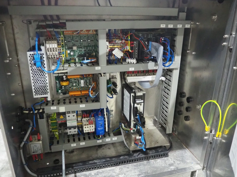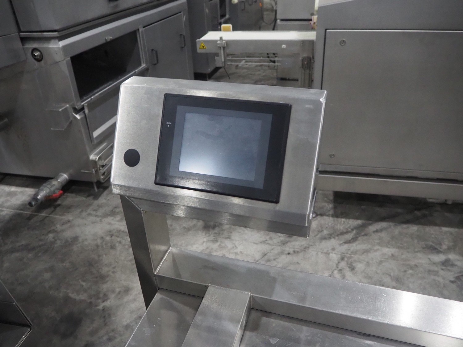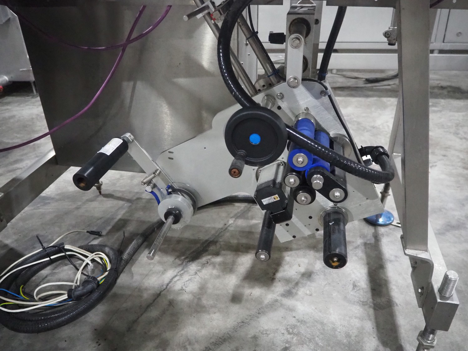 Marel weighing and labelling machine with rejector, plastic belt, belt width: (2x) 136 mm and 285 mm, total dimensions: 1720 mm x 1120 mm x 1220 mm.