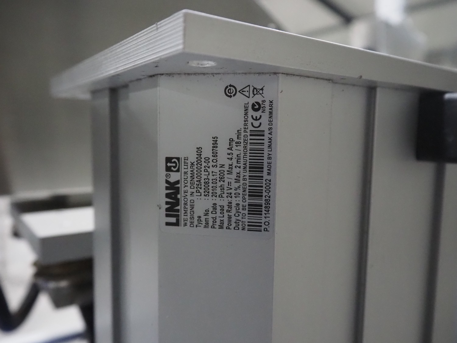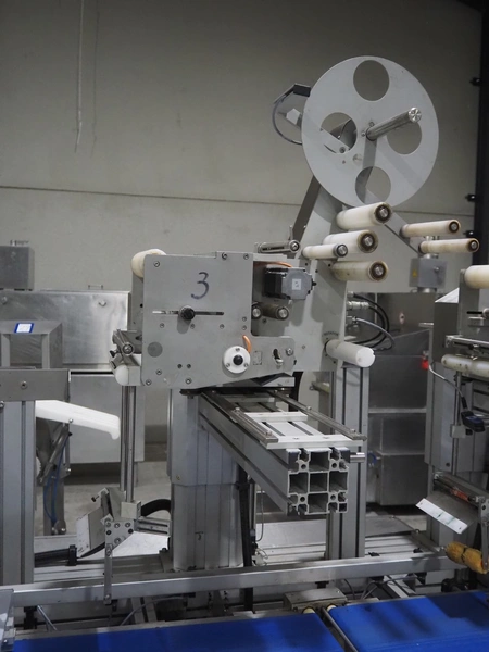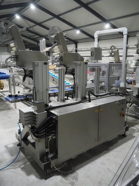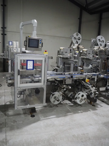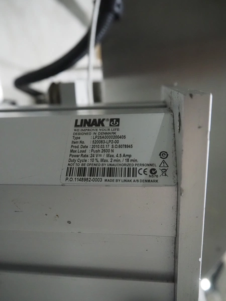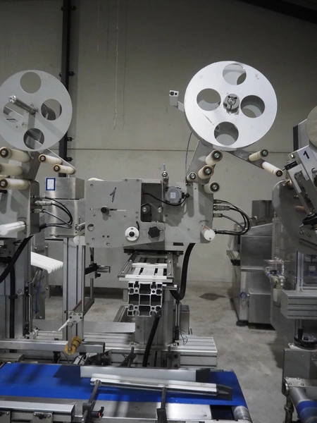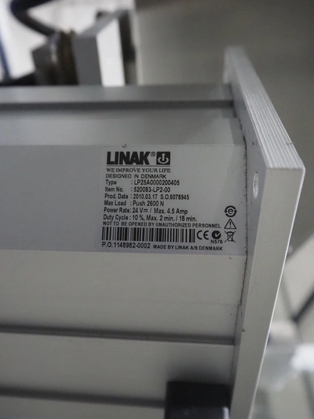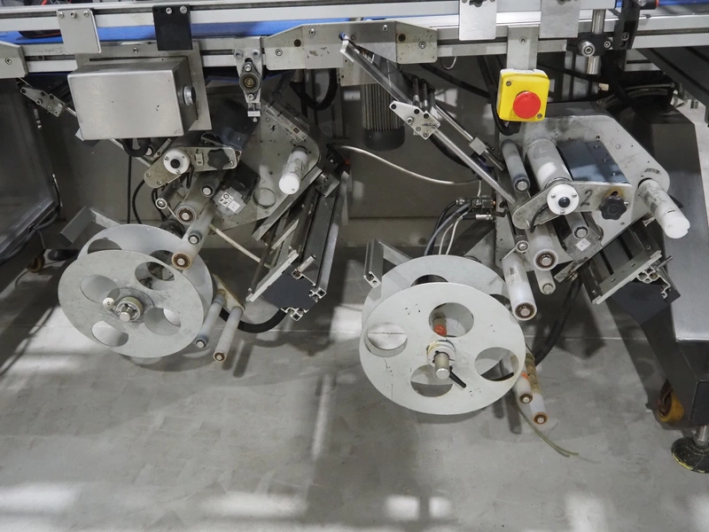 Linak A/S labeller with double top and double bottom labeller, type: LP25A0000200405, plastic belt, belt width: 285 mm, total dimensions: 2600 mm x 1200 mm x 2010 mm. Technical condition unknown.