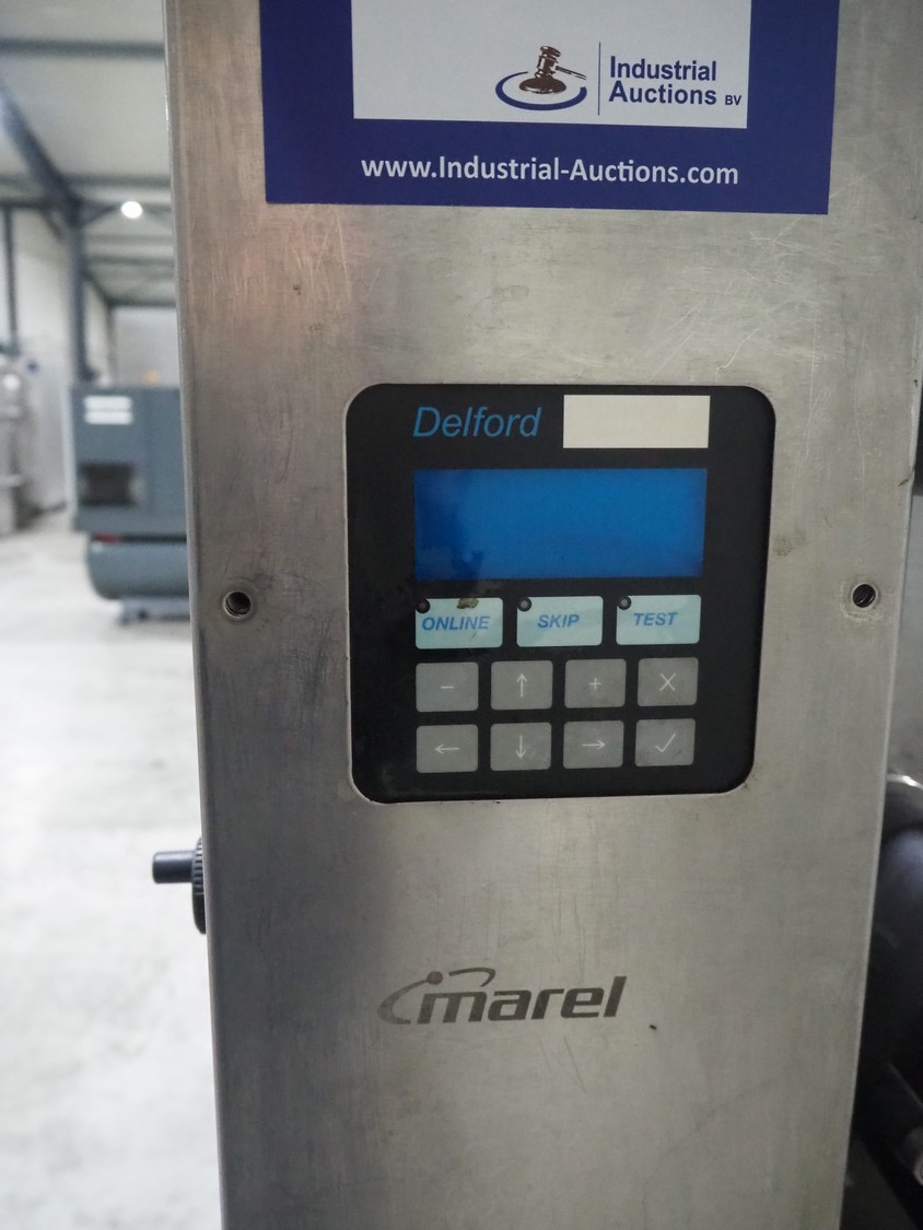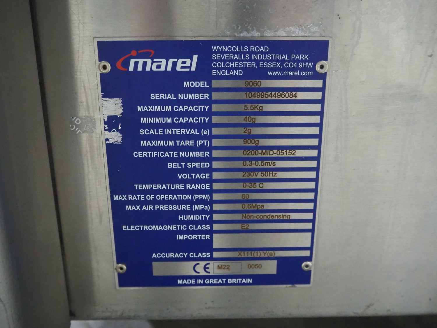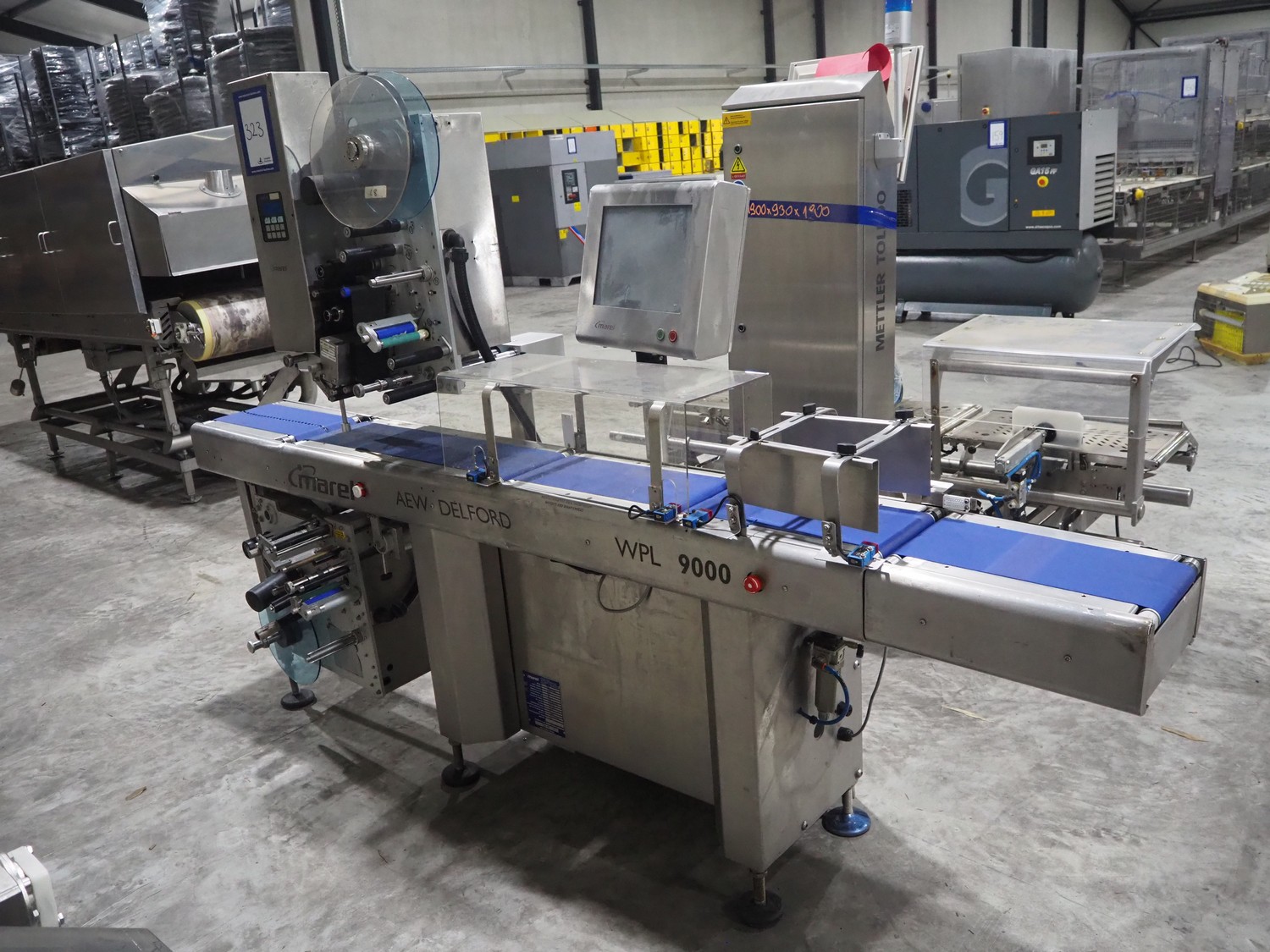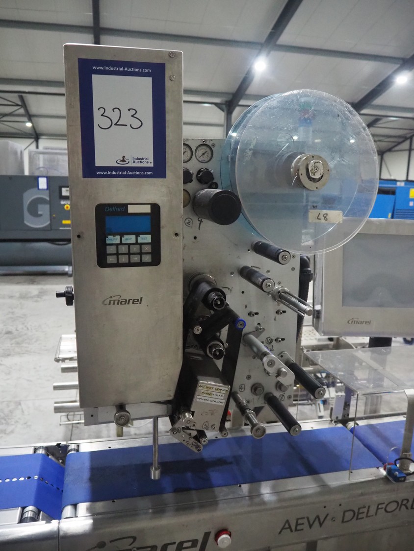 Marel / AEW Delford weighing and labelling machine, model: 9060, serial number: 1049954496084, Max capacity: 5.5 kg, 230 V, 50 Hz, belt speed: 0.3-0.5 m/s, plastic belt, belt width: 195 mm, total dimensions: 2600 mm x 650 mm x 1780 mm.